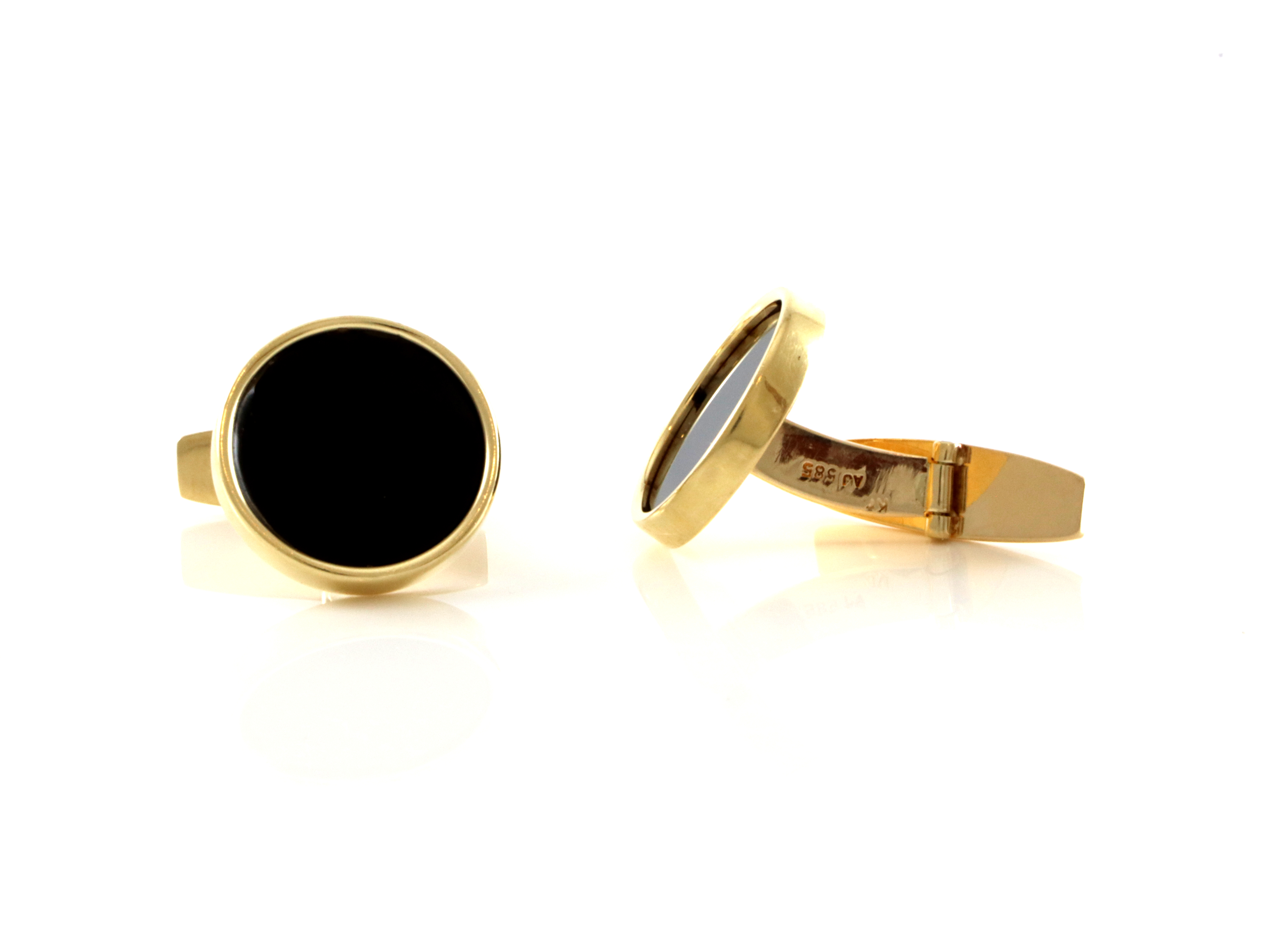 Svært stilige mansjettknapper med onyx i 14 K gull fra Arne Johansen, Danmark Diameter: 17 mm Vekt: 10,6 gram Svært pent brukte. Noe synlig lim på den ene knappen