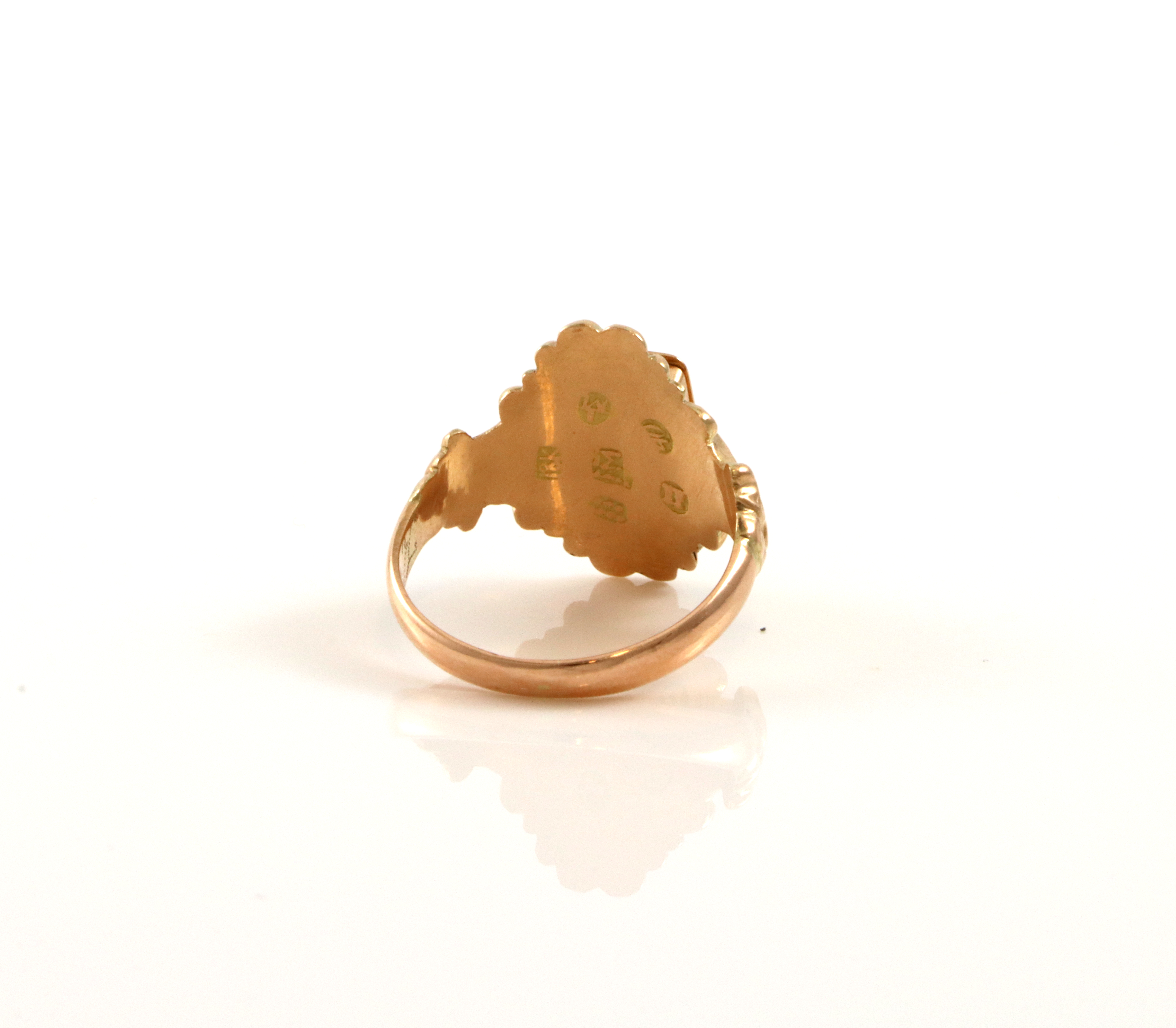 Svært spesiell ring fra Bergen med "oppbevaringsrom". Produsert i januar 1840 Fullstemplet Str krone: 17 x 17 mm Ringstr: 56,5 Vekt:3,5 gram Prikkgravert monogram inne i skinna Ringen er stemplet 18 K men på røntgenmaskin tester den som 16-17 K gull
