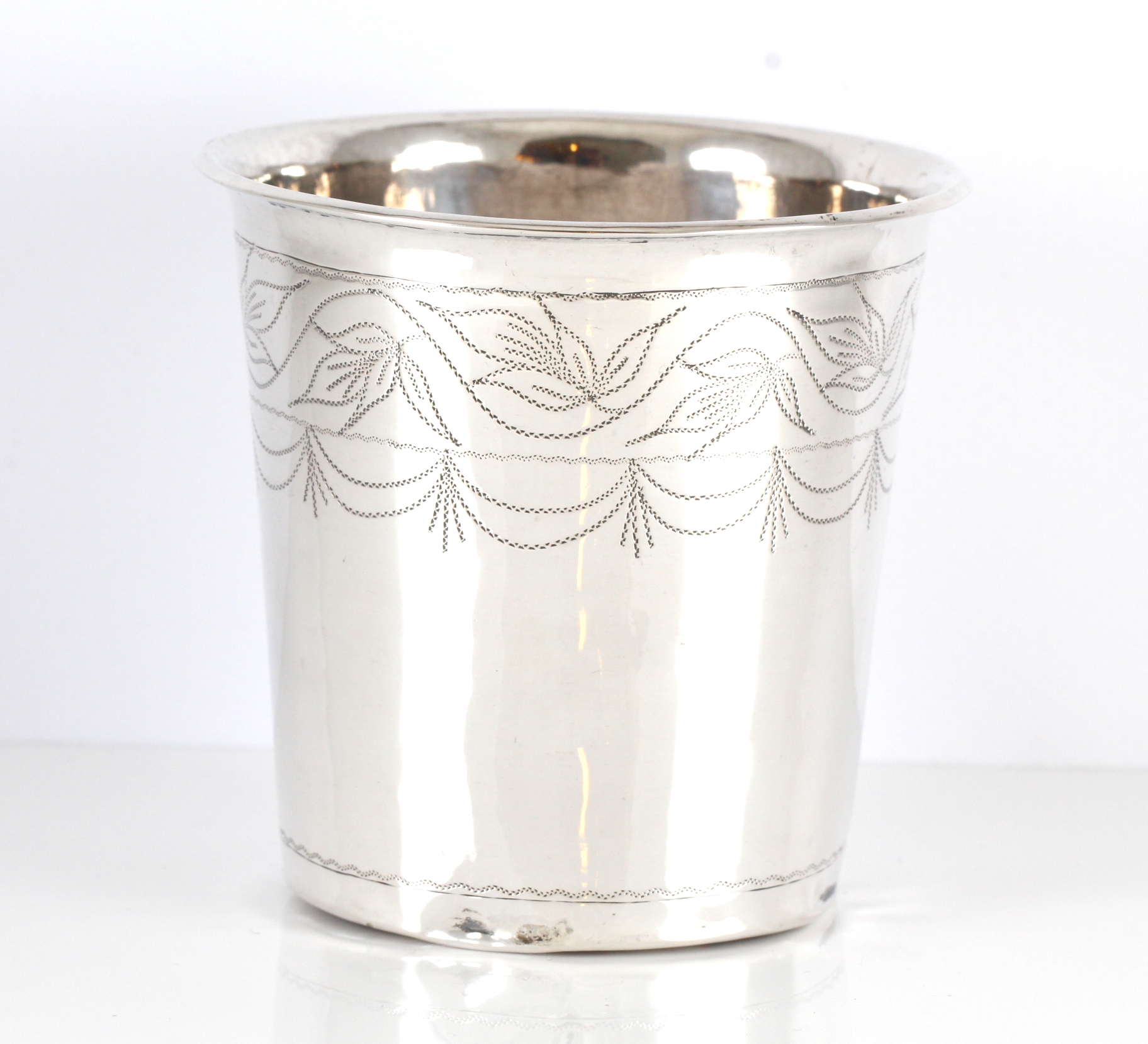 Begeret har punktgravert dekor samt initialer vi mener er "BMD". Begeret har noen bulker, spesielt nede ved foten. Men alt i alt et fantastisk flott beger som har bekket 220 år.