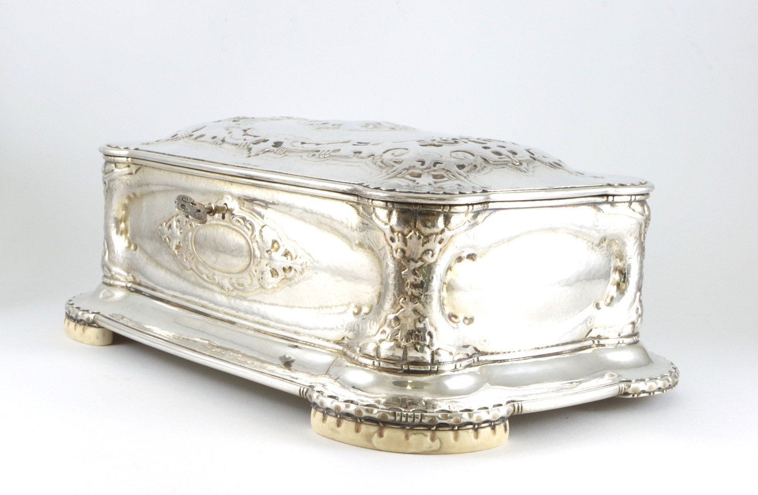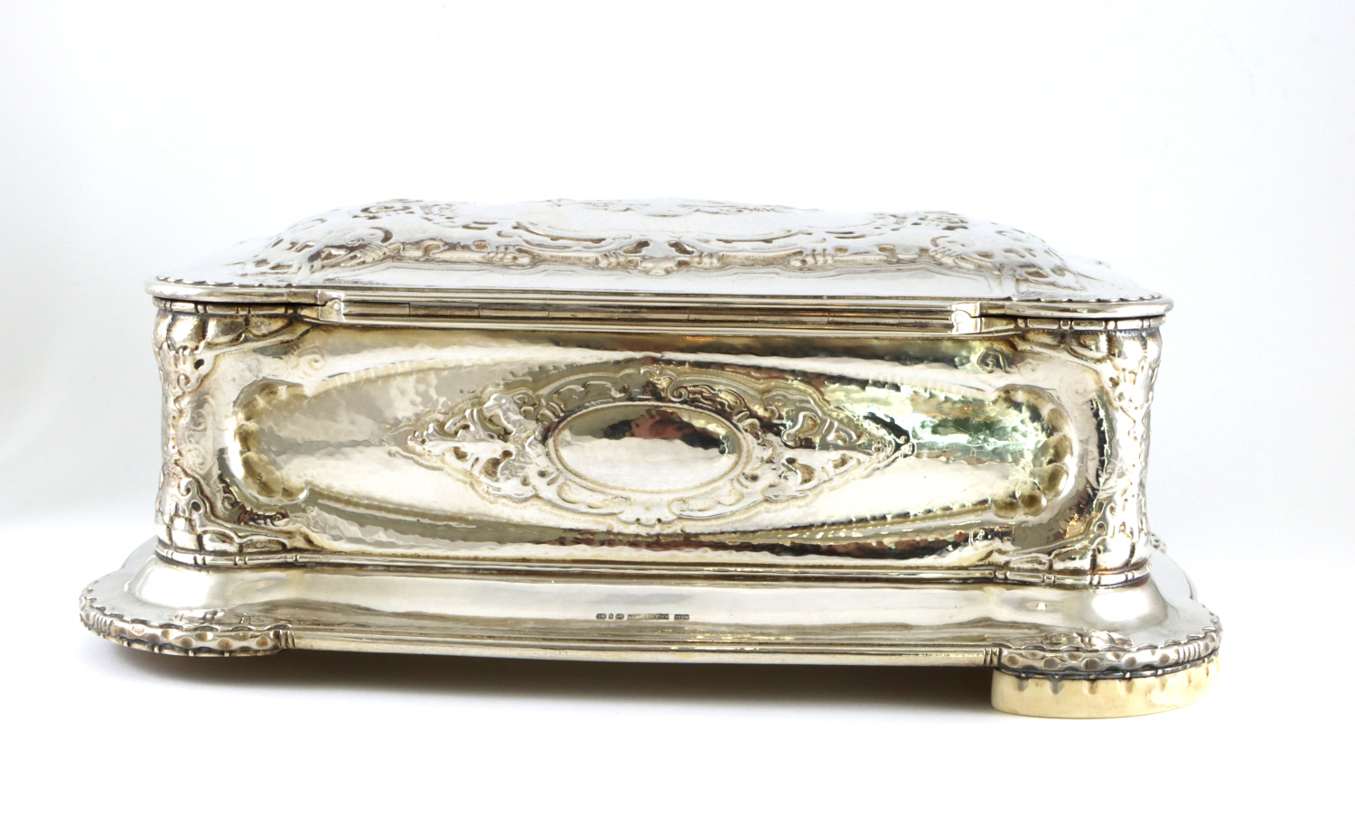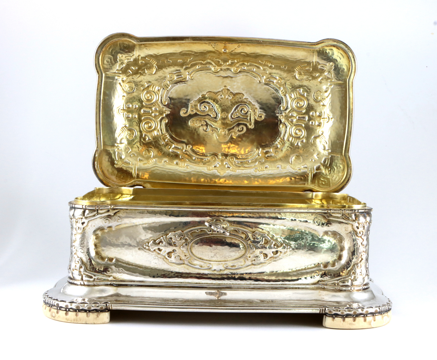Et helt fantastisk skrin i sølv. Produsert av David-Andersen i 1920. Hvem som har designet skrinet er for oss ukjent men det er vell naturlig å tenke Ludvig Wittmann eller Johan Sirnes. Skrinet veier over 1550 gram er 8,5 cm høyt, ca 25,0 cm langt og 15 cm bredt. Hamret stil Skrinet har føtter i ben, dessverre mangler en av føttene. Skrinet har funksjonibel lås i sølv, nøkkel følger med. Skrinet har en gravering på undersiden fra 1949.