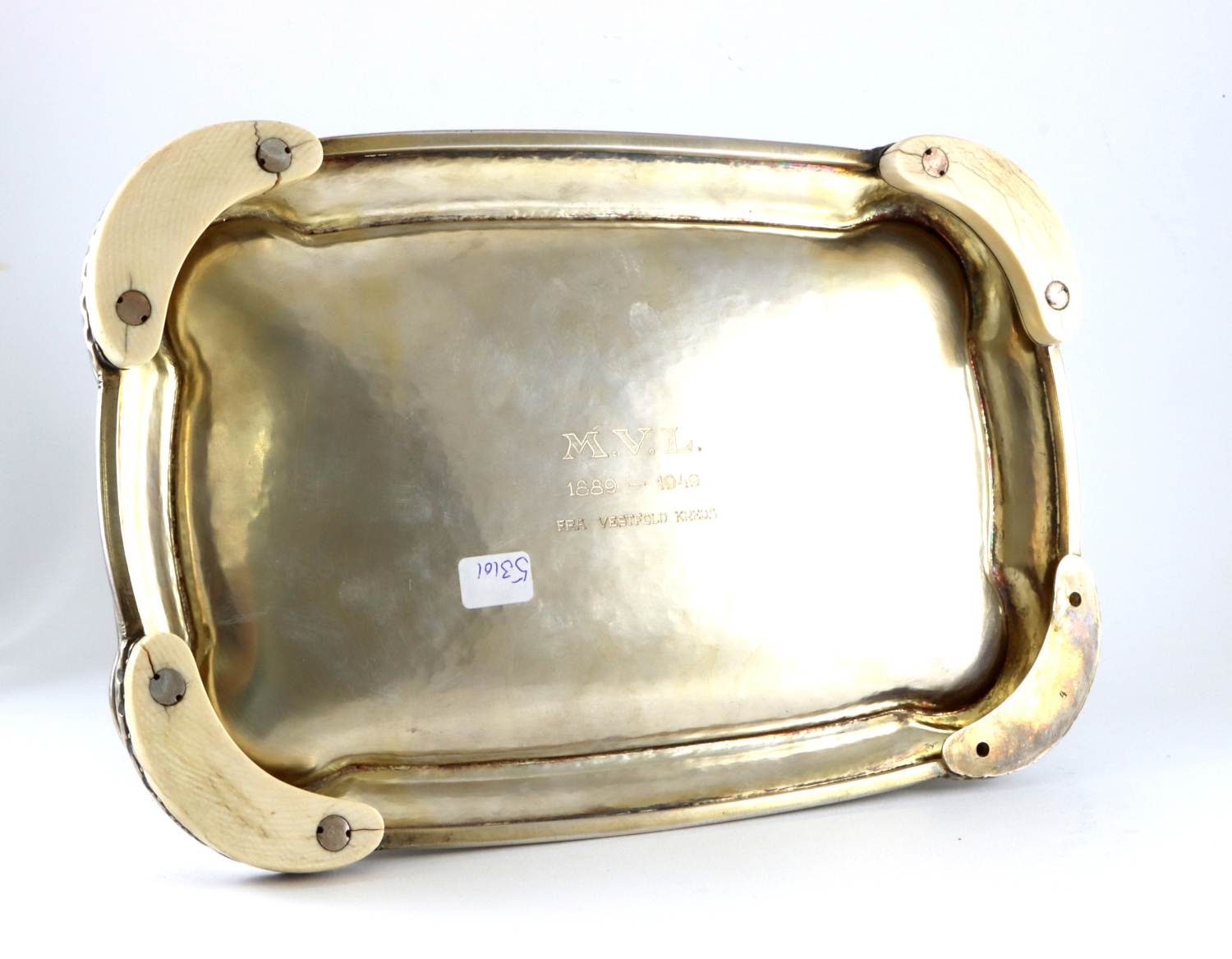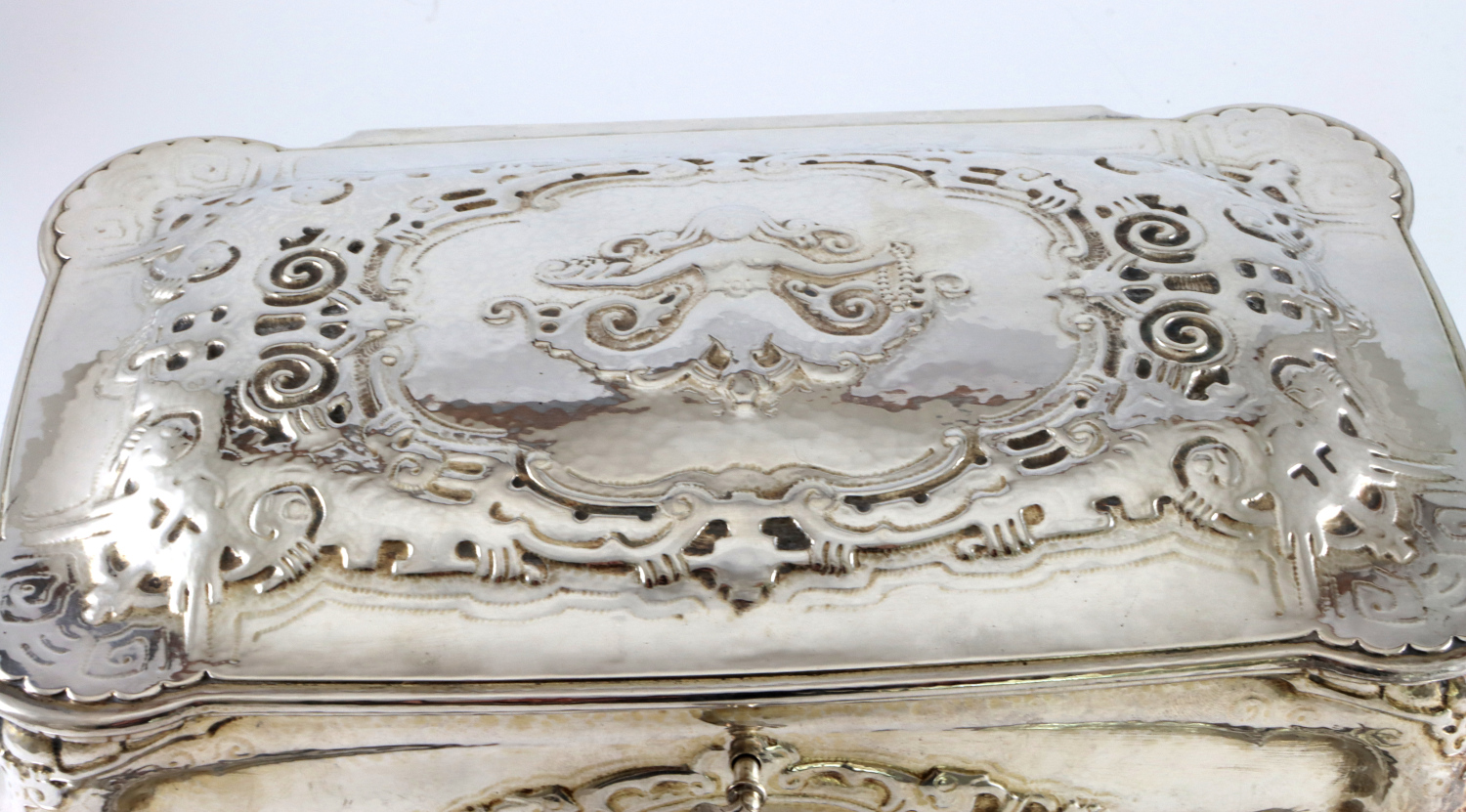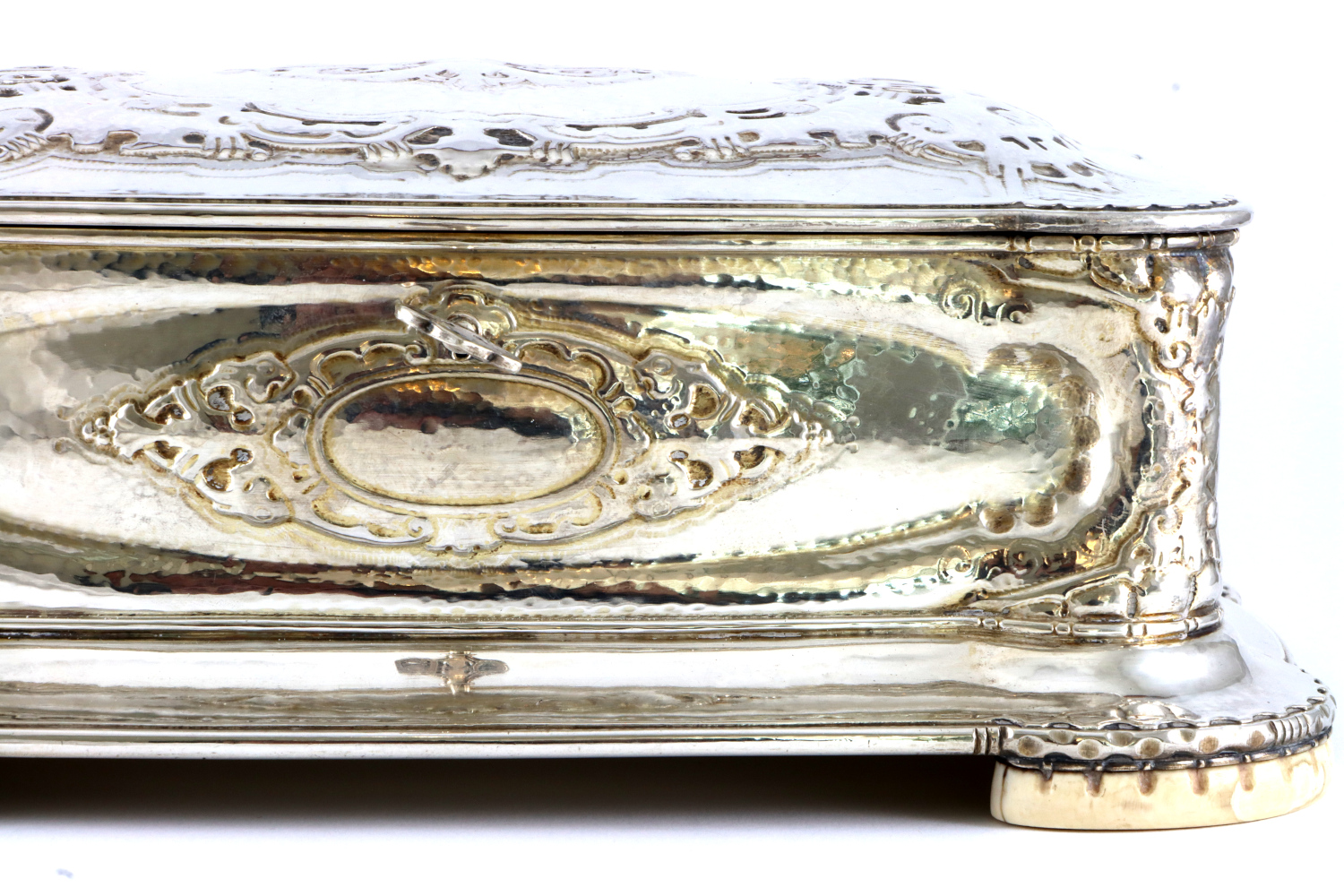 Et helt fantastisk skrin i sølv. Produsert av David-Andersen i 1920. Hvem som har designet skrinet er for oss ukjent men det er vell naturlig å tenke Ludvig Wittmann eller Johan Sirnes. Skrinet veier over 1550 gram er 8,5 cm høyt, ca 25,0 cm langt og 15 cm bredt. Hamret stil Skrinet har føtter i ben, dessverre mangler en av føttene. Skrinet har funksjonibel lås i sølv, nøkkel følger med. Skrinet har en gravering på undersiden fra 1949.