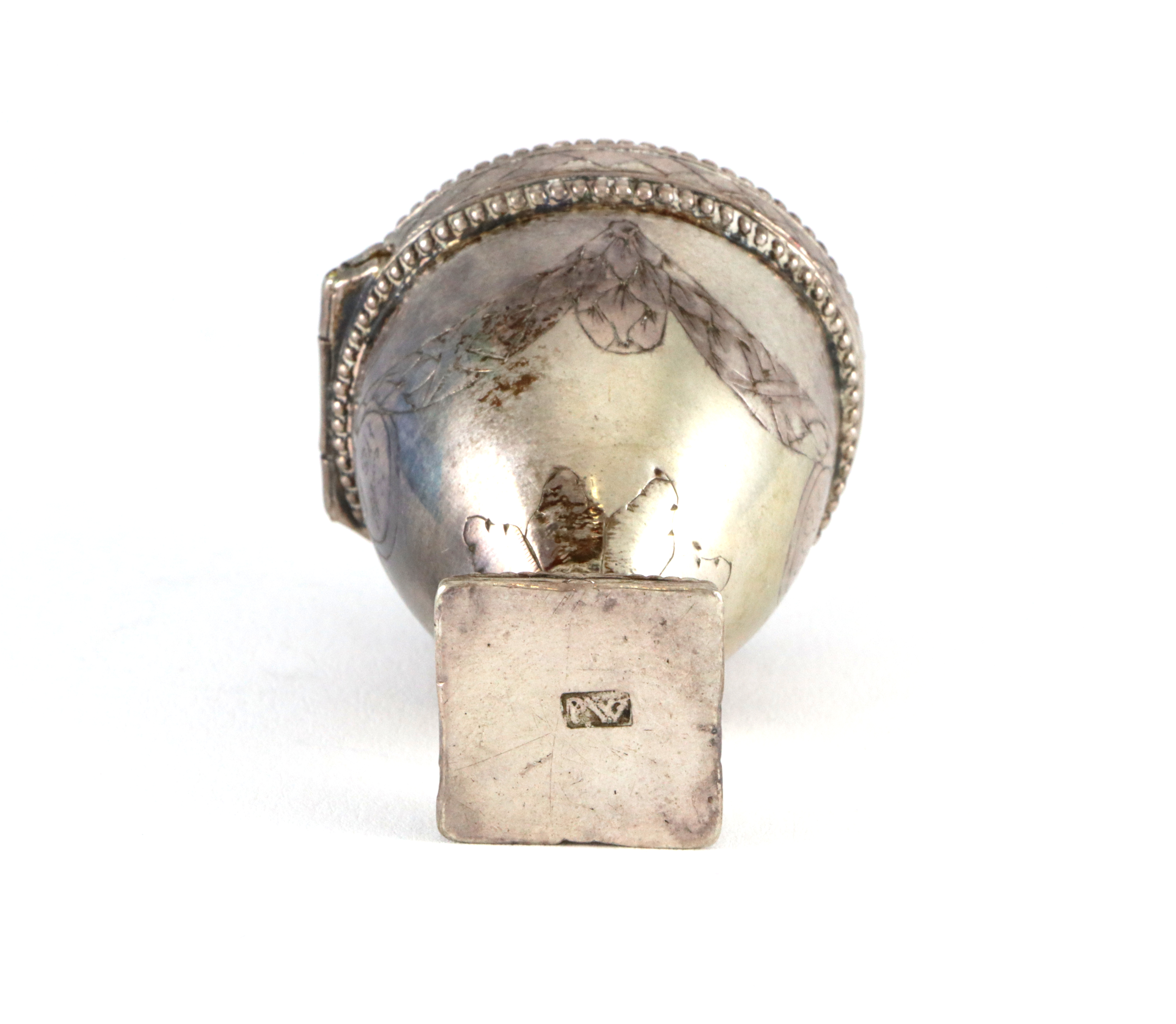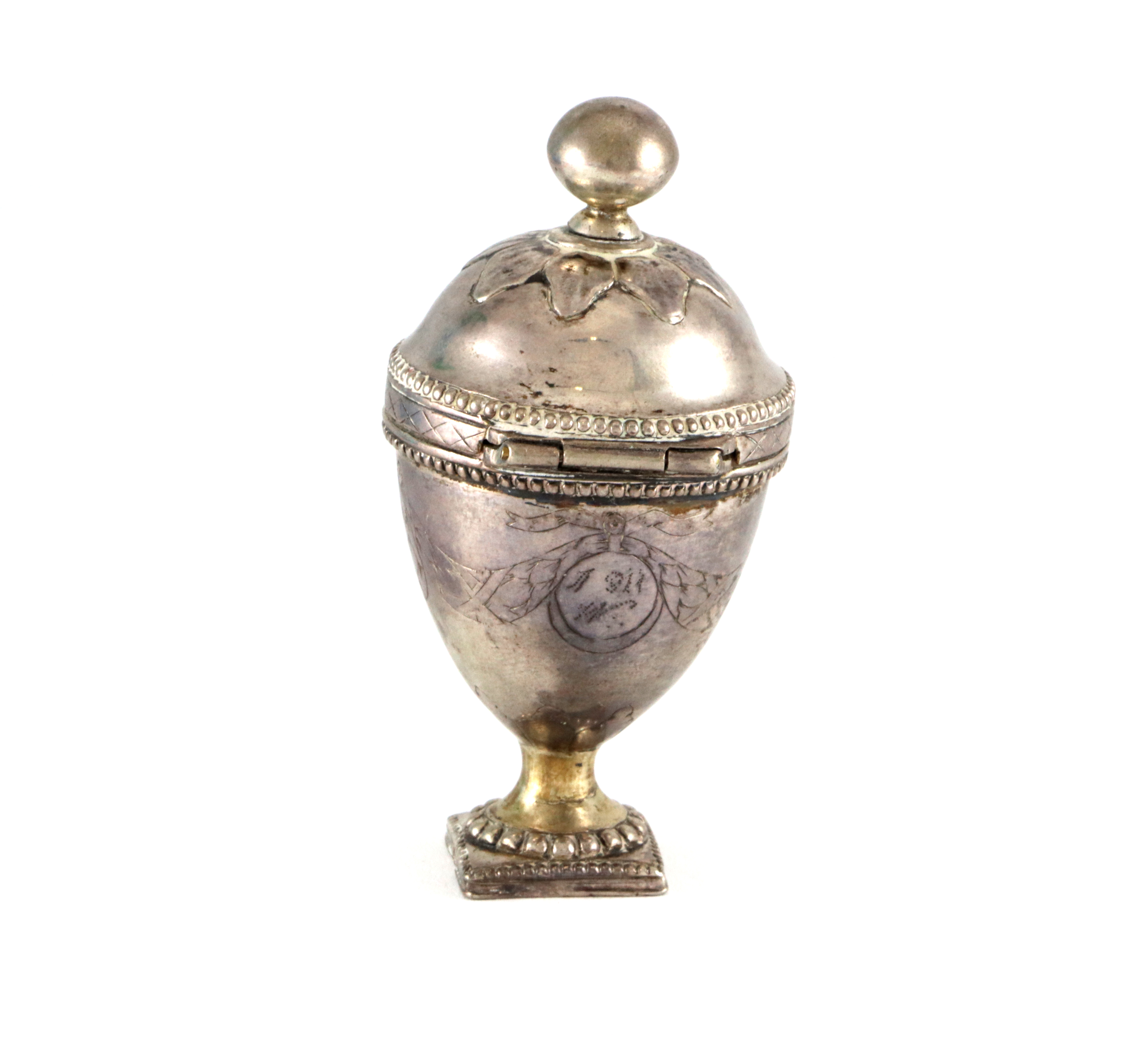 Antikk luktevannshus i sølv produsert av Peder Lorentzen Wichardt. Wichardt var mester i Mandal i perioden 1798-1824. Ca 7,5 cm høyt. Punktgravering av initialer og dato i 1811.