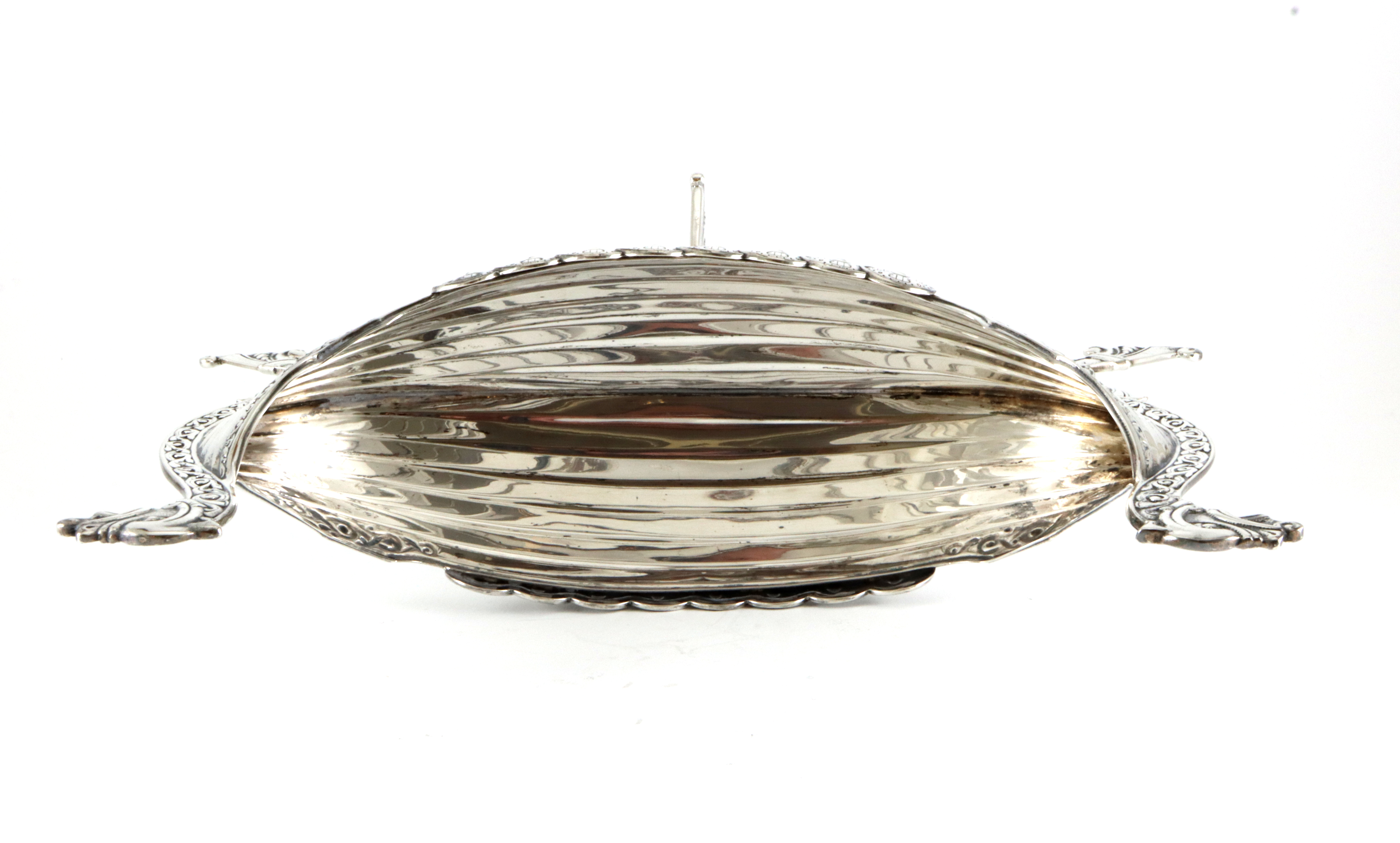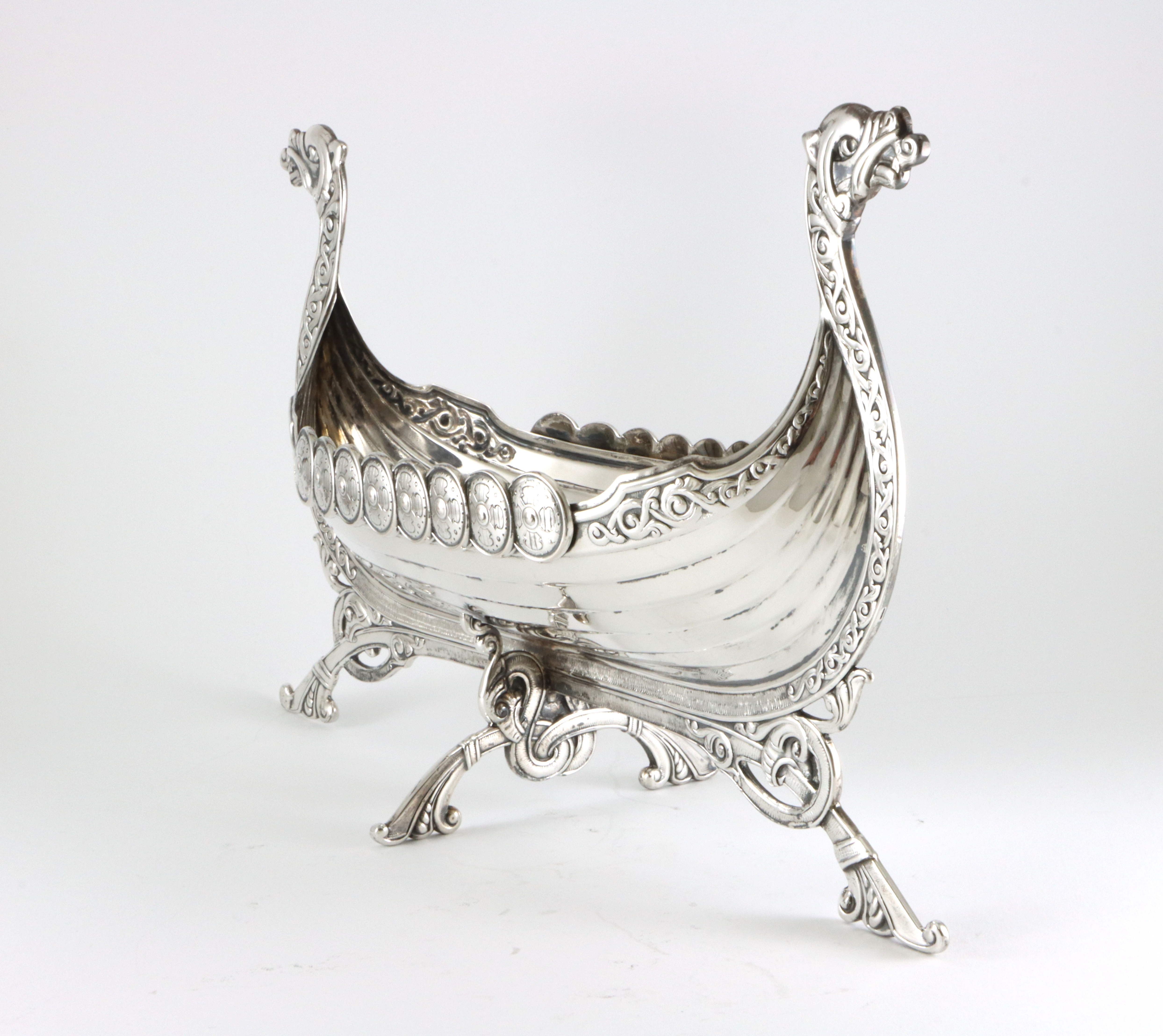 Vikingskip fra Brødrene Lohne, Bergen Bredde: 29 cm Høyde: 18 cm Vekt: 439 gram I god stand (kan pusses noe bedre) Nyprisen ligger på 39 500,- på et tilsvarende i 925 Sølv