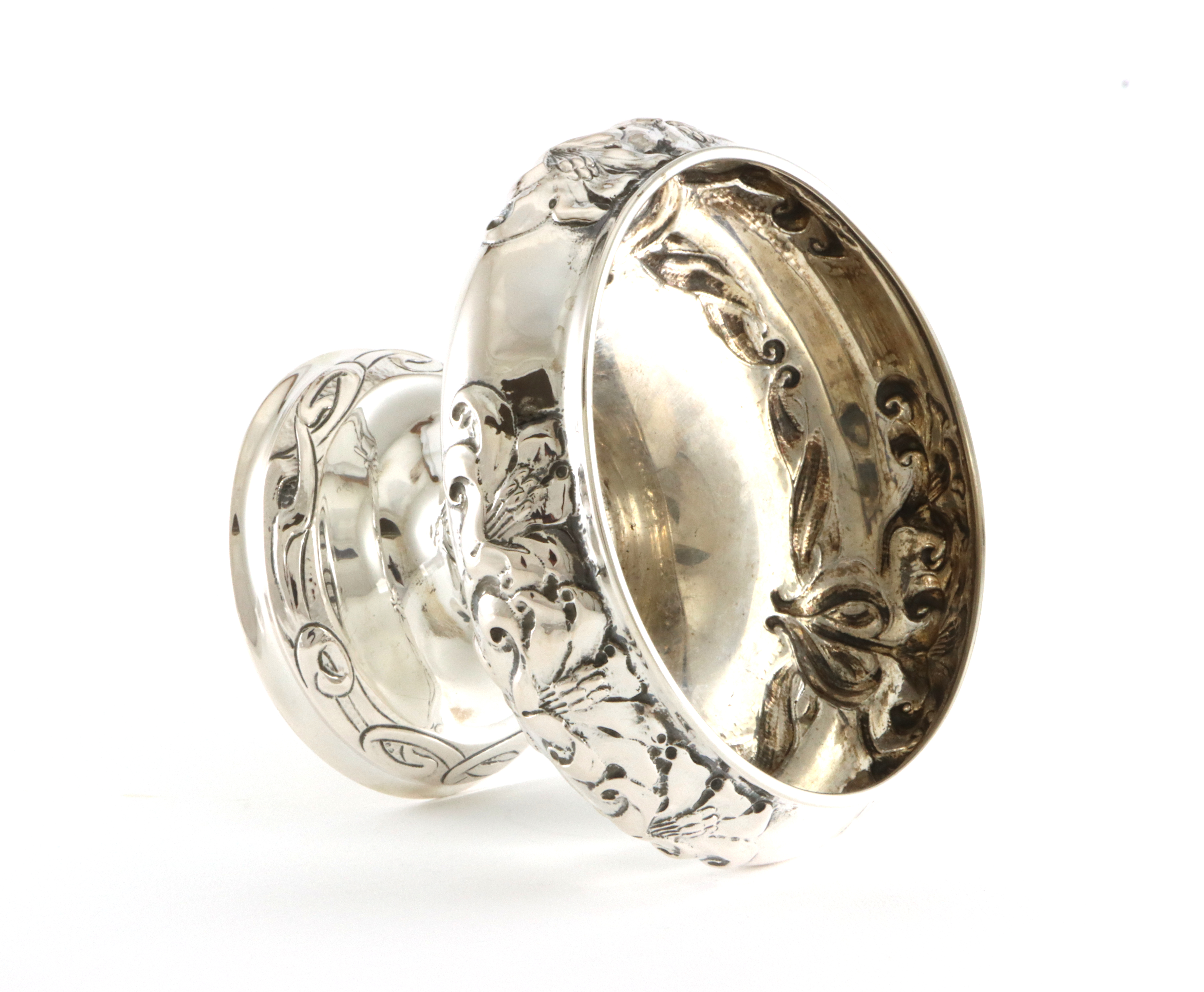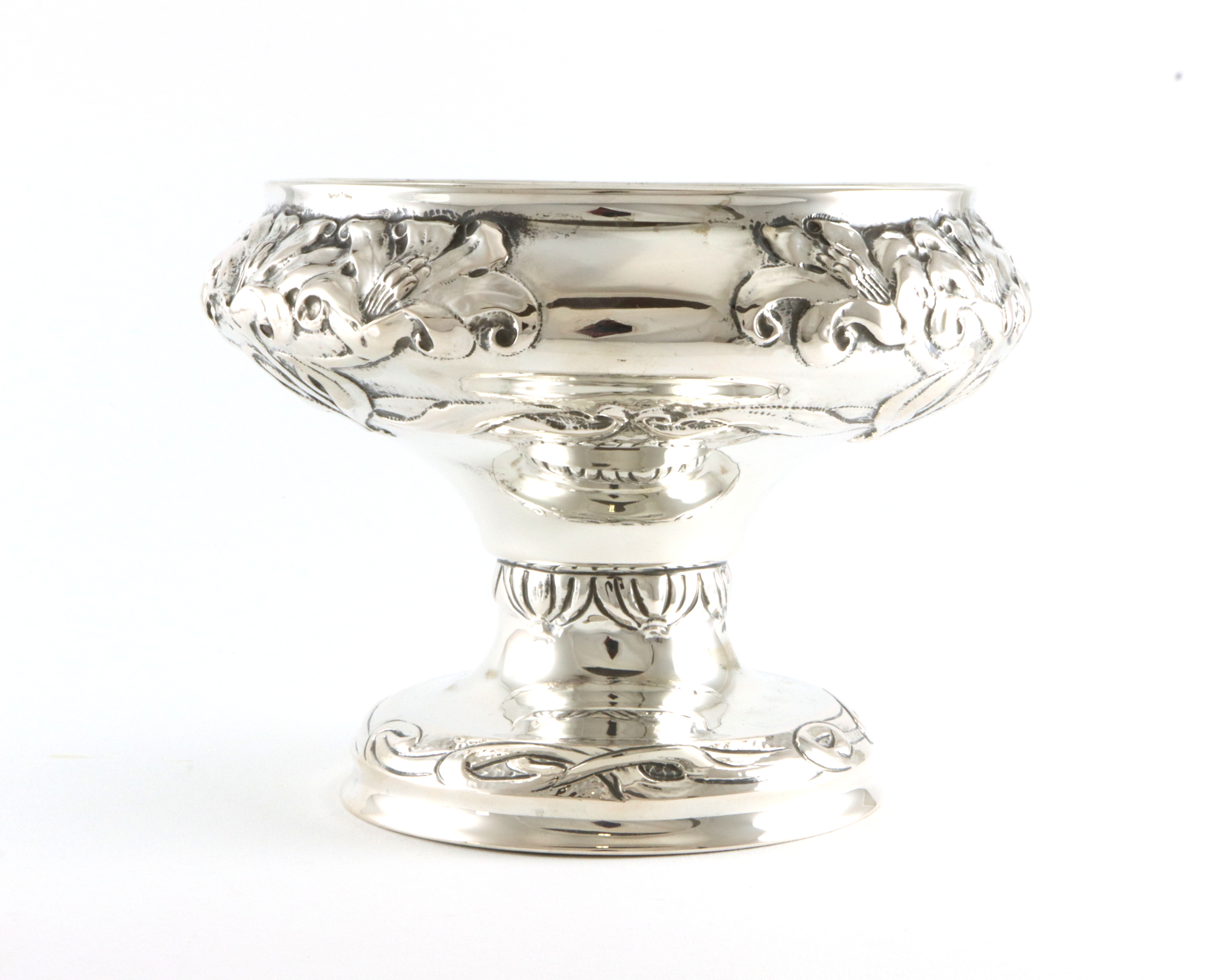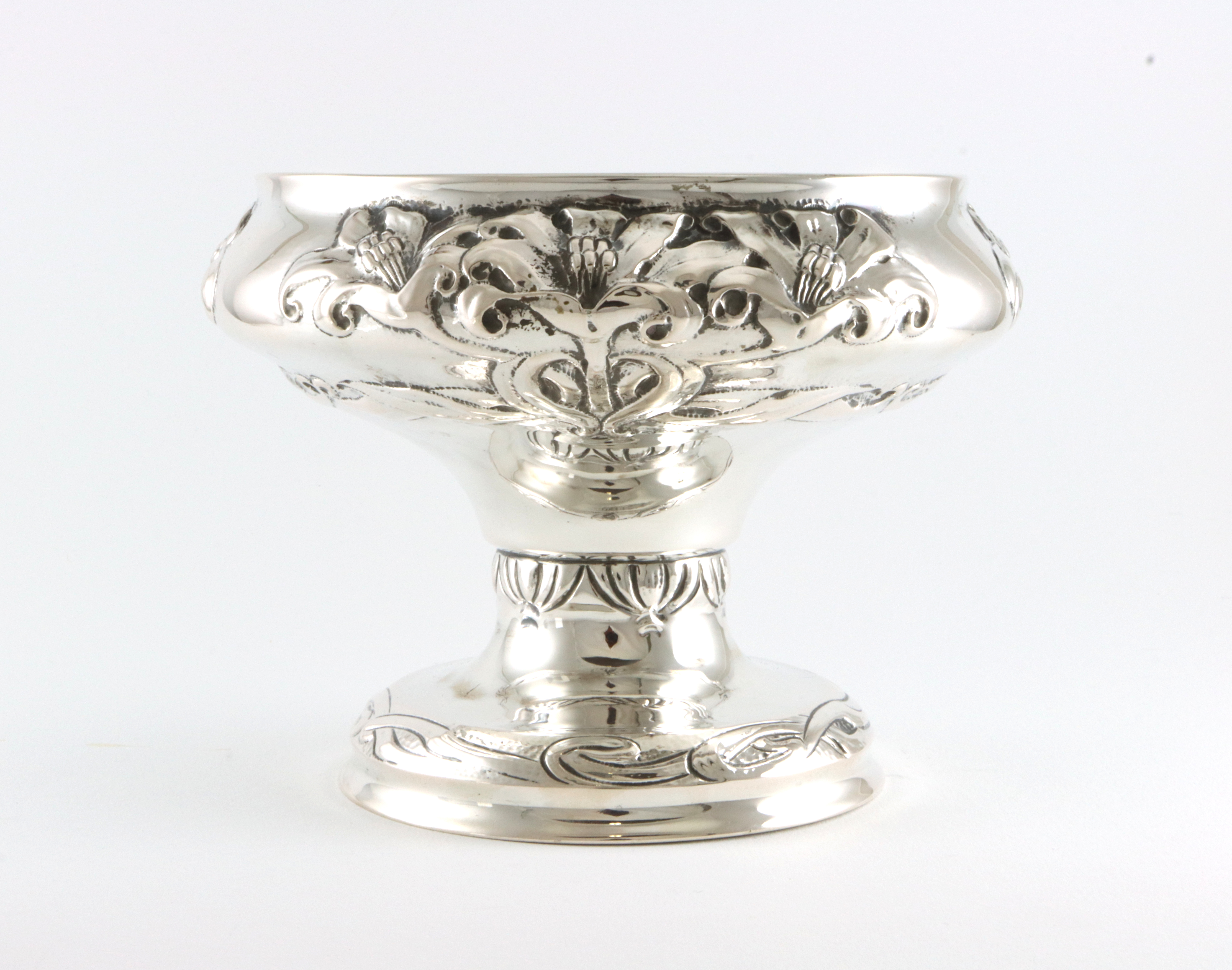 Rikt dekorert bolle/stettskål fra Thune i 830 Sølv Høyde: 12,5 cm Vekt: 327 gram I god stand men kan pusses noe mer