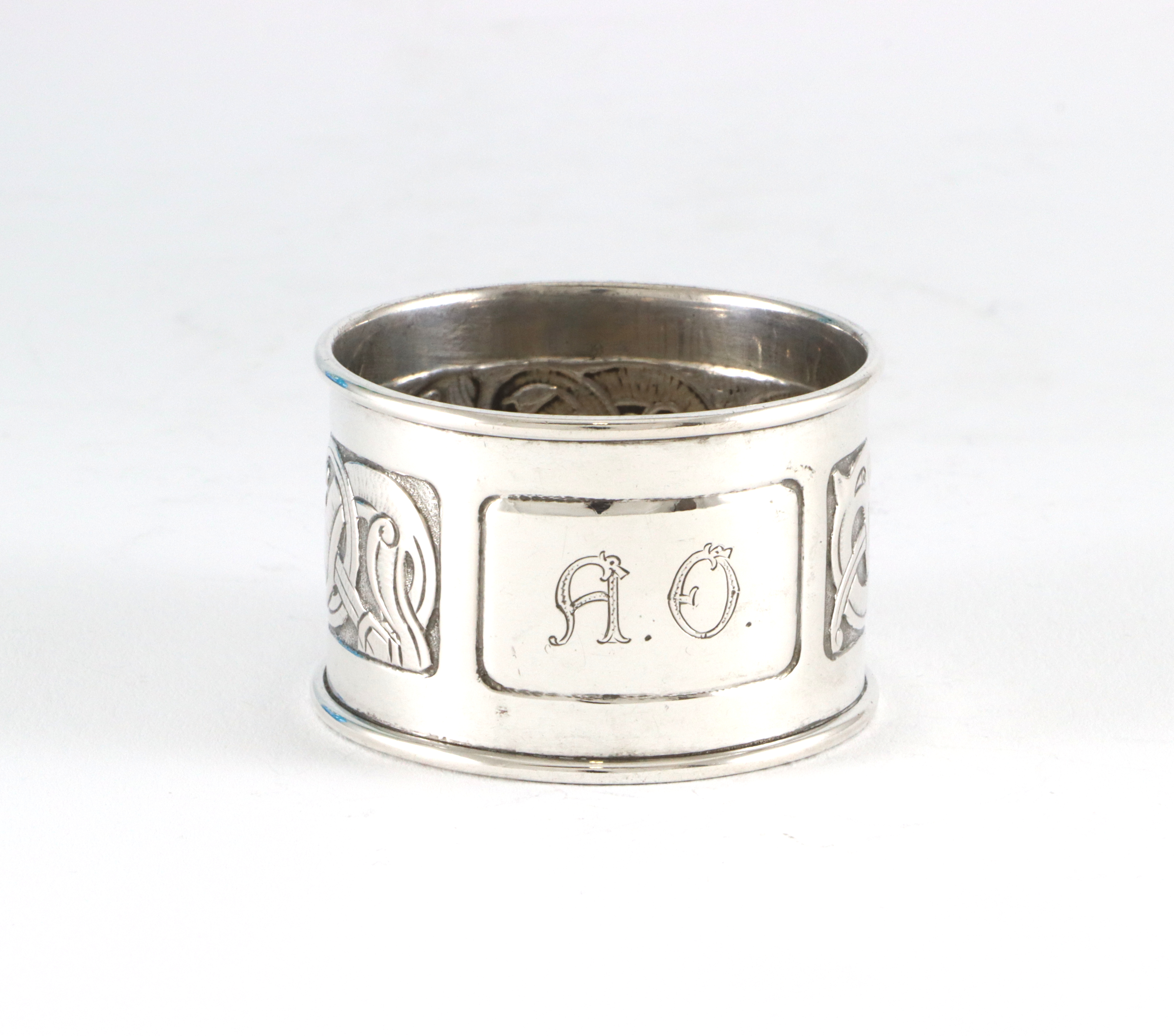 Serviettring fra David-Andersen (Gammelstemplet). Dragestil dekor, men inngraverte initialer "A.O" og dato i 1914 på innsiden.