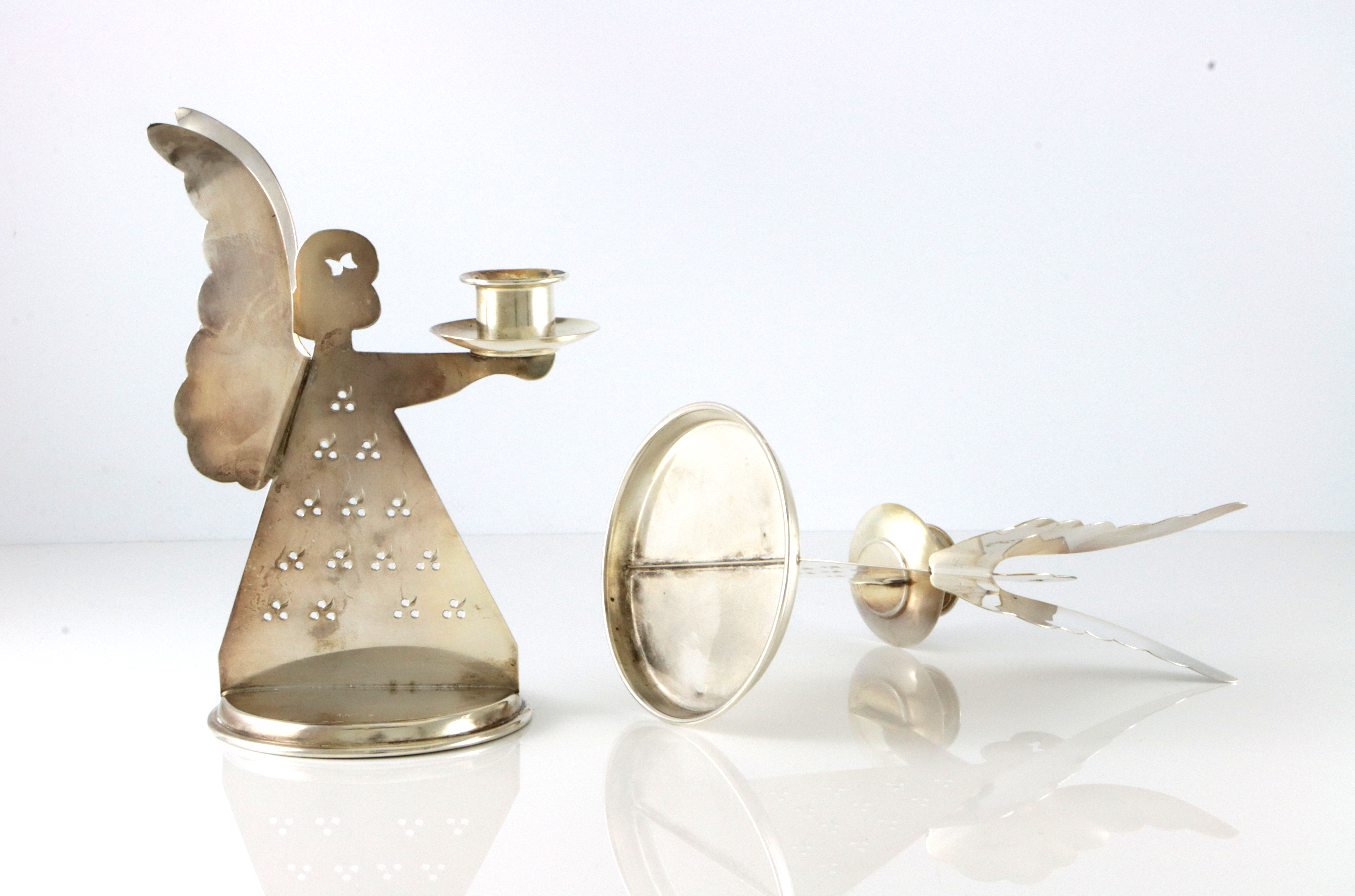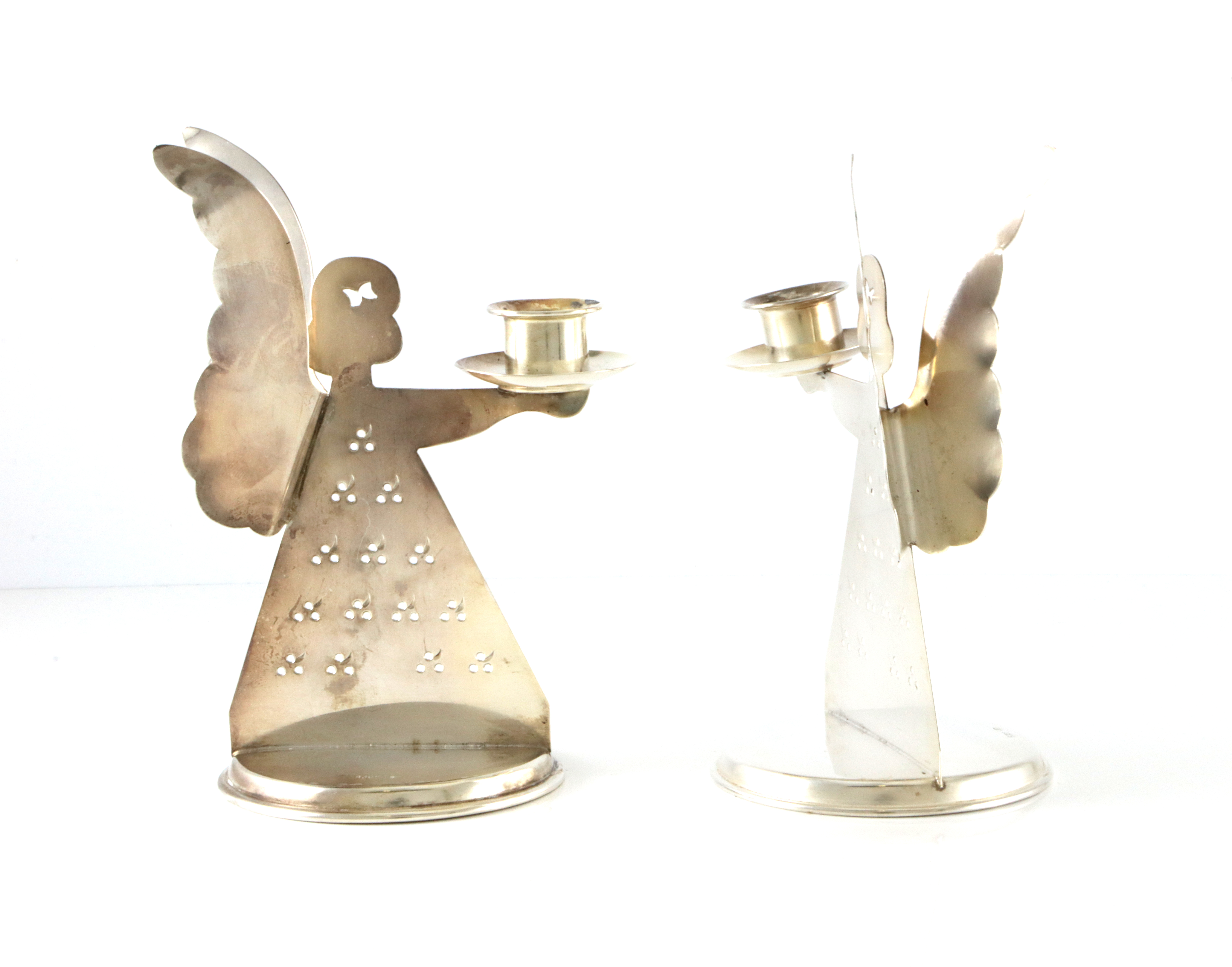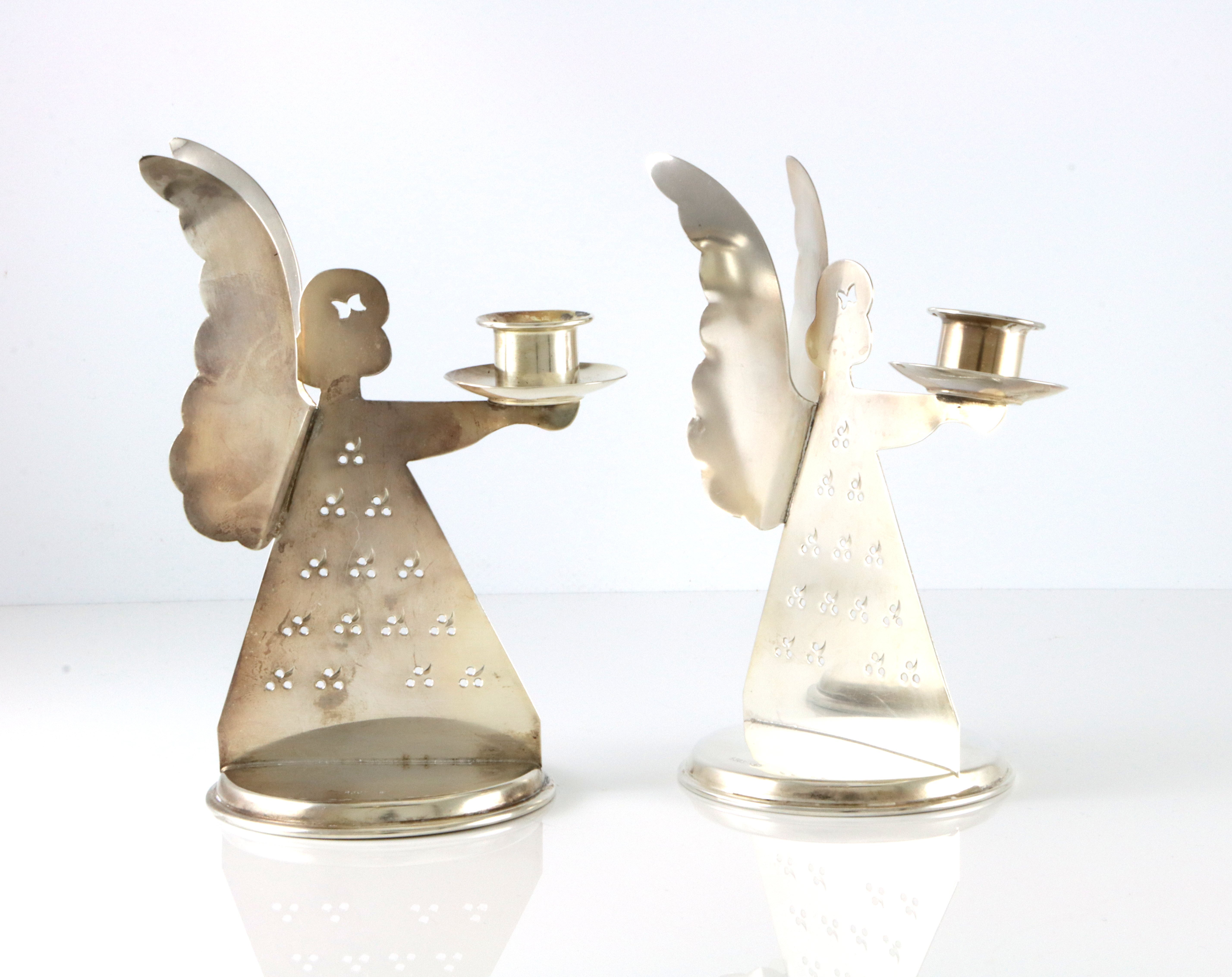 Høyde: 13,5 cm Til mindre lys Tynt sølv Bruksslitasje men fremstår som tiltalende Kan pusses bedre Prisen er for to stk