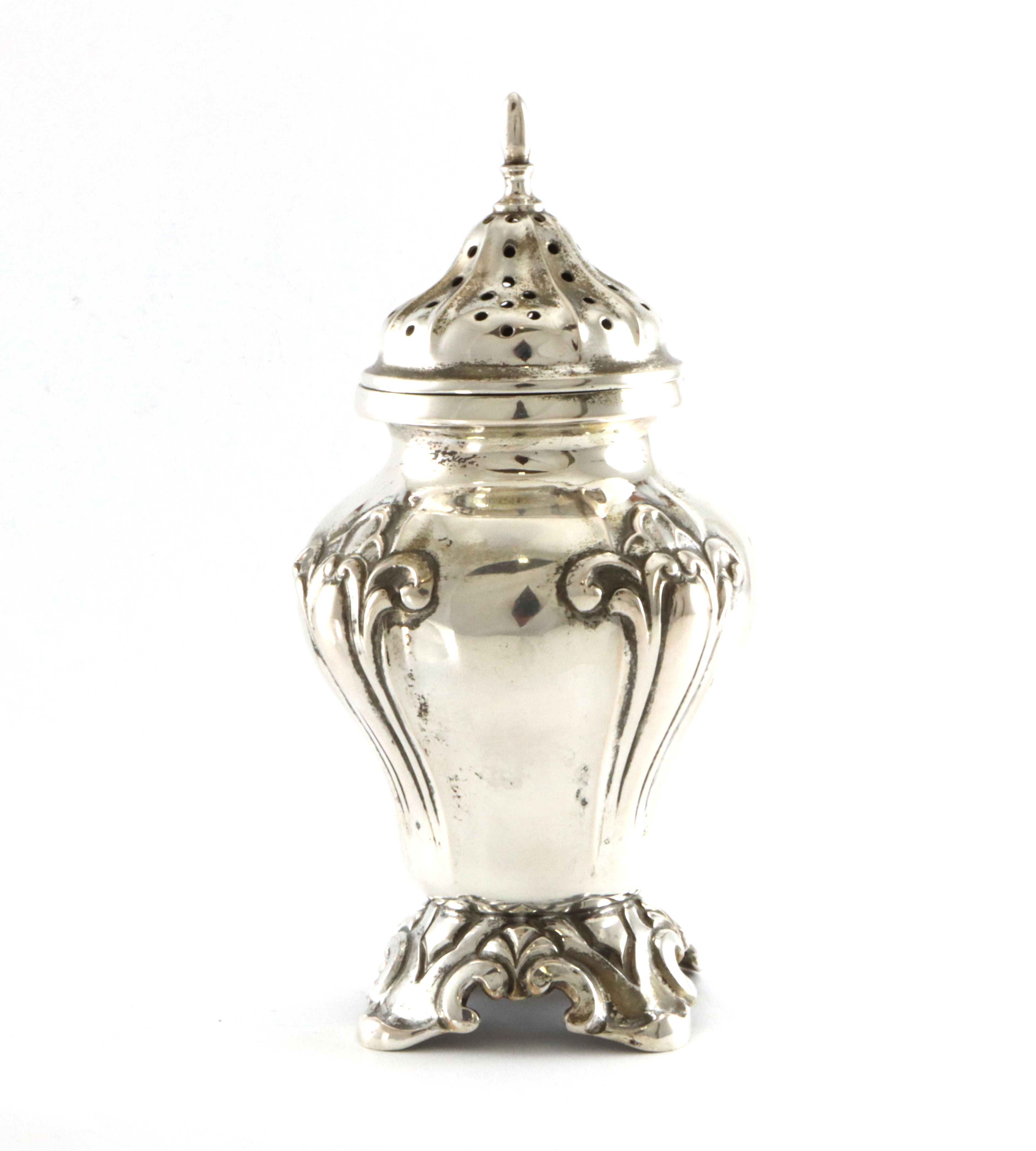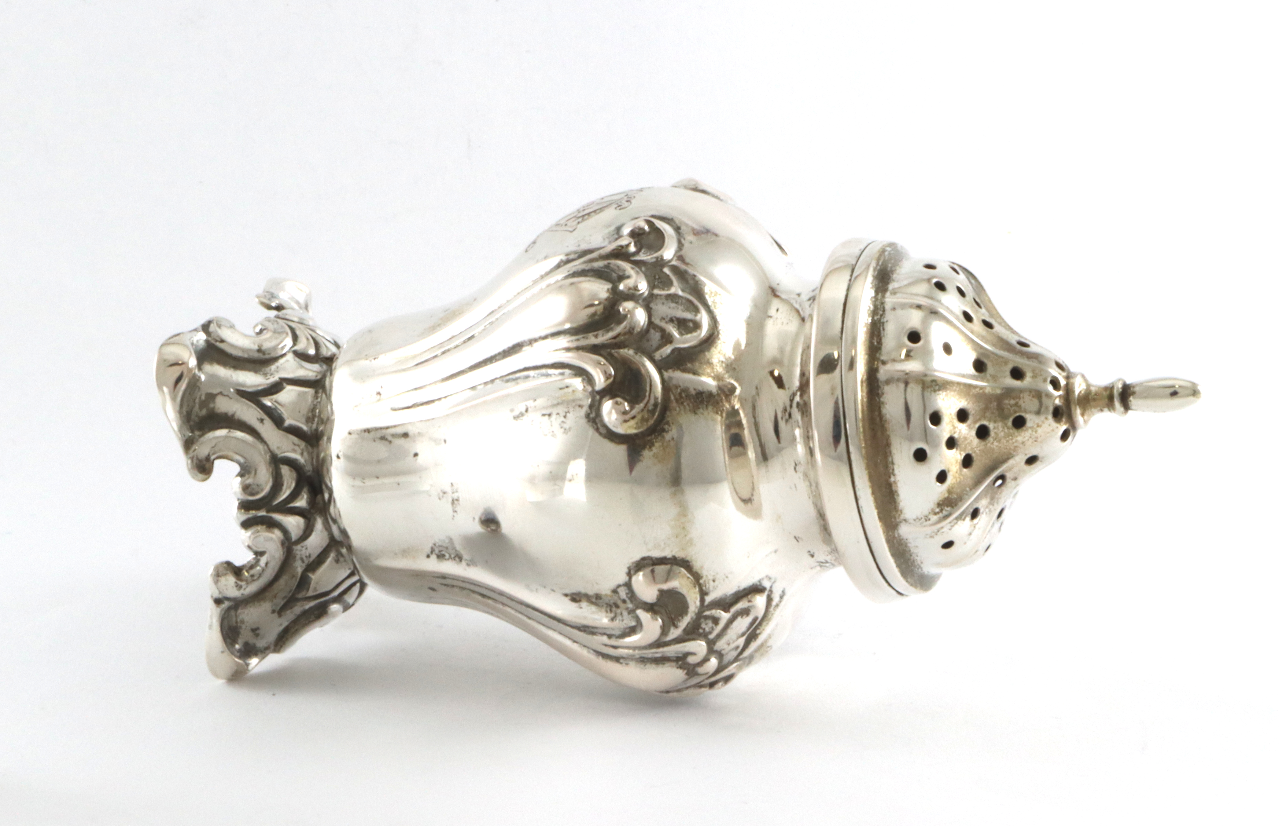 Flott saltbøsse i 830 Sølv fra Thune Høyde: 11 cm Gravert monogram "OH" I god stand