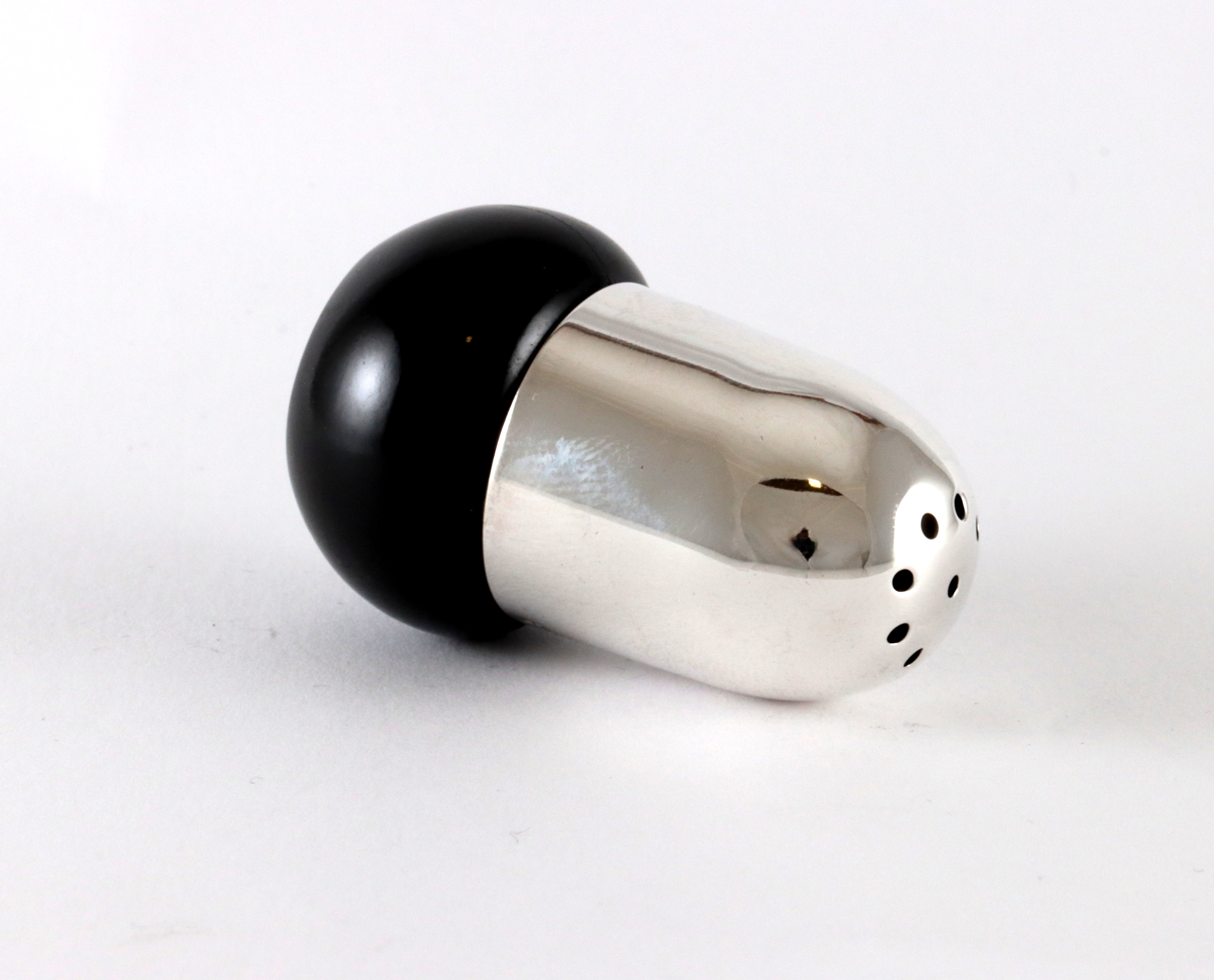 Saltbøsse med sølvtopp og plastbunn. Produsert av Th.Olsen. Ca 4,2 cm høy