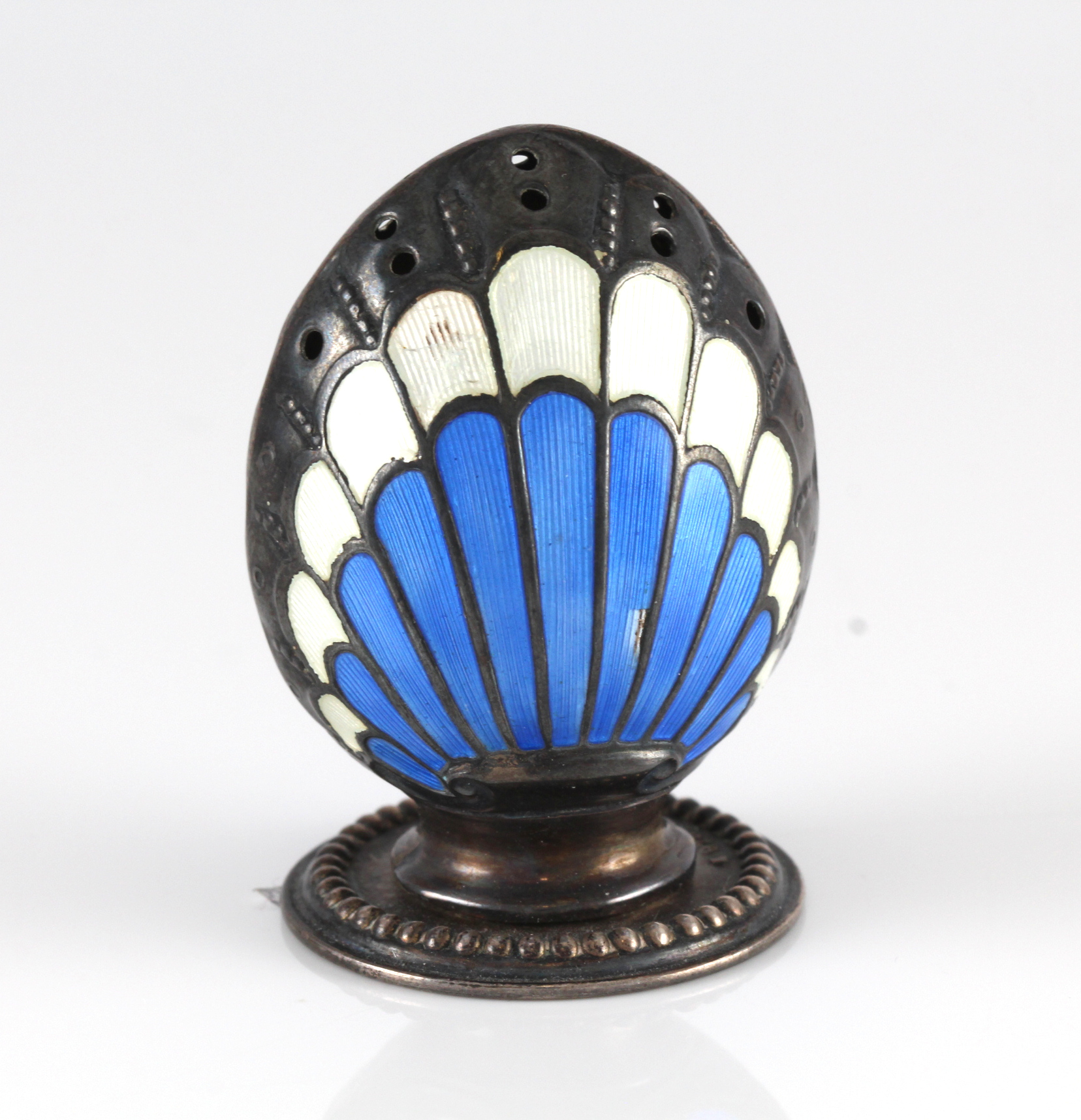 Skjellformet saltbøsse i sølv fra Tostrup. Blå og hvite emalje. Bøssen har to emaljeskader på den ene siden, den andre fremstår uskadet. Leveres upusset.
