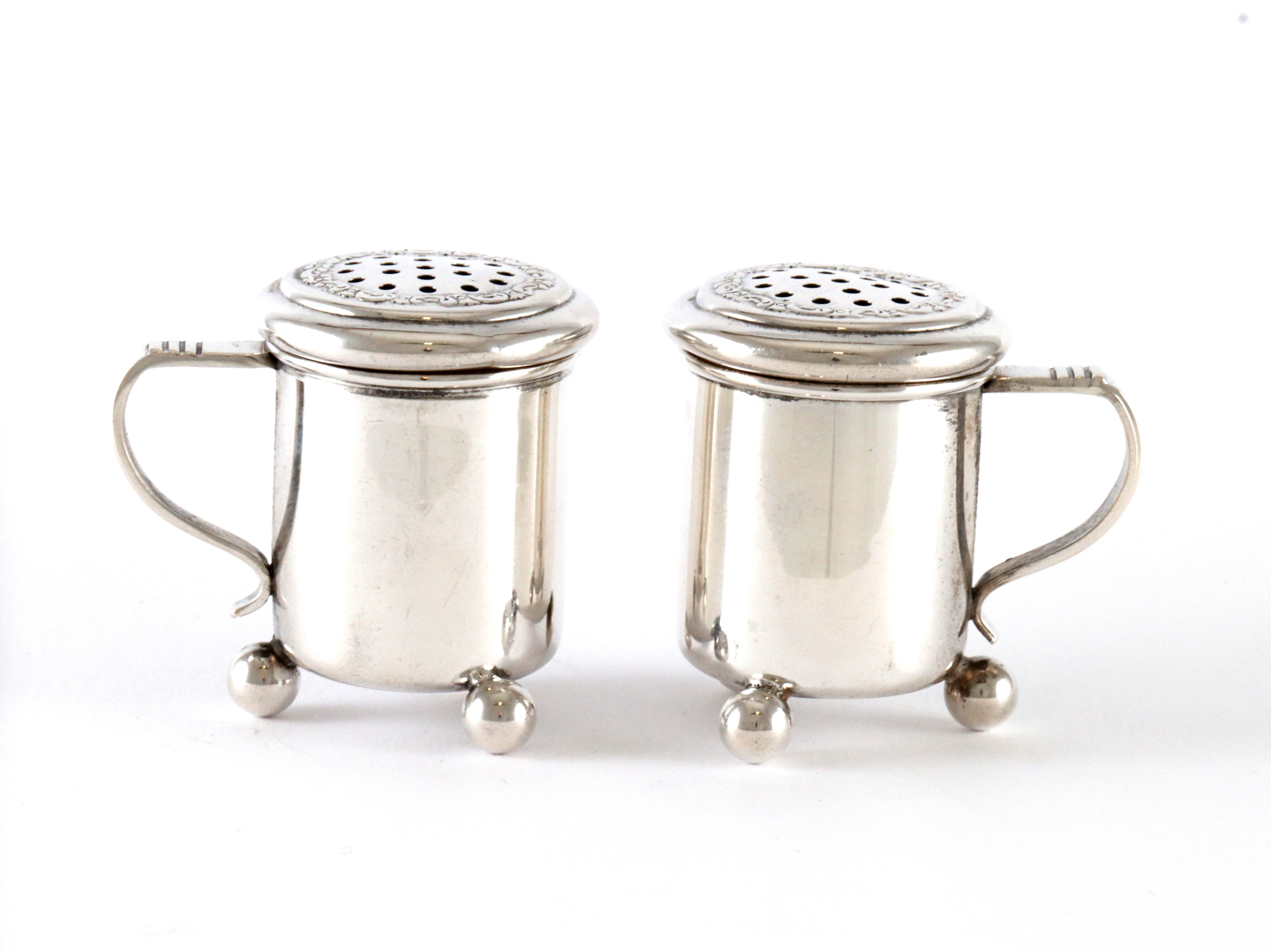Salt og pepperbøsser i sølv, produsert av Th.Olsen i Bergen. Formet som ølkrus. Ca 3,5 cm stor. Den ene har fått seg en kakk, eller i god stand.