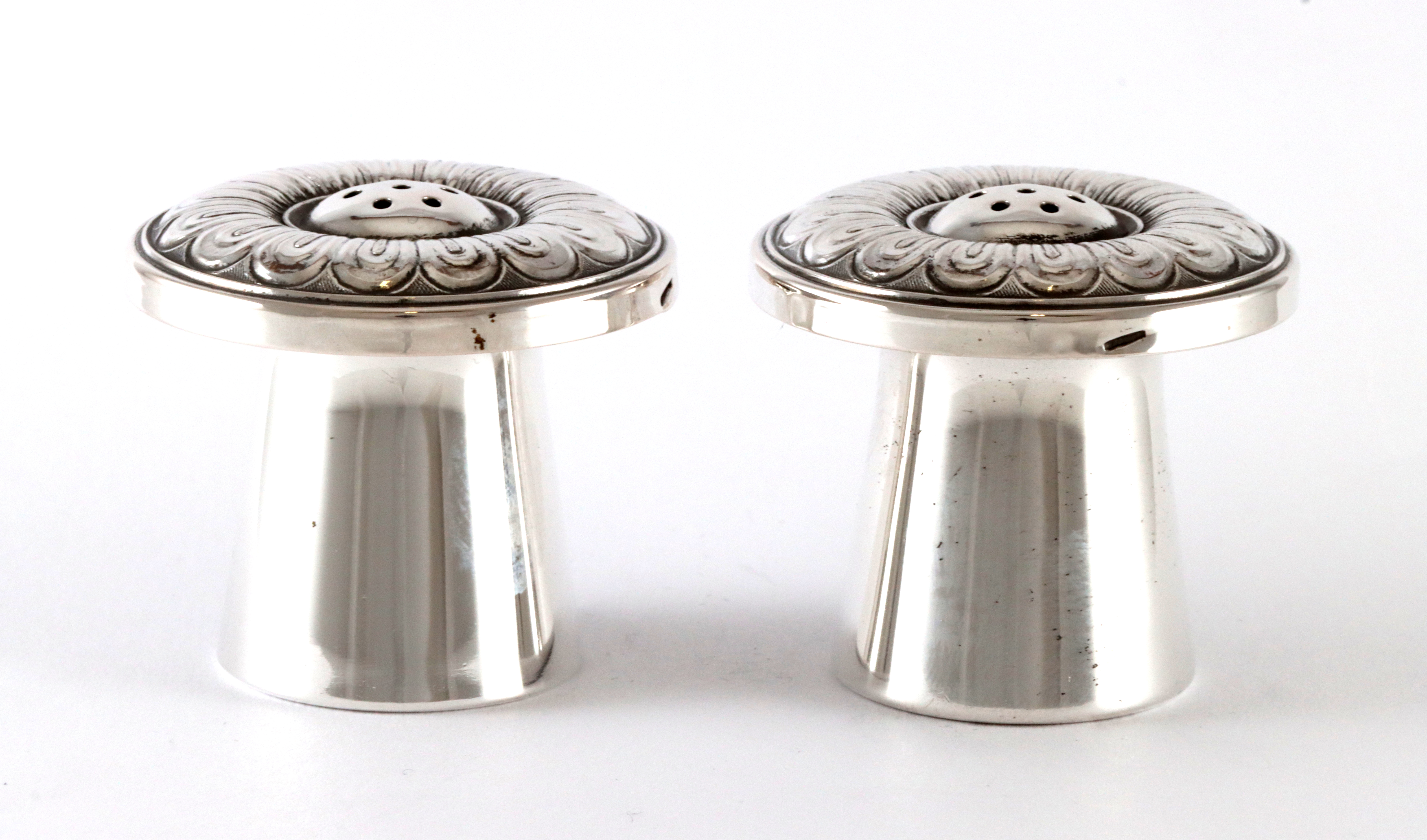 Salt og pepperbøsser formet som sopper, produsert av Aksel Holmsen. Disse finnes både med og uten emalje. Dette er da altså uten. Ca 3,3 cm høye. I veldig fin stand. Prisen er for et par.