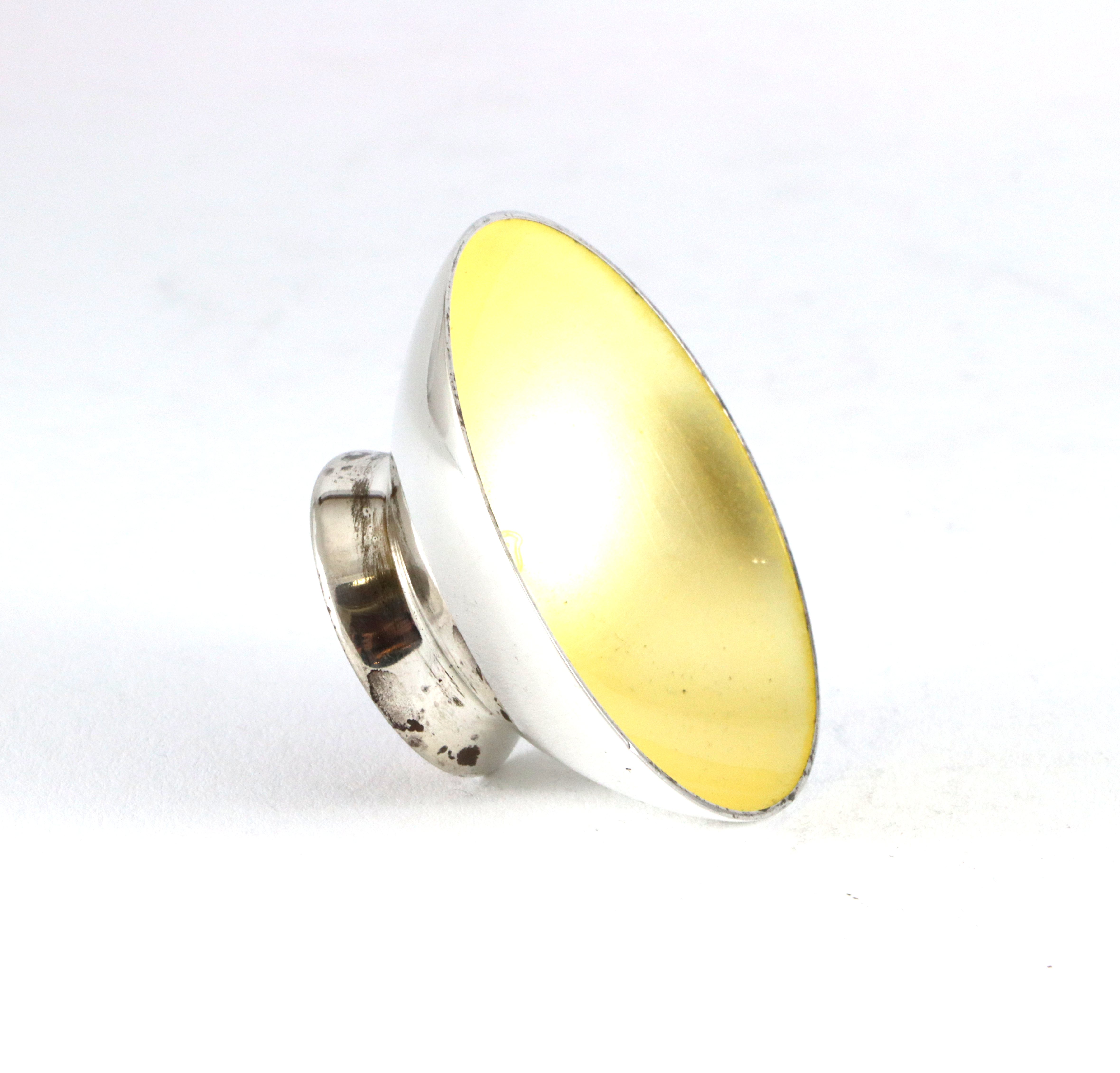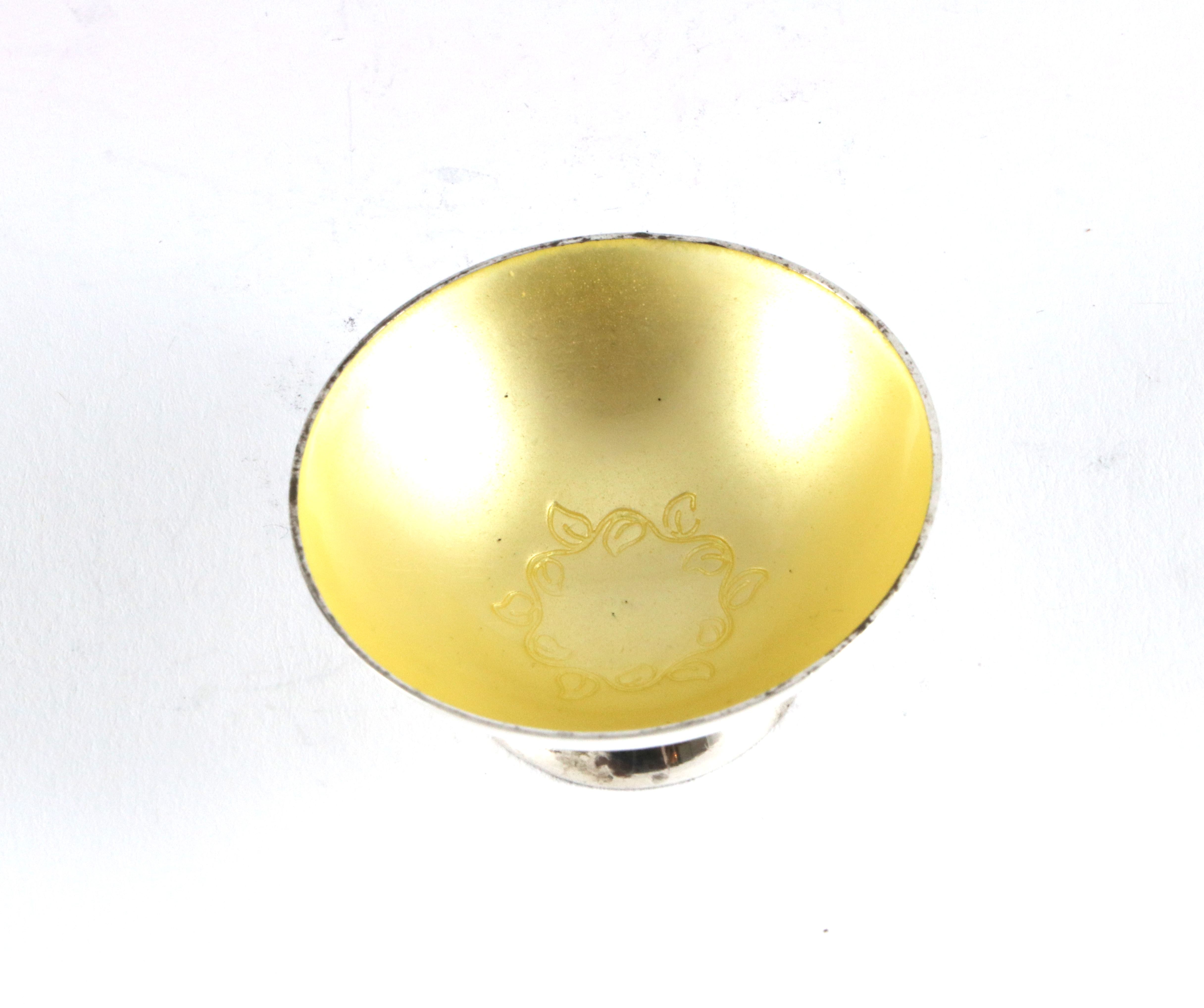 Saltskål i sølv og gul emalje, produsert av Volmer Bahner i Danmark. Saltskåla er ca 2,1 cm høy og 4,0 cm bred. Emaljen er i fin stand. Noen svake saltflekker i sølvet.