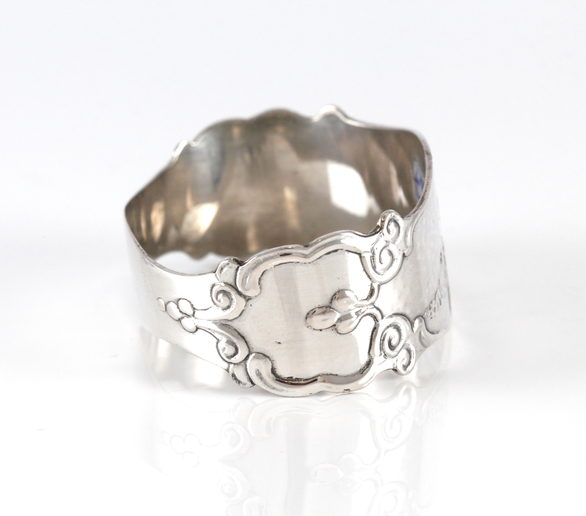 Serviettring i sølv, i mønsteret Nils og Blåmann. Produsert av Nils Hansen. 5,0x3,3 cm stor