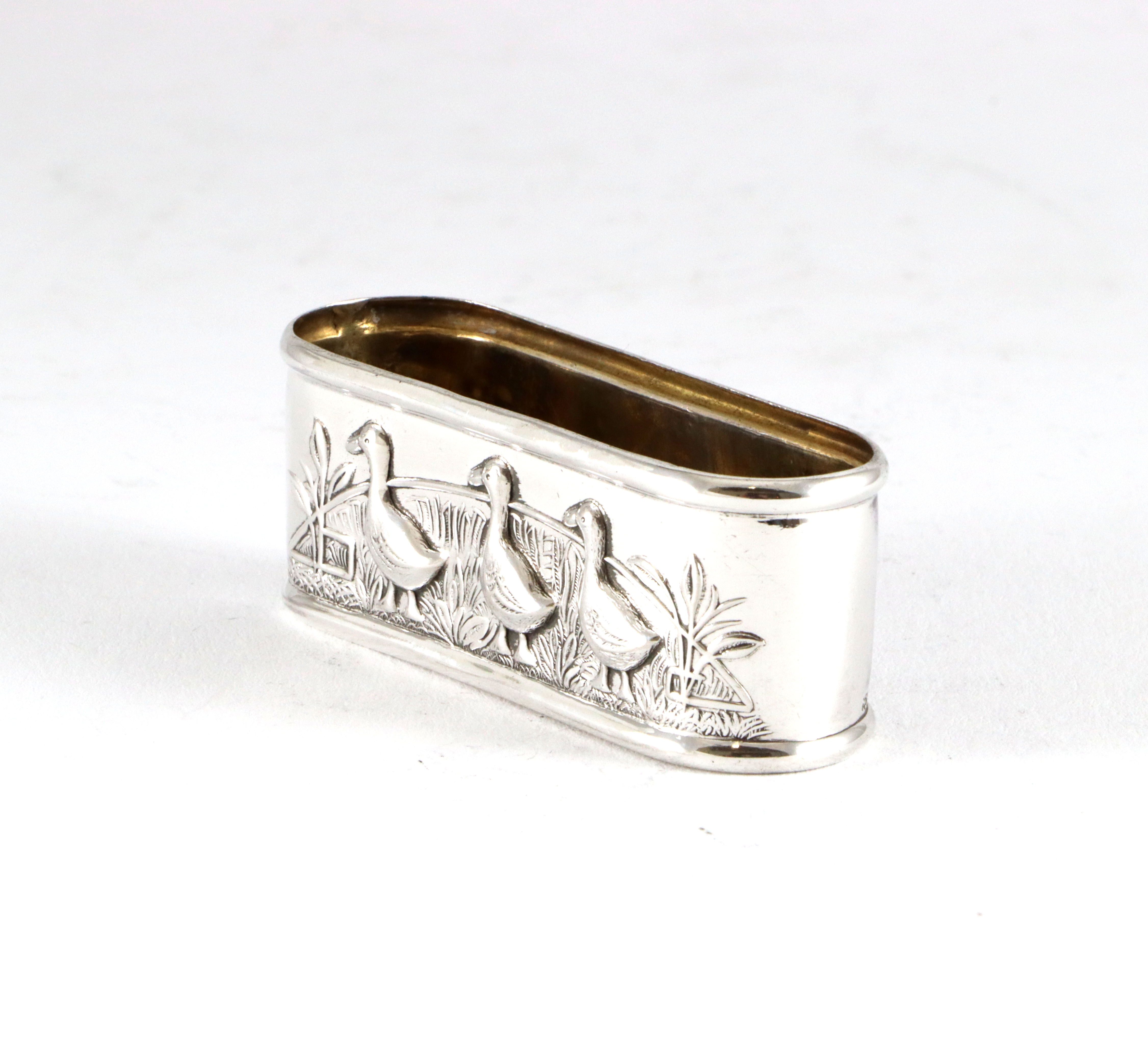 Serviettring med motiv av tre ender, kun stemplet 925 ikke noe mesterstempel. 5,4 cm lang og 1,7 bred