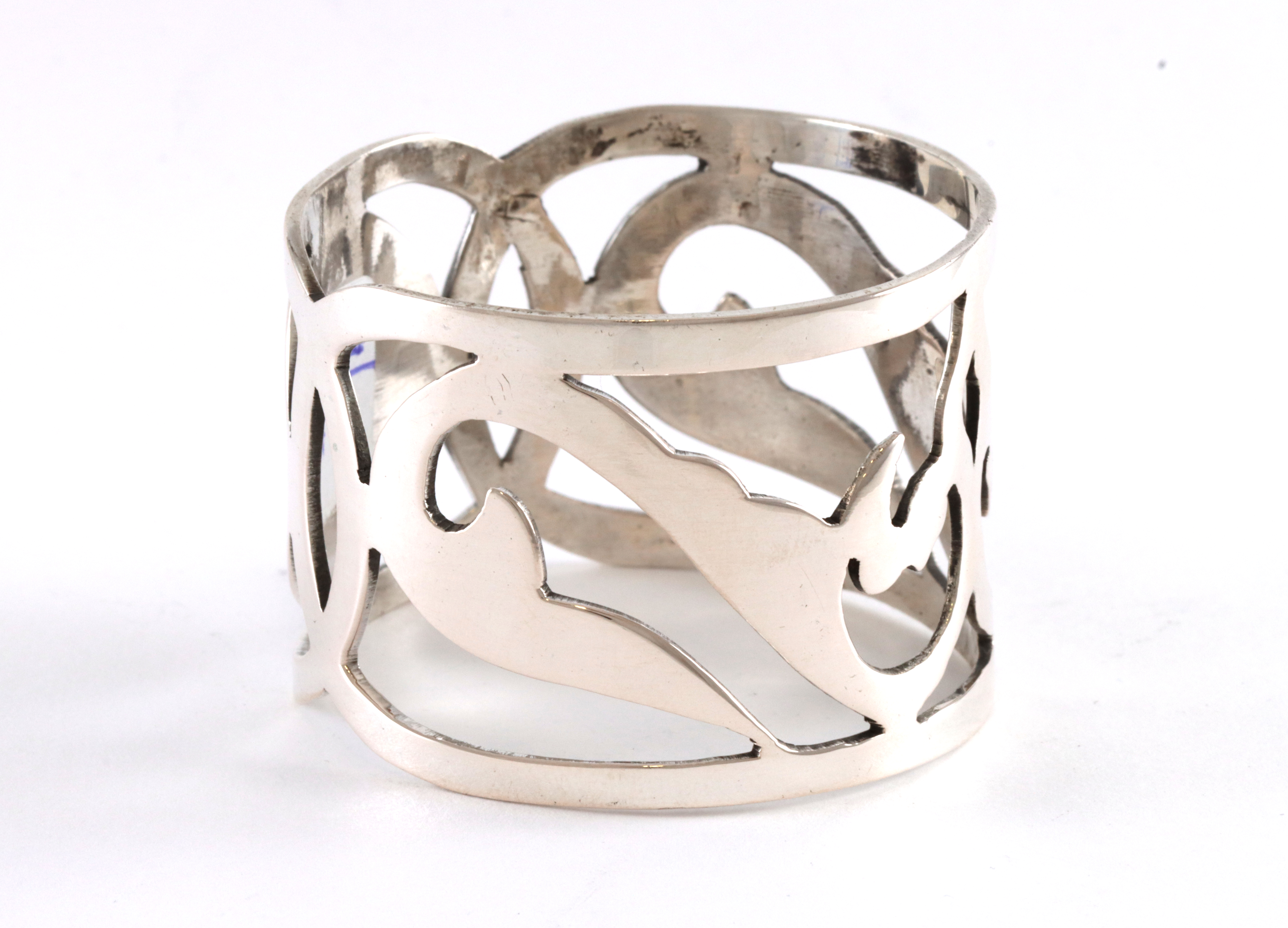 Serviettringer i sølv av arabisk opprinnelse. Flott mønster som vi antar er lagd for hånd. Blankt område for muliget for initialer og navn. 3,0 cm bred.