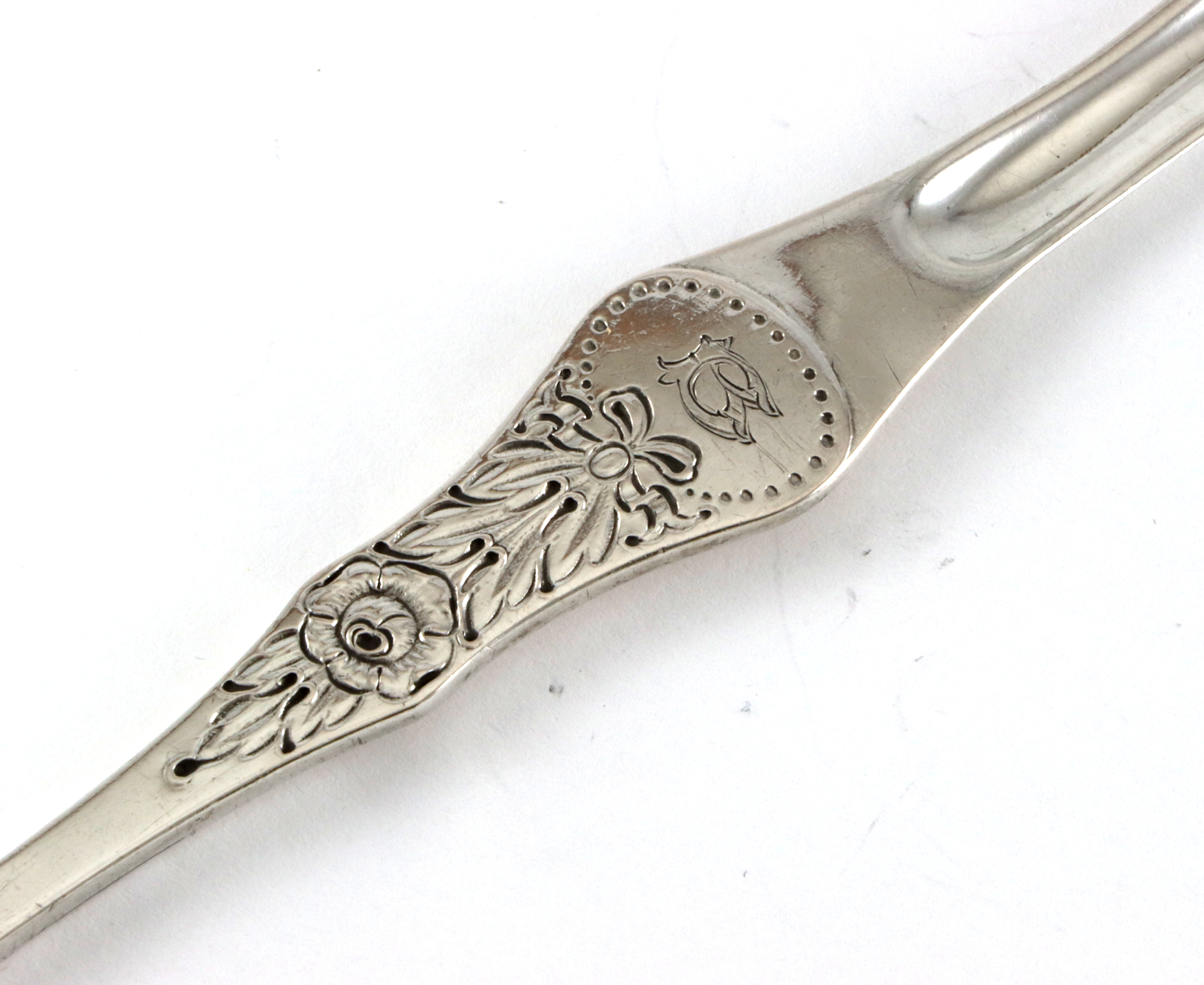 Skalldyrgaffel på 17,4 cm Mønsteret heter egentlig "Rose" og er produsert av Tostrup. Men siden det er helt likt Flat Rose og vi har ingen kategori for Tostrup-Rose så legger vi disse under Flat Rose. Gravert bokstav "B"