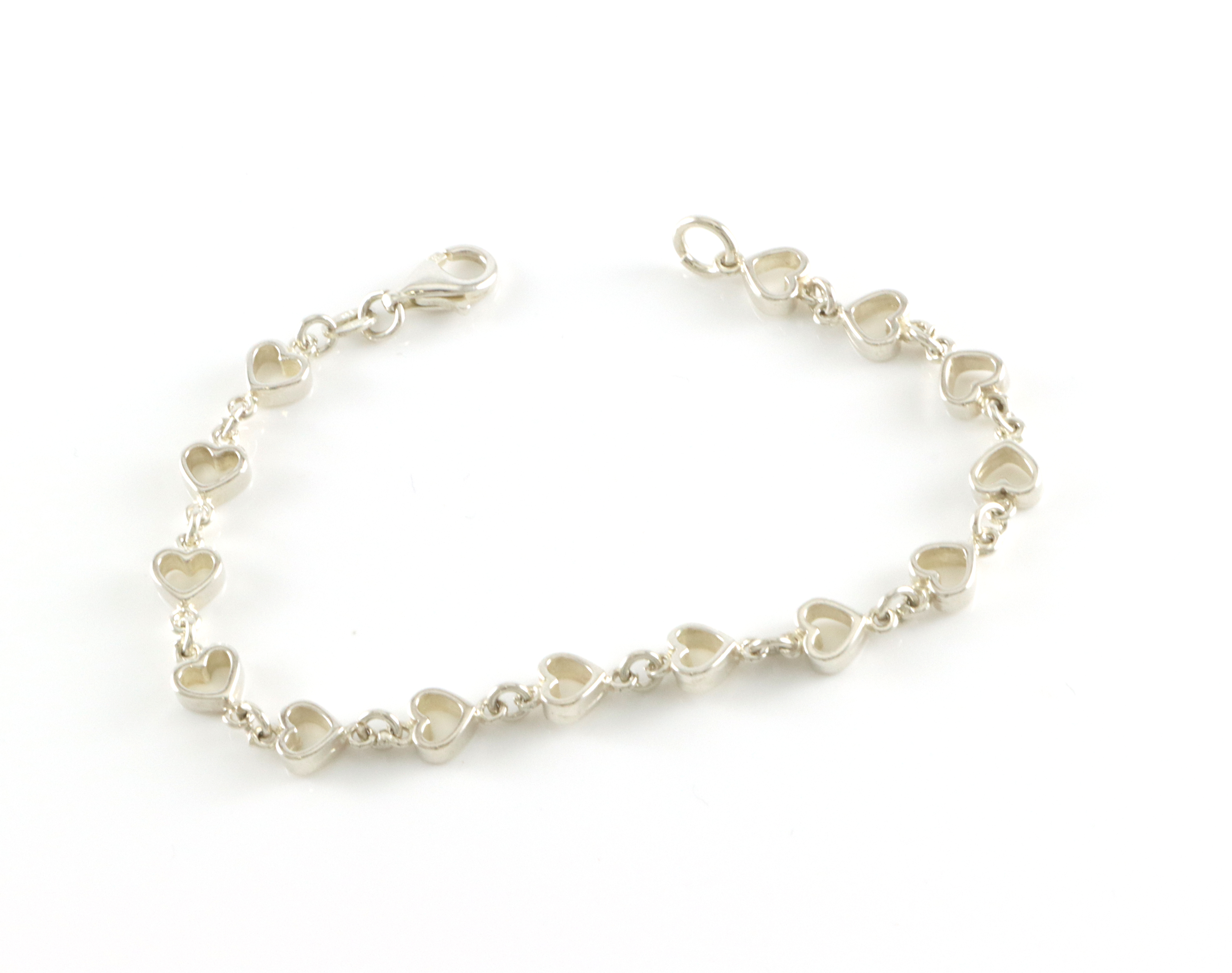 Armlenke i sølv Leddene er formet som hjerter Ca 18,5 cm langt Ca 0,6 cm bredt.