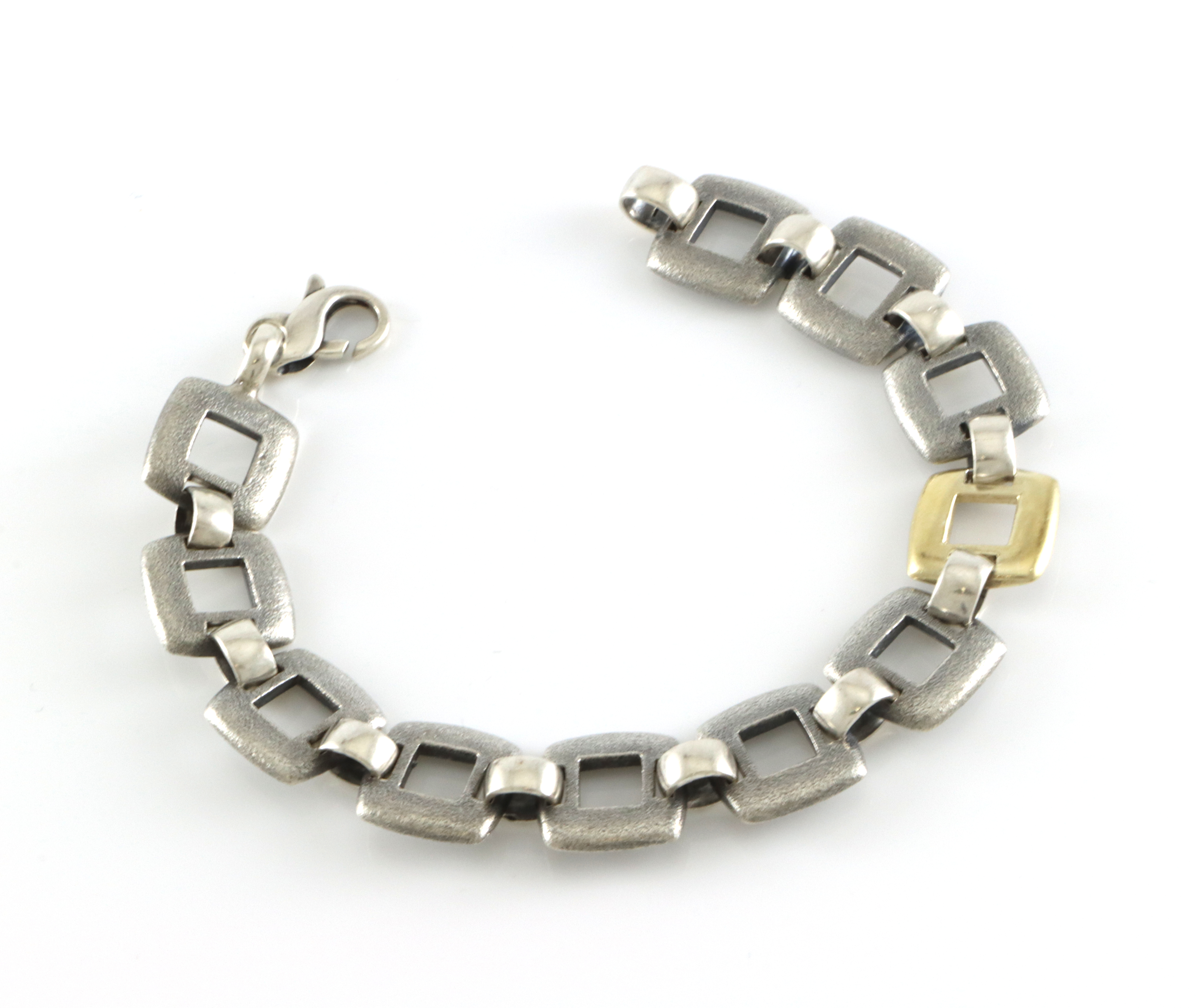 Armlenke i sølv. Oksiderte ledd med et forgylt ledd. Produsert av PAN Ca 20,3 cm langt Ca 1,3 cm bredt.