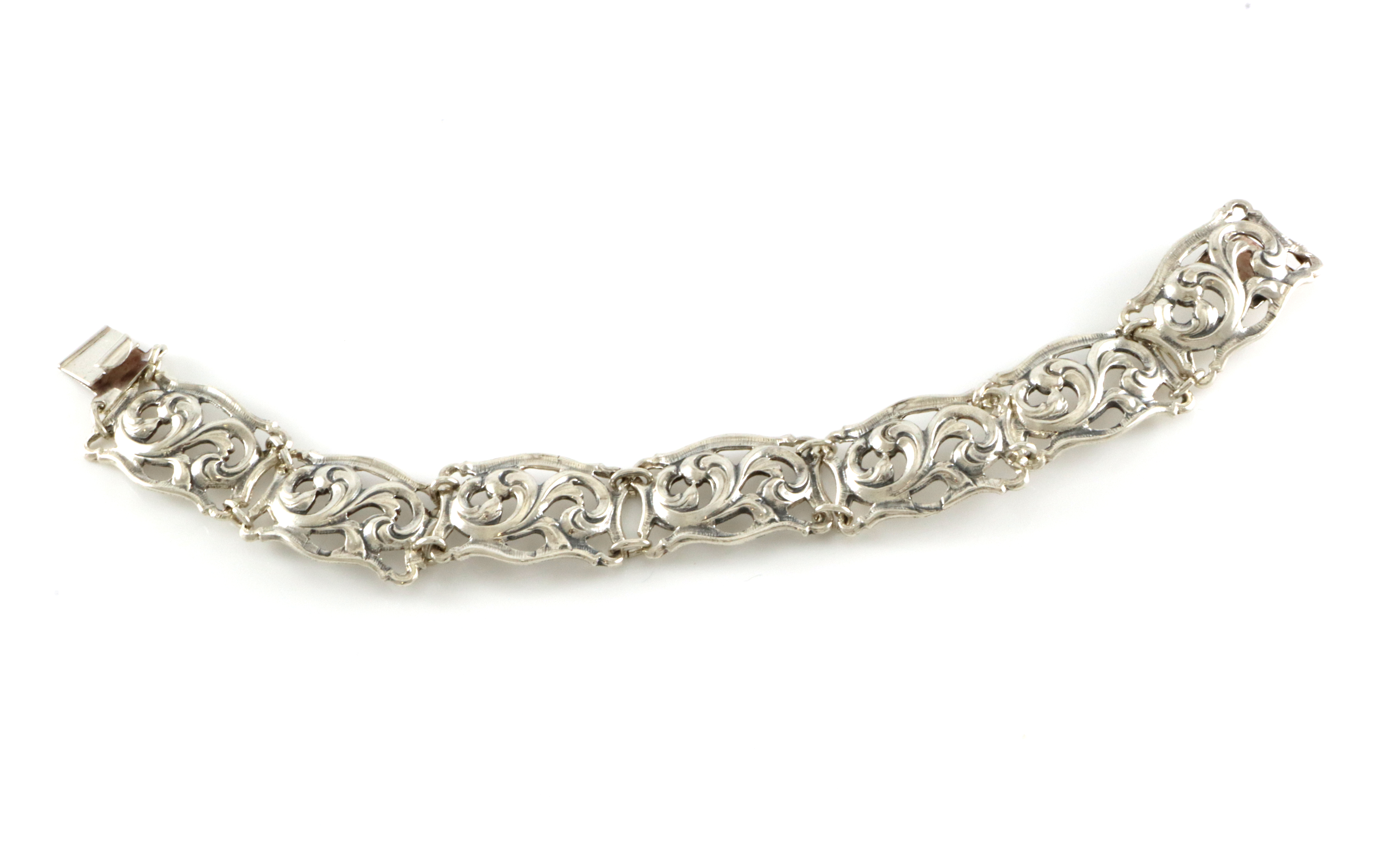 Eldre armlenke i sølv Med gjennombrutt akantusmønster Produsert av Brødrene Lohne Ca 17,8 cm langt (Uten låsetappen) Ca 1,5 cm bredt
