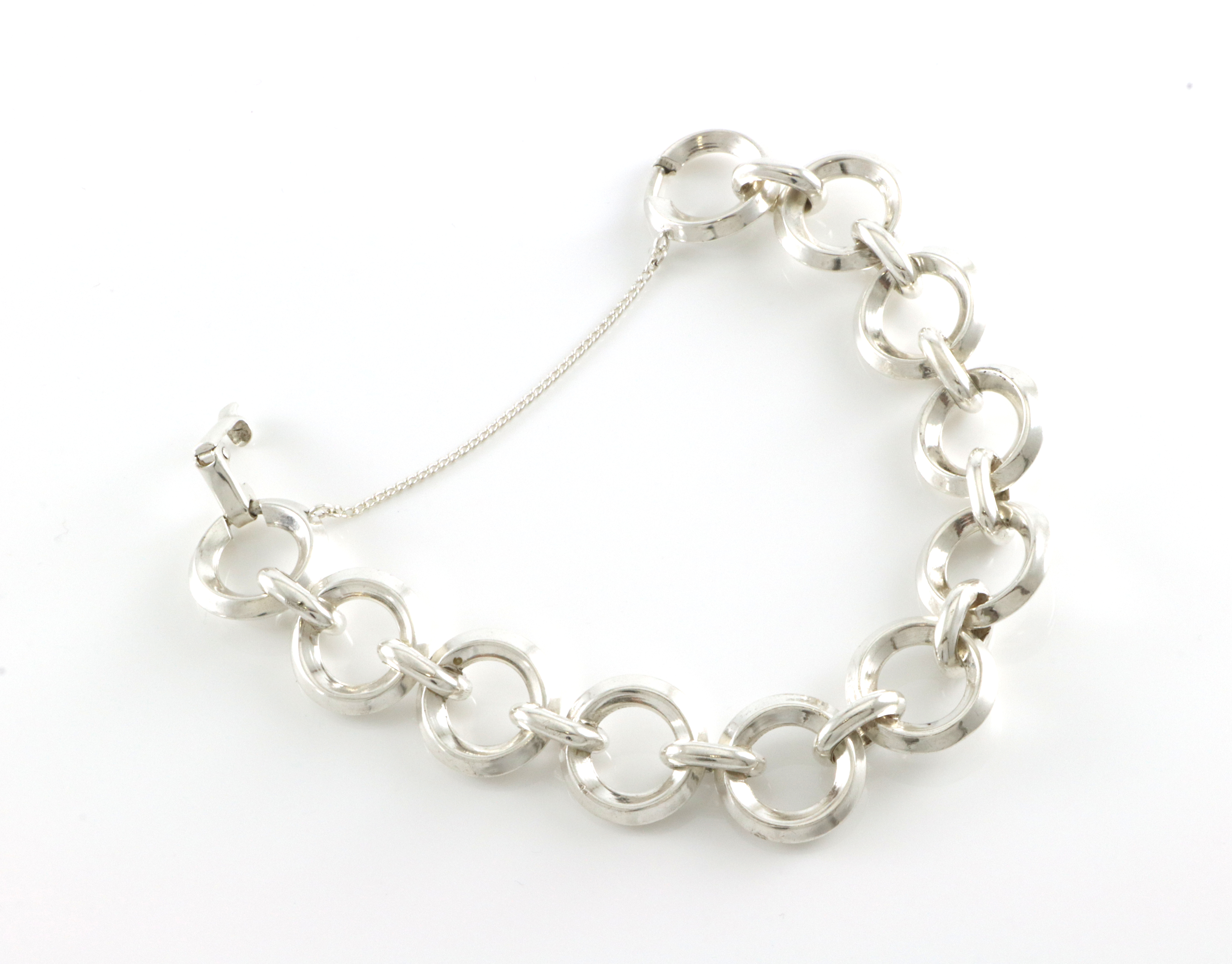 Bredde: 16 mm Lengde: ca 20 cm Med sikkerhetslenke Finner ingen stempler på denne men den tester til 830 Sølv