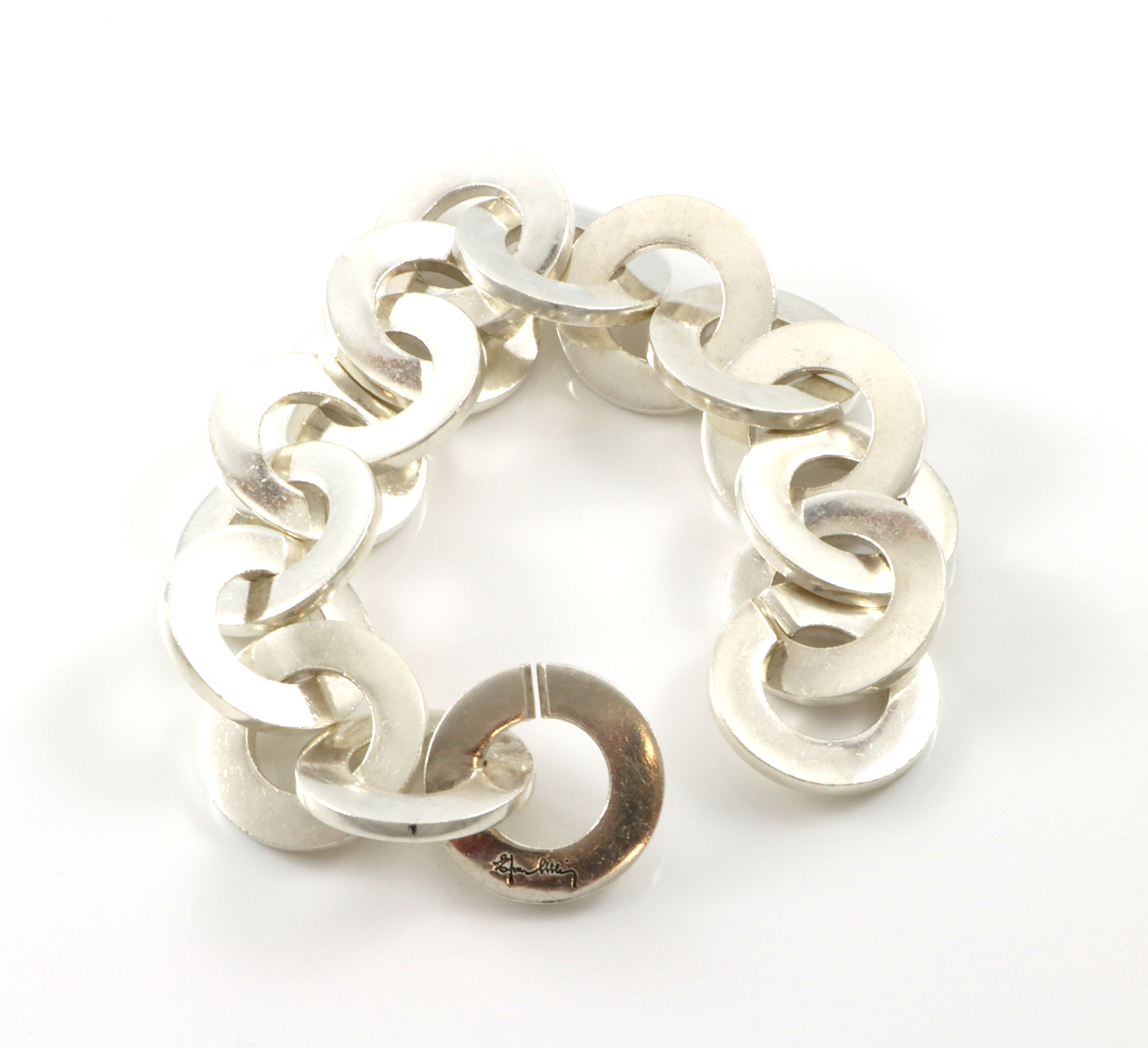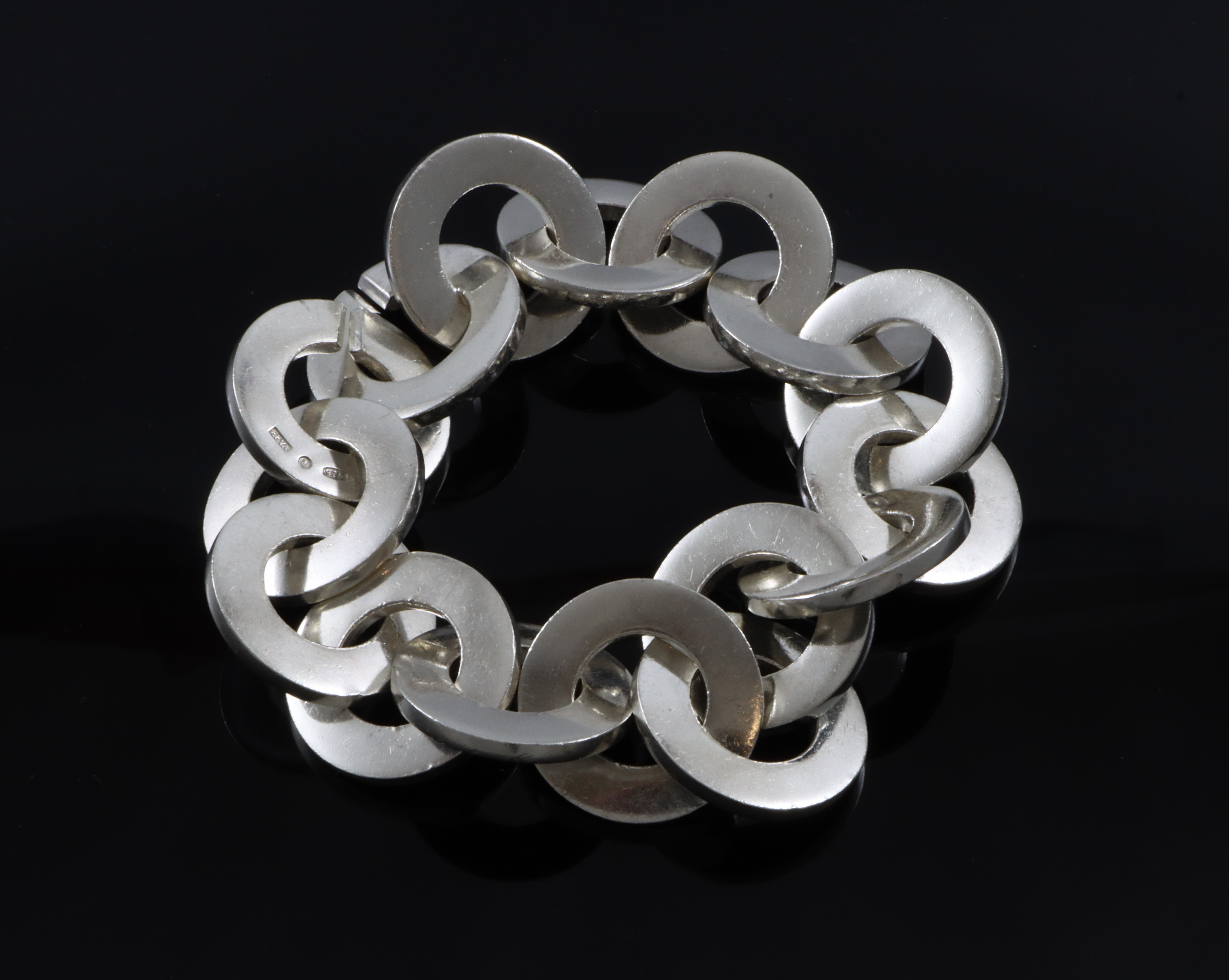 Ekstrem armlenke fra Efva Attling som veier hele 200 gram(!) Bredde: 28 mm Lengde: 24,5 cm. Men "nettolengden" ligger anslagsvis på rundt 21 cm pga tykkelsen på lenken Vekt: 200 gram Bruksmerker