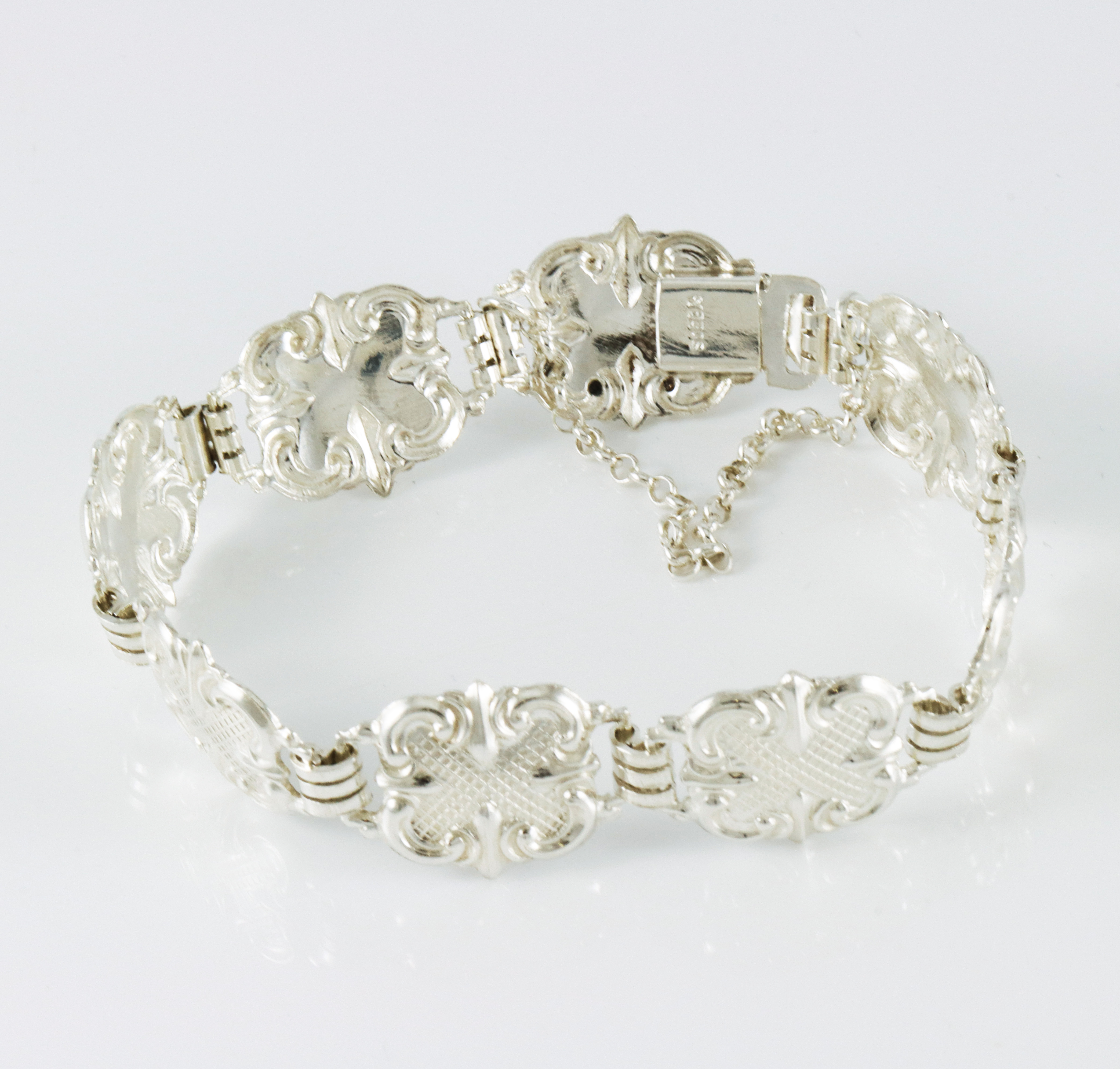 Armlenke i sølv, ukjent produsent. Armlenken er ca 18,3 cm lang( Har sikkerhetslenke så noe vanskelig å måle). 1,7 cm bred.