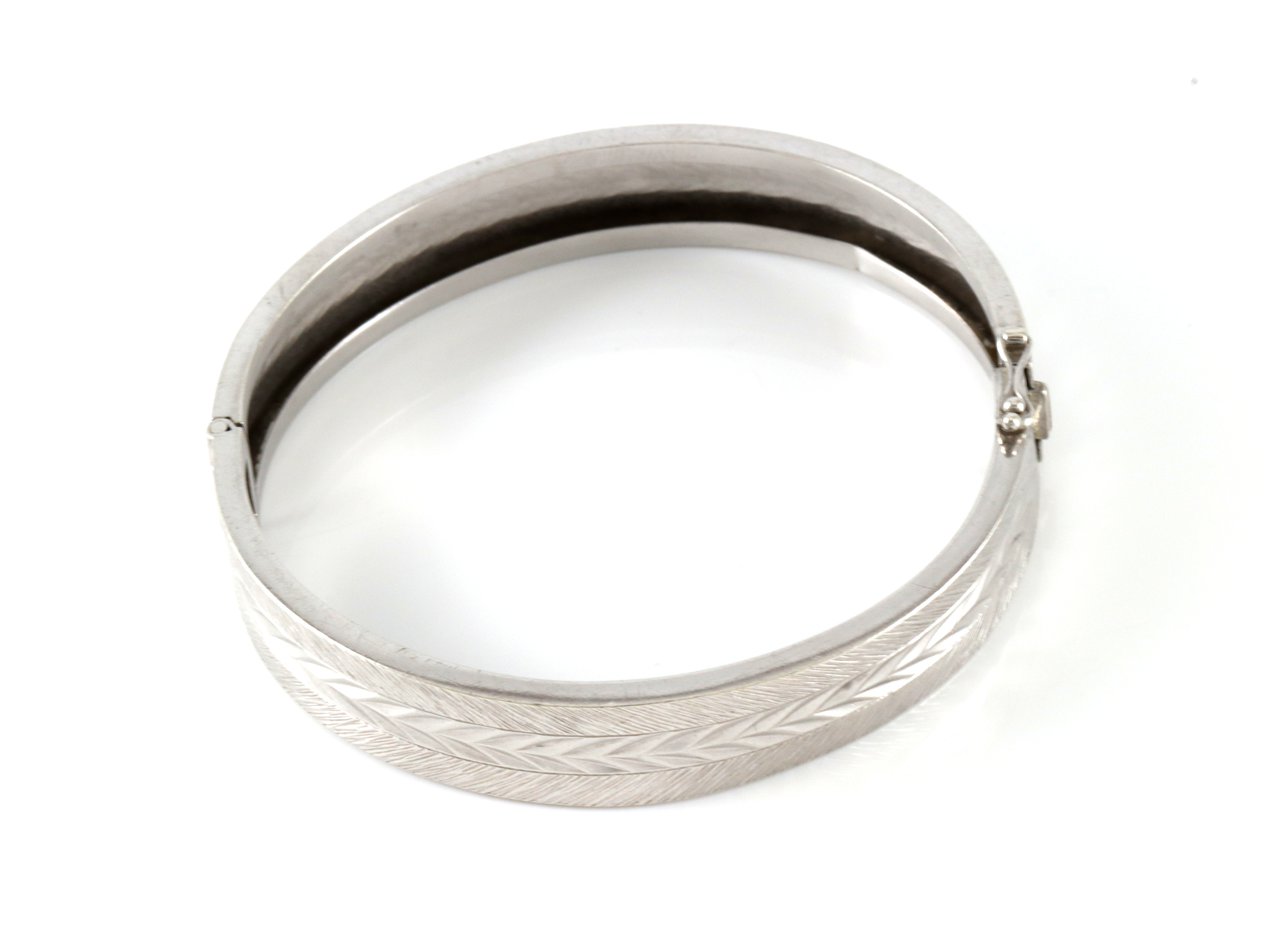 Armring i sølv. Delvis med "børstet mønster". Mulig å åpne med lås. 6,1 cm innvendig