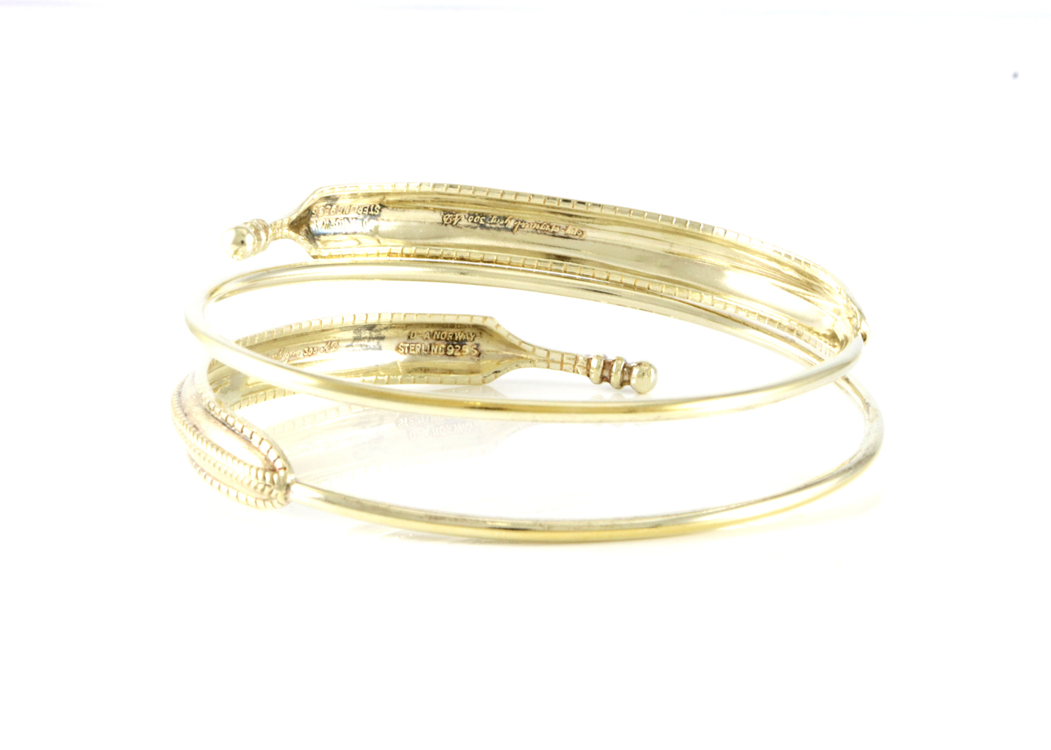 Uvanlig forgylt armring fra Saga-serien til David-Andersen. Første gang vi ser denne forgylt. Noe urund fra justering, vanlig for denne typen. Ca 7,0 cm bred innvendig.