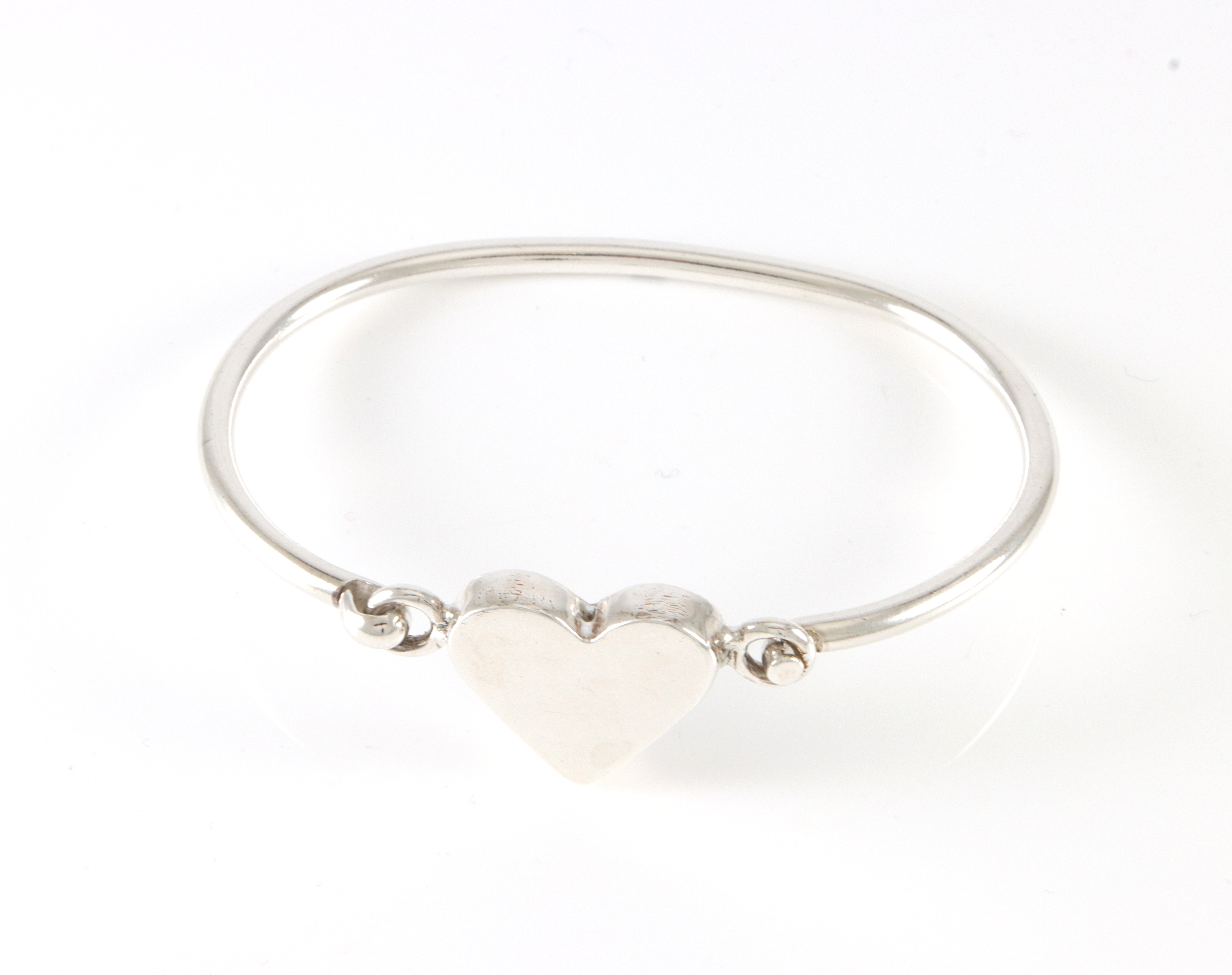 Armring i sølv, hjerte på toppen. Åpnes fra toppen Invendig mål: 6,5 x 4,7 cm