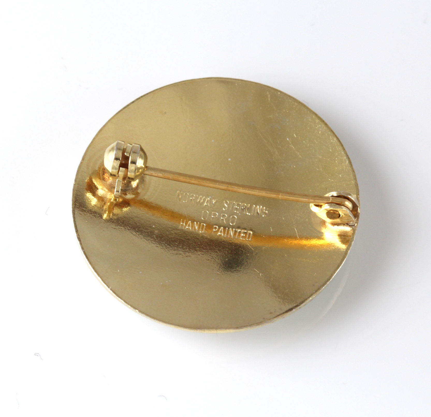 Håndmalt brosje fra Opro. Forgyldt sølv, hvit emalje med rosemotiv.
