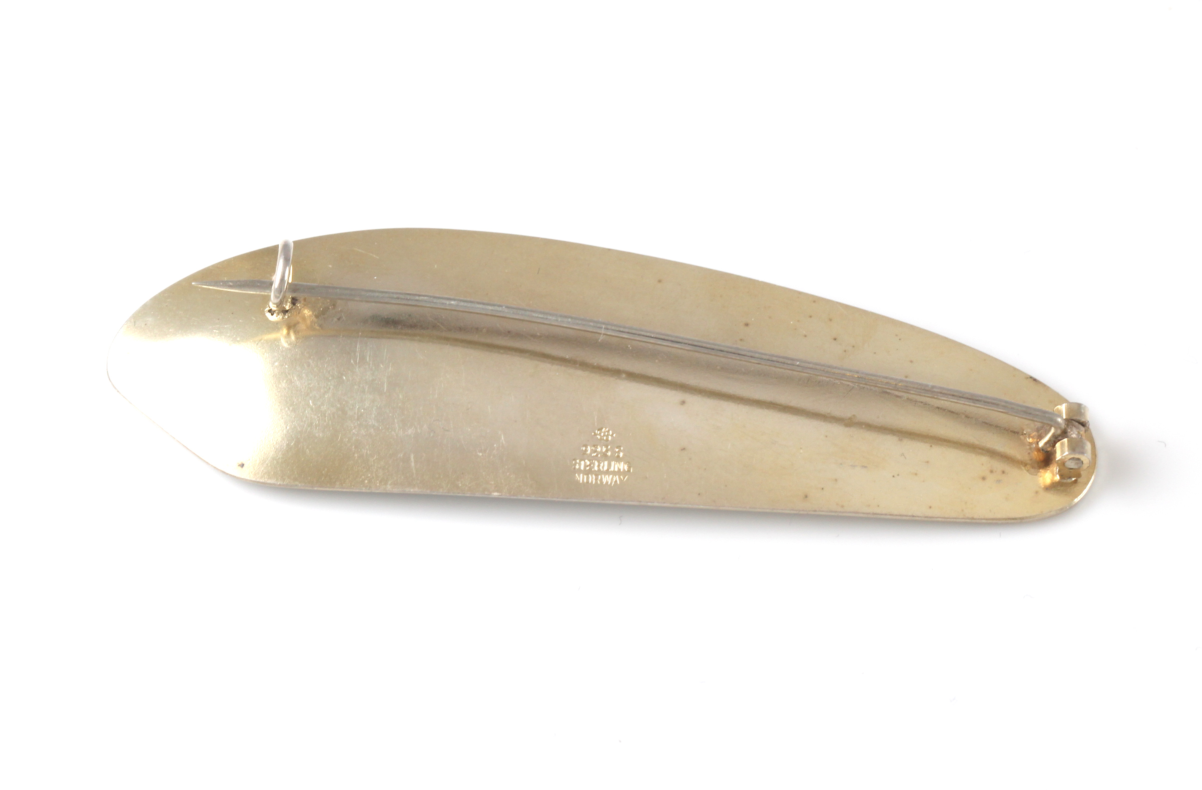 Morsom brosje med emaljert hjortedyr. Produsert av Hjortdahl. 7,0 x 2,0 cm Ørliten svart flekk fra produksjon i det hvite.