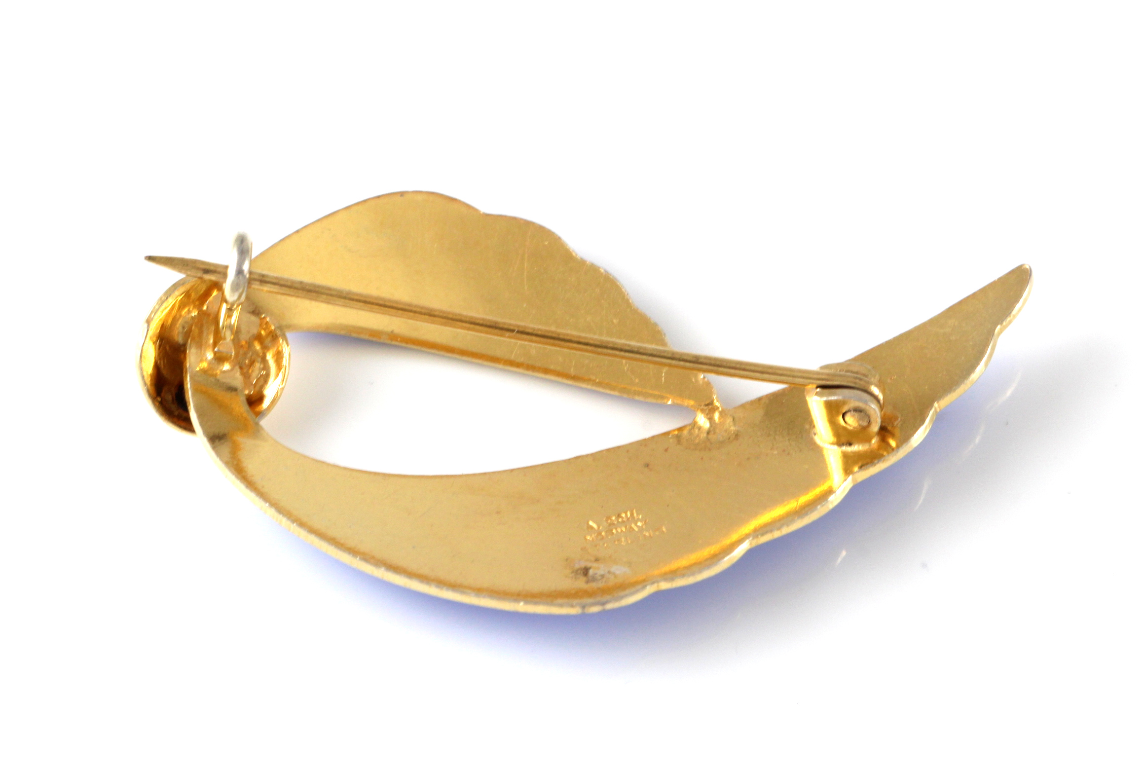 Emaljert brosje i forgyldt sølv og blå emalje. Produsert av Albert Scharning. 4,7 x 2,7 cm