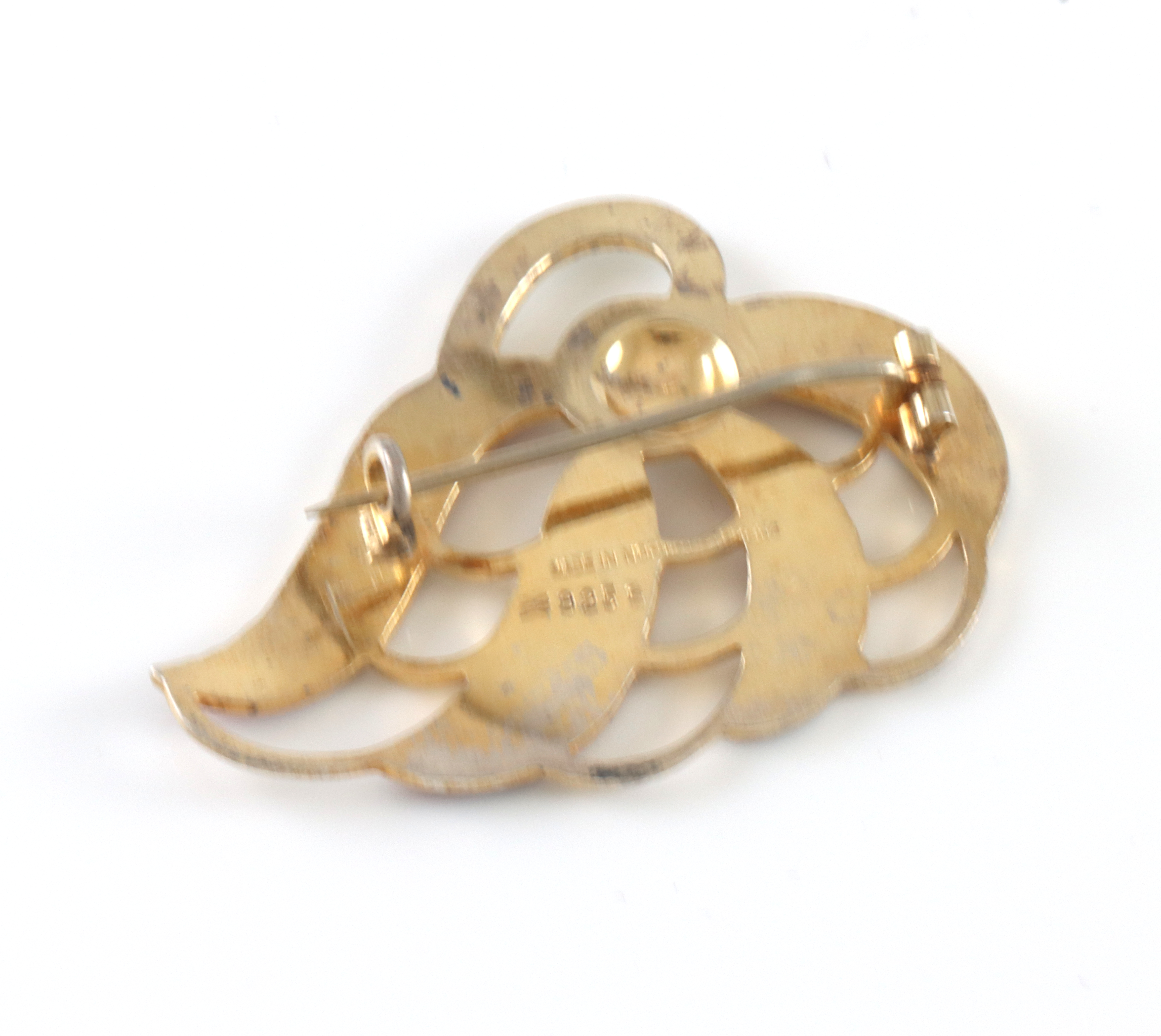 Fantastisk flott brosje i forgyldt sølv med hvit og rød emalje. Produsert av Aksel Holmsen 4,4 x 3,1 cm