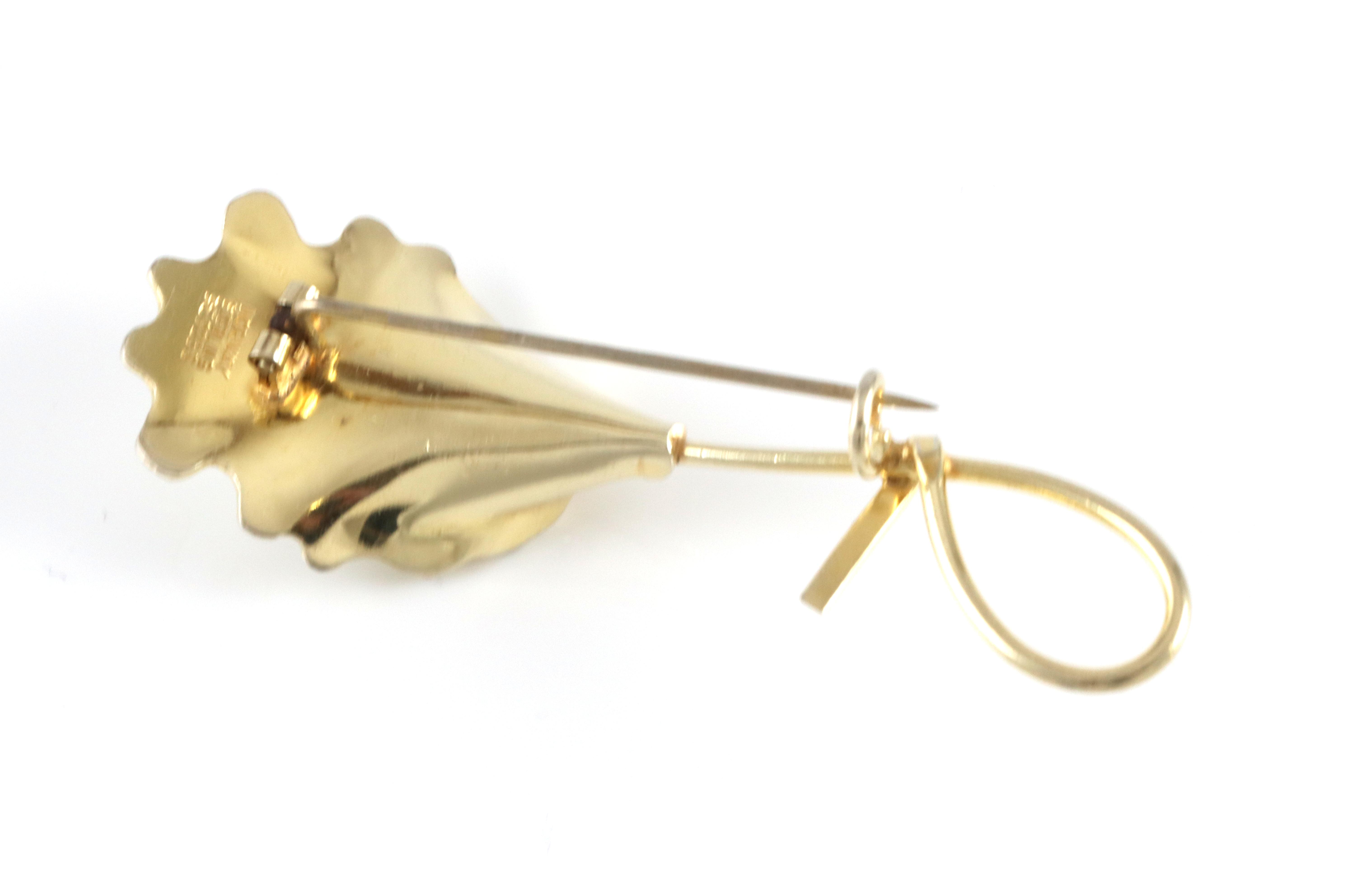 Brosje i forgyldt sølv og hvit emalje. Produsert av Aksel Holmsen 6,2 x 1,7 cm