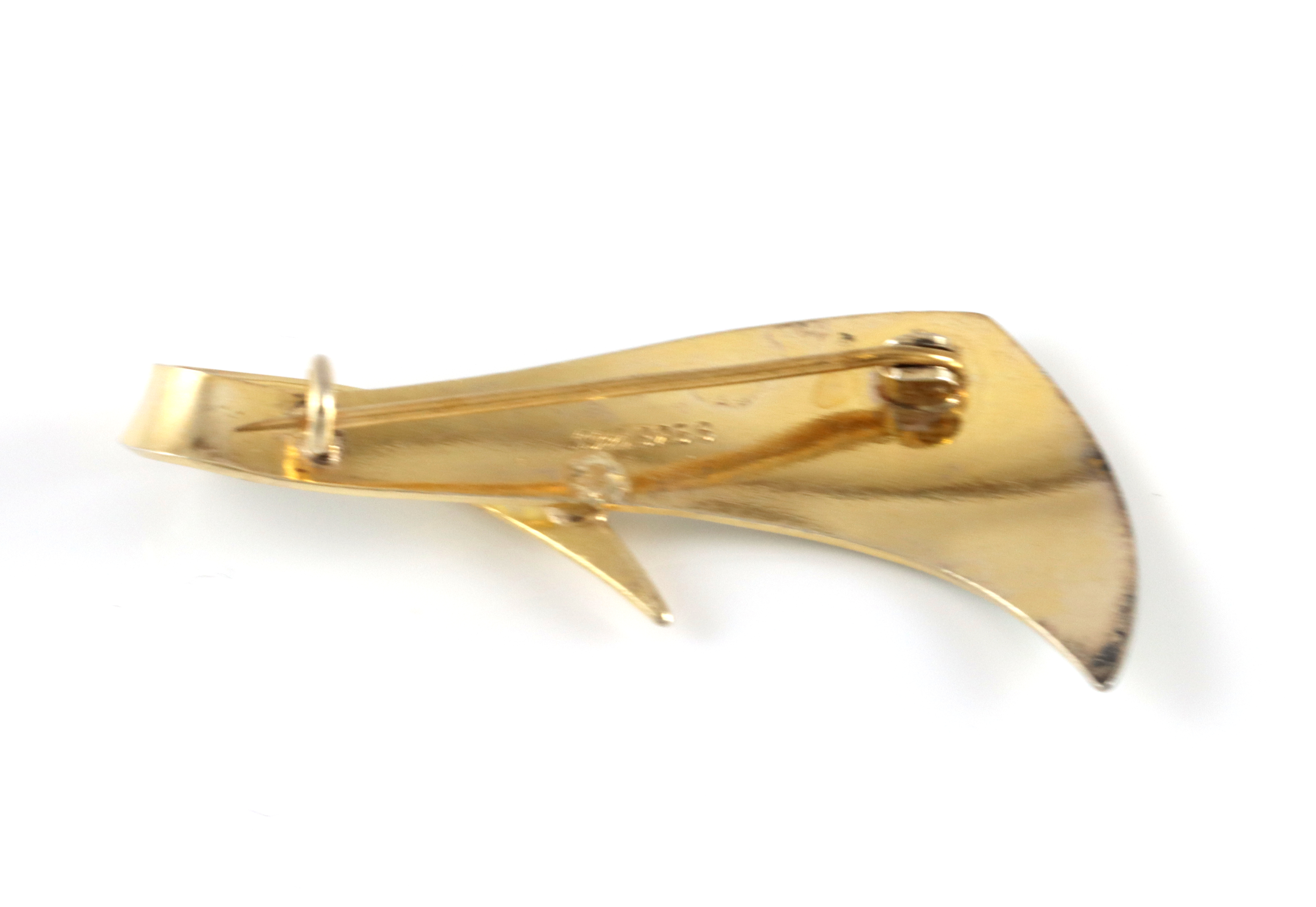 Brosje i forgyldt sølv med hvit emalje. Produsert av Albert Scharning. 5,3 x 2,0 cm