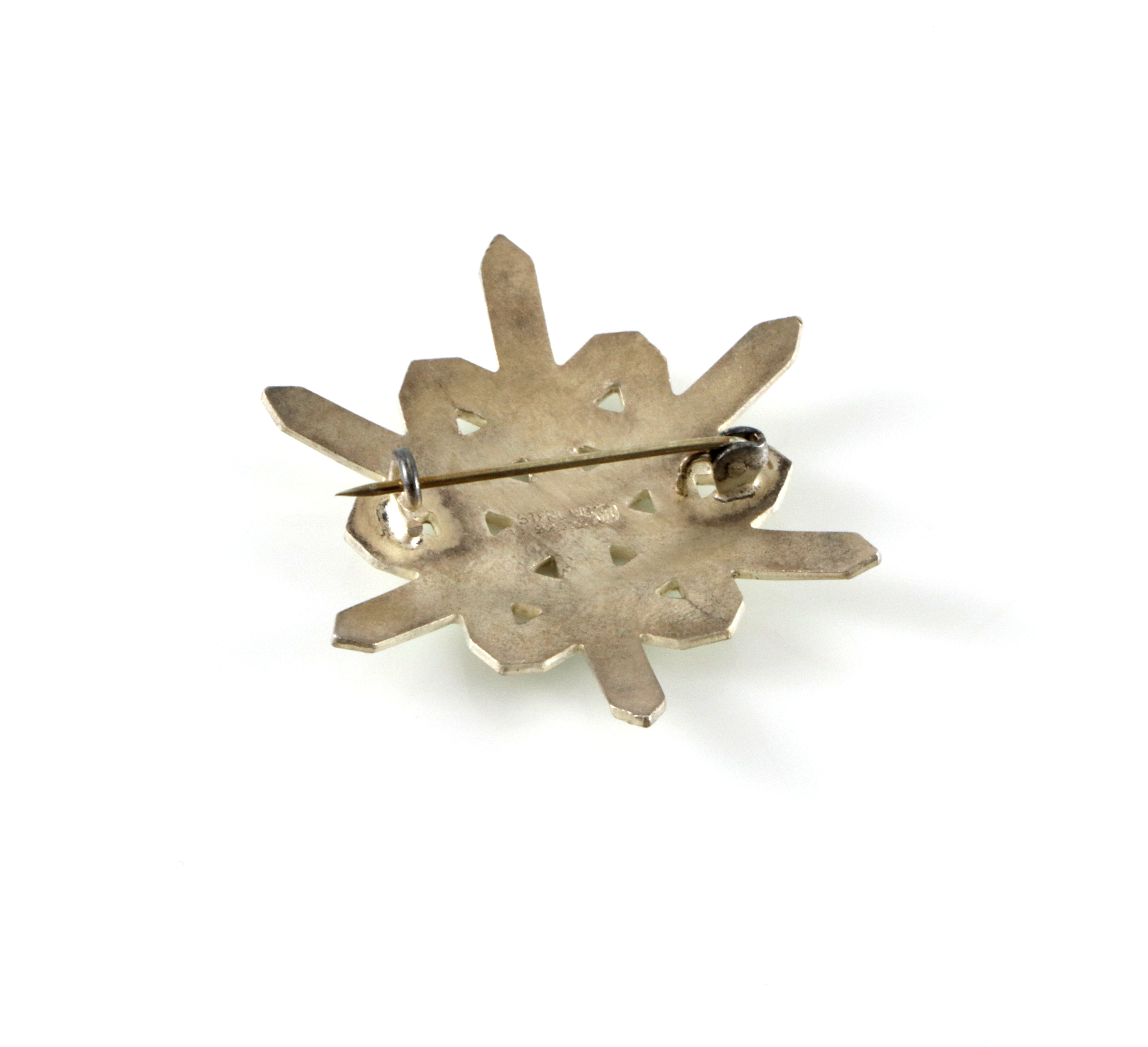 Ikonisk snøkrystallbrosje produsert av Ivar T. Holth. Brosje i lett forgyldt sølv med hvit emalje. 4,2 x 4,2 cm