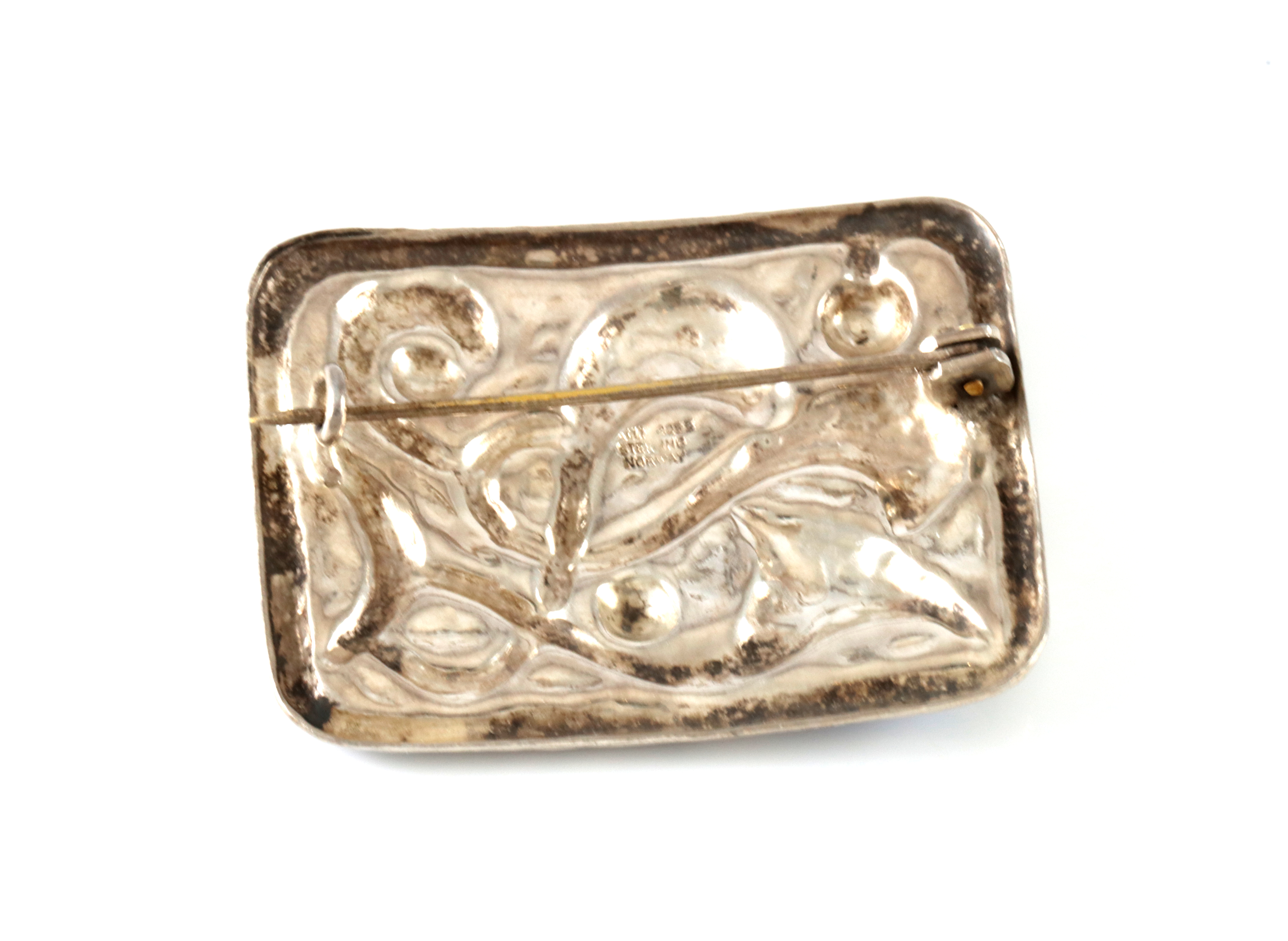 Brosje i sølv og flerfarget emalje. Kunstverk av en brosje Produsert av Balle. 4,4 x 3,4 cm
