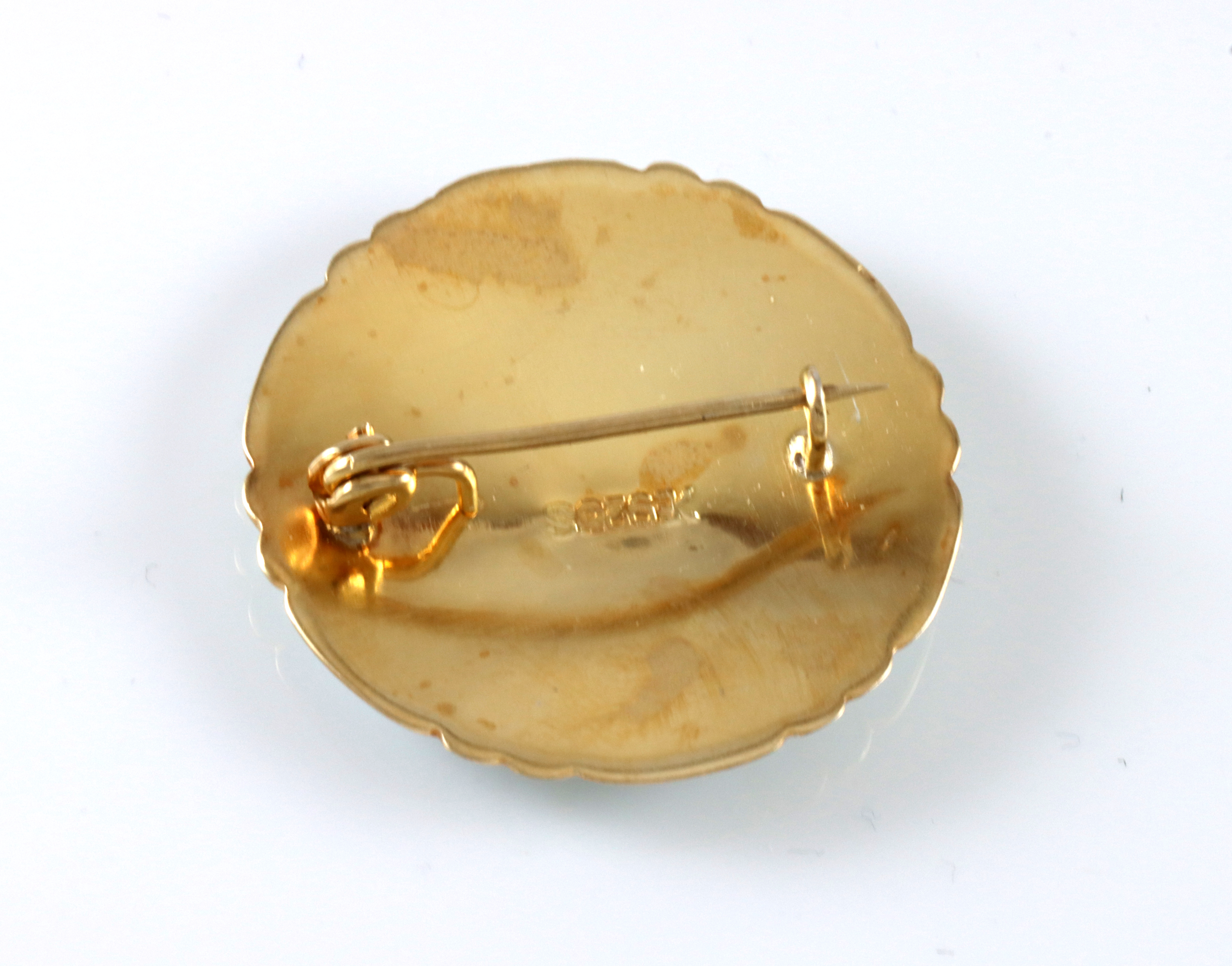 Brosje i forgyldt sølv og emalje. Brosjen har rosemotiv, ukjent produsent. 2,9 x 2,9 cm