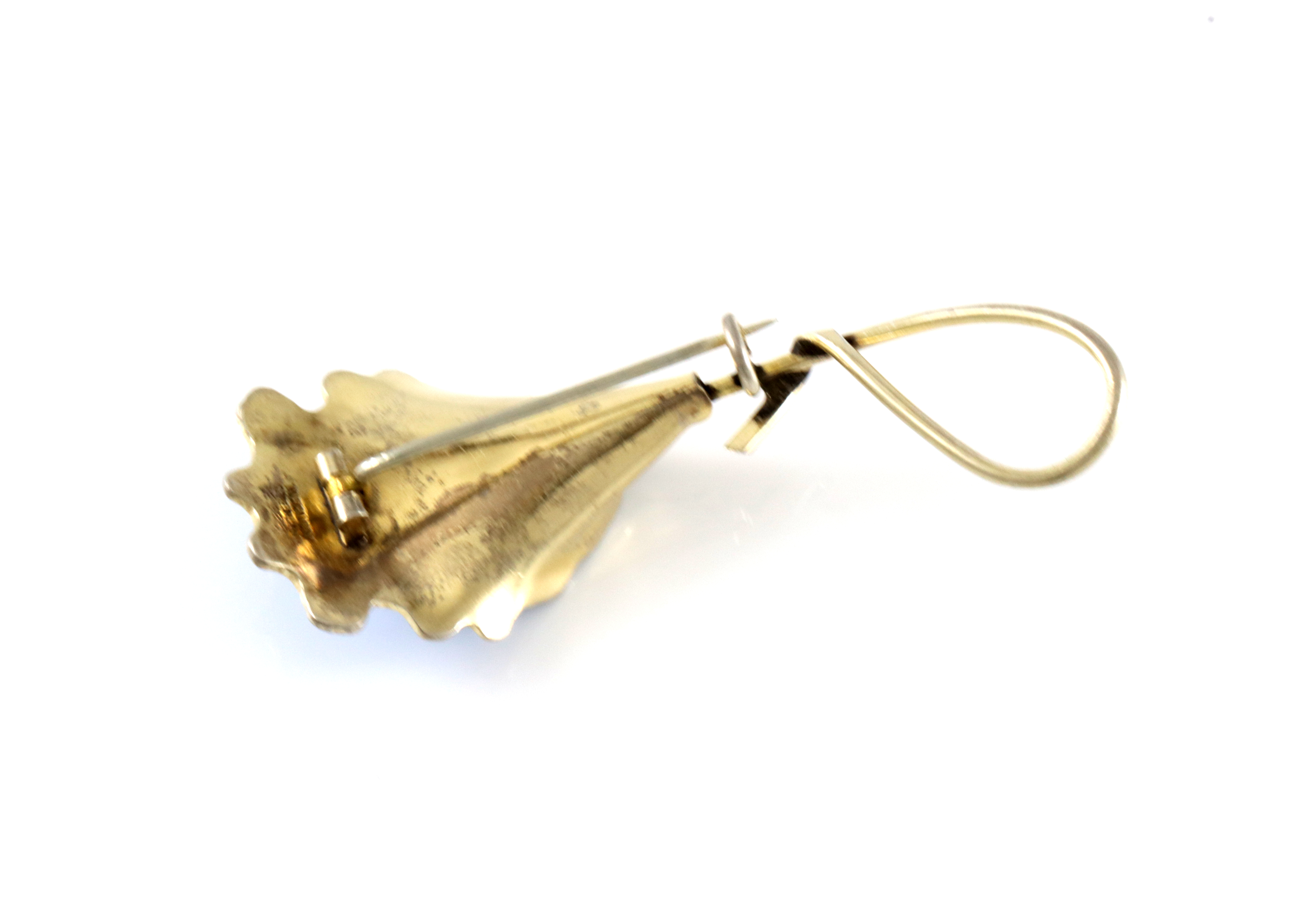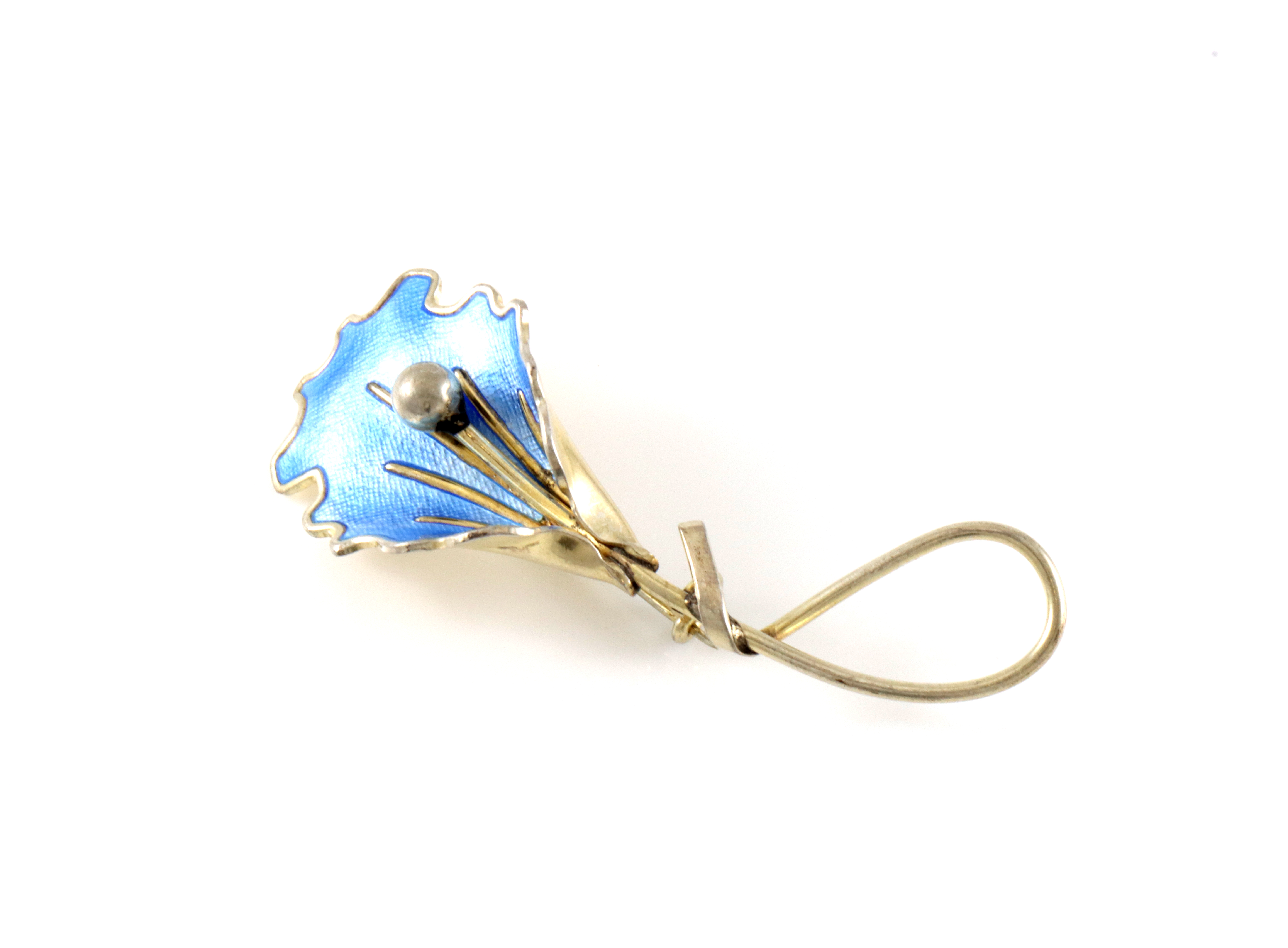 Brosje i forgylt sølv med lys blå emalje. Produsert av Aksel Holmsen. 6,2 x 1,7 cm