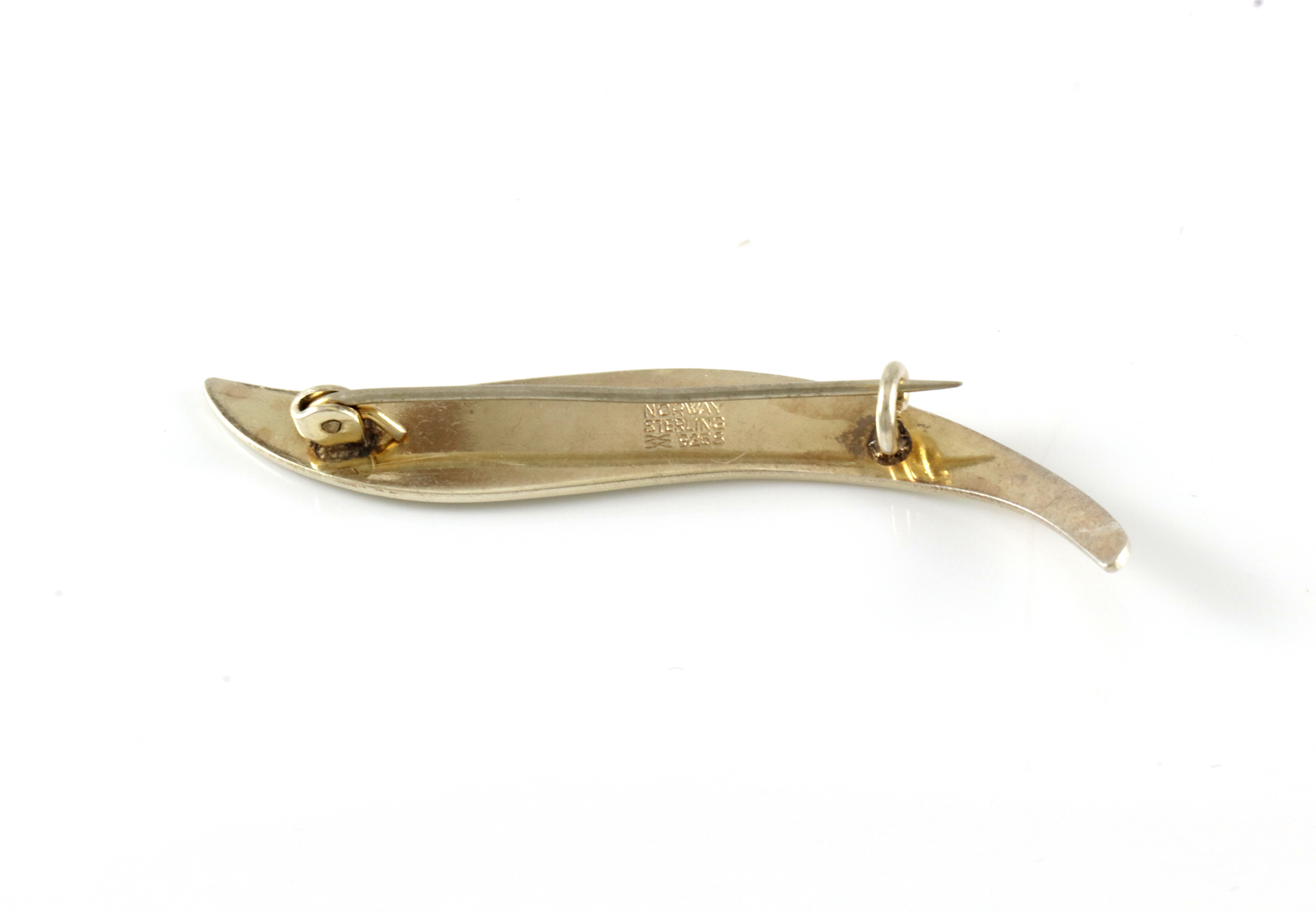 Brosje i forgylt sølv med hvit emalje. Produsert av Aksel Holmsen: 6,3 x 0,8 cm
