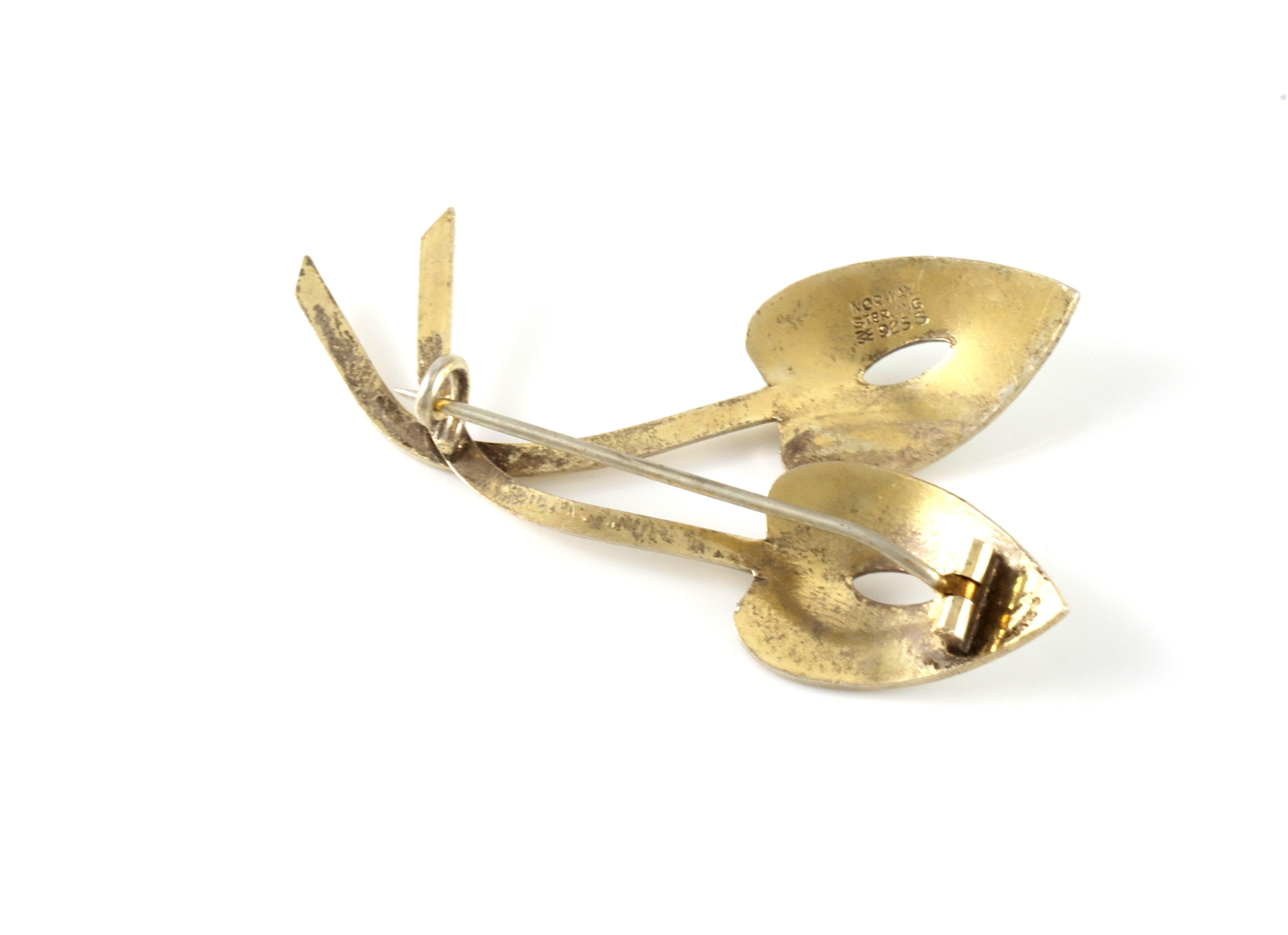 Brosje i forgylt sølv med hvit emalje. Produsert av Aksel Holmsen Noe misfarging i forgylningen bak(Ikke synlig under bruk) 5,6 x 2,8 cm