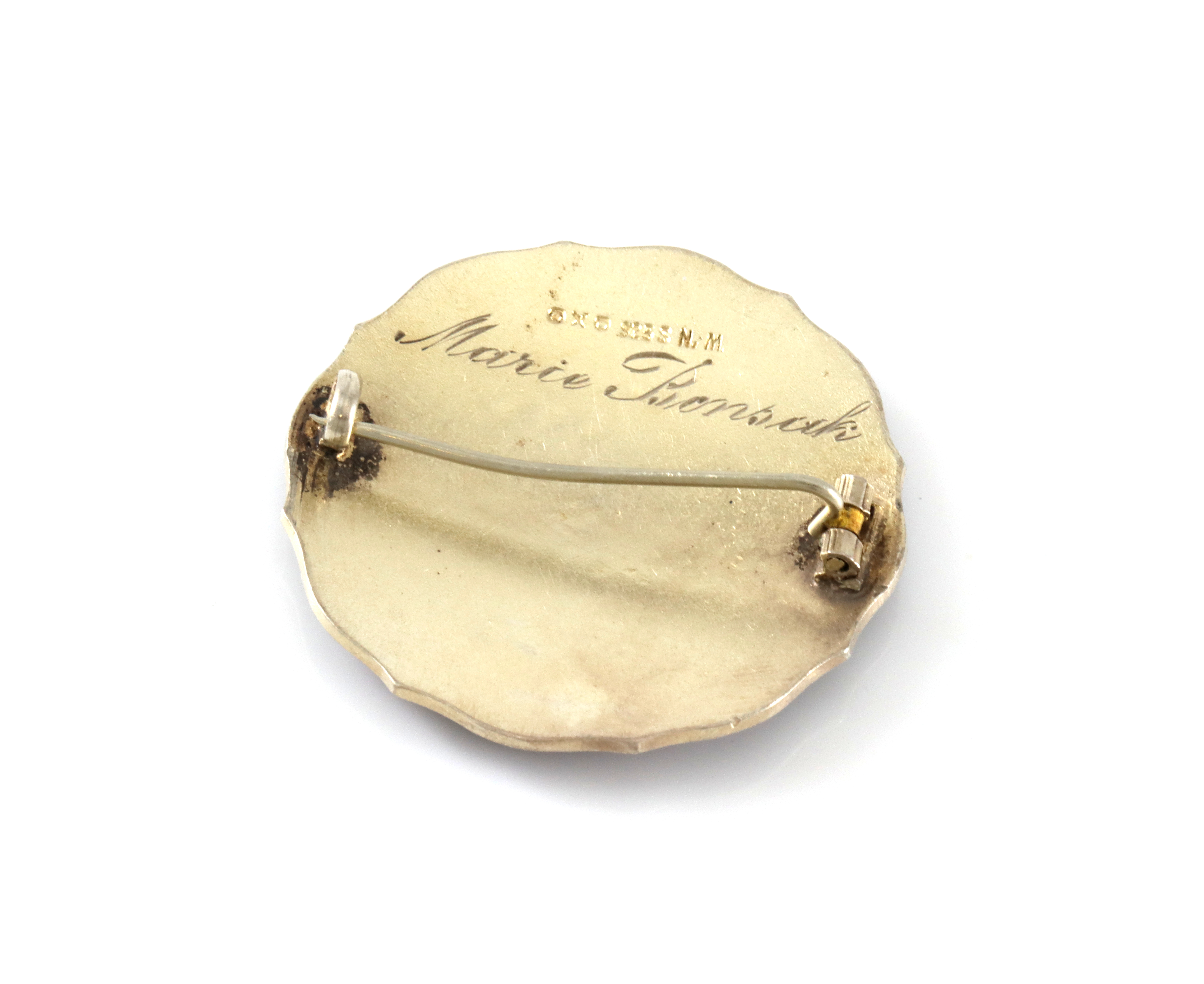 Spesiell brosje i forgylt sølv med rød og svart emalje. En fantastisk flott laget brosje med farger som popper ut. Denne er stemplet OXO, men denne er mistenkelig lik David-Andersen sitt arbeid i både utførelse og stempling bak. Trolig lagd for videresalg av OXO. 3,9 x 3,9 cm Fargene gjør at bruksripene er ganske synlige og den har et navn inngravert på baksiden.
