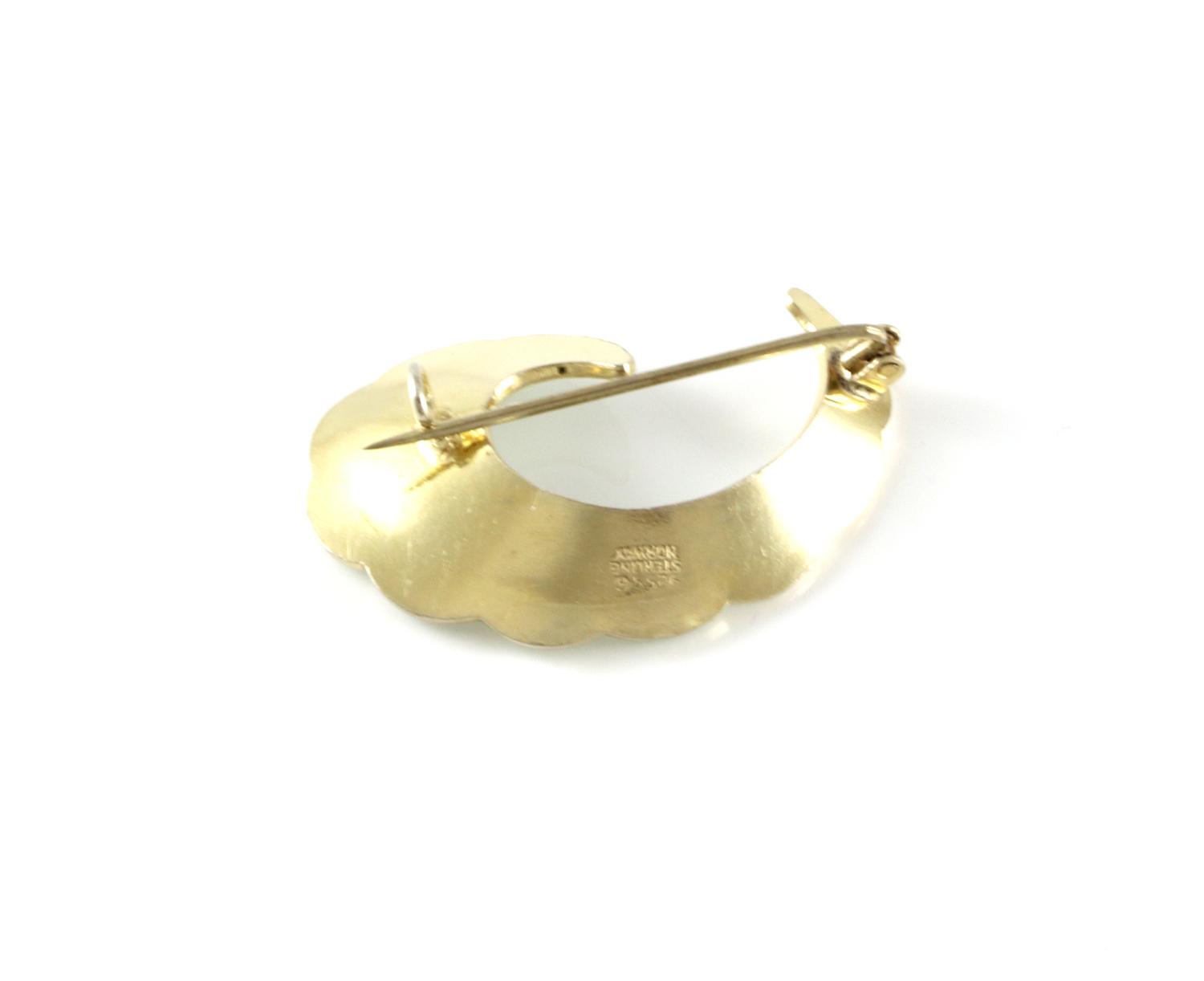 Brosje i forgylt sølv med hvit emalje. Produsert av Ivar T Holth. 3,9 x 2,4 cm