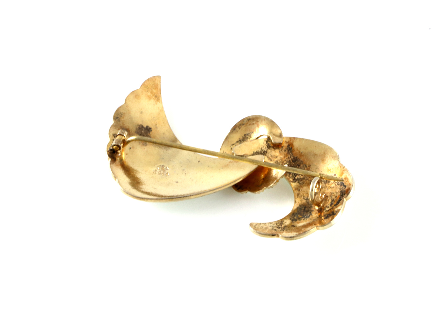 Brosje i forgylt sølv med hvit emalje. Produsert av Nils Elvik. 5,4 x 3,1 cm