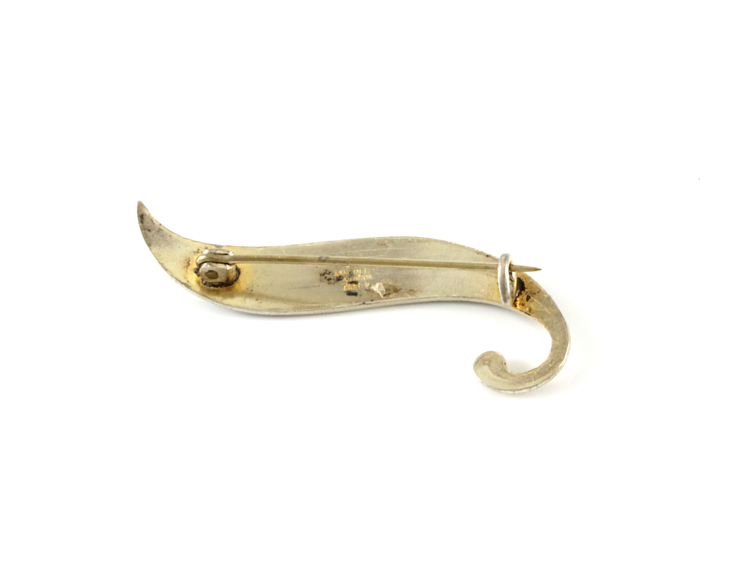 Brosje i sølv med hvit og svart emalje. Produsert av Albert Scharning. 5,2 x 1,2 cm