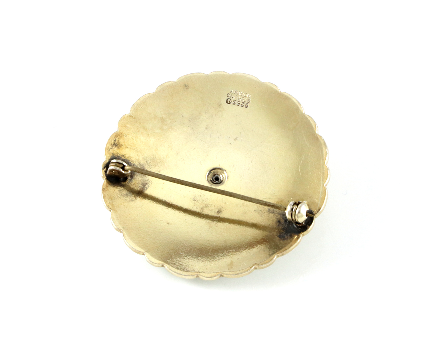 Brosje i forgylt sølv med hvit emalje og filigrans. Produsert av Ivar T Holth. 4,2 x 4,2 cm