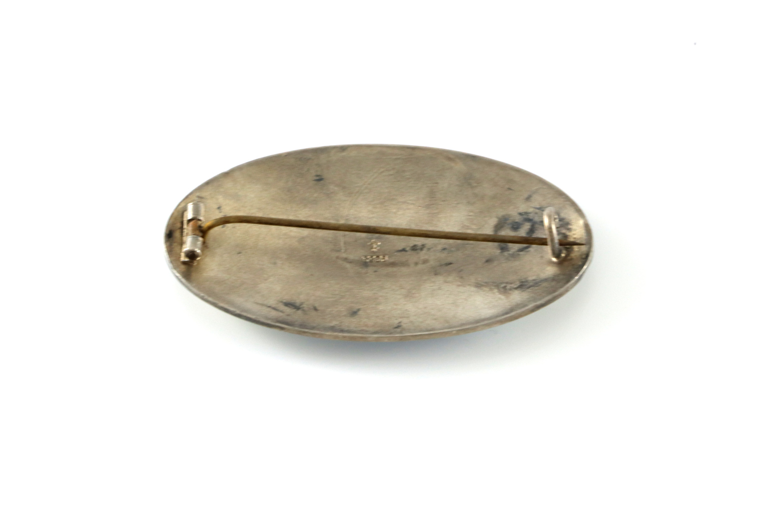 Brosje i sølv med håndmalt motiv. Flott håndmalt brosje med motiv av måker. Brosjen har dessverre mye riper og et par avslag i emaljen. Sekundær nål og noe oksidert forgylning. 5,6 x 3,0 cm