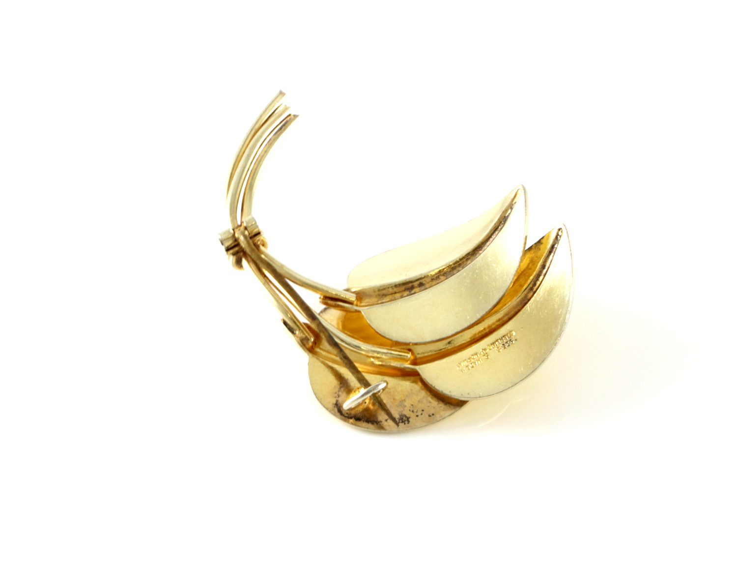 Brosje i forgylt sølv med gul emalje. Produsert av Hans Myhre. 5,2 x 3,7 cm