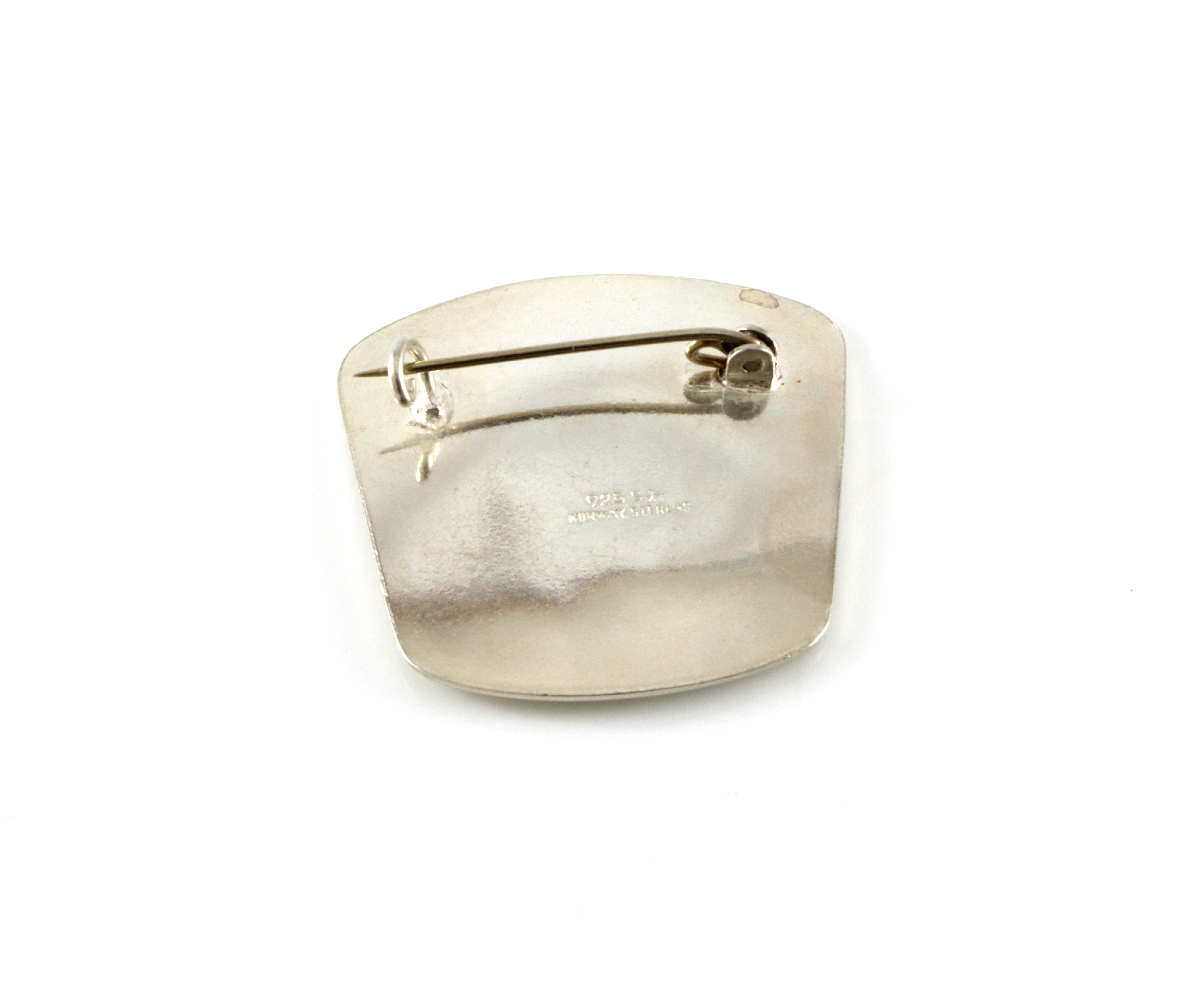 Brosje i sølv og hvit emalje. Produsert av K.A Rasmussen 4,0 x 3,5 cm