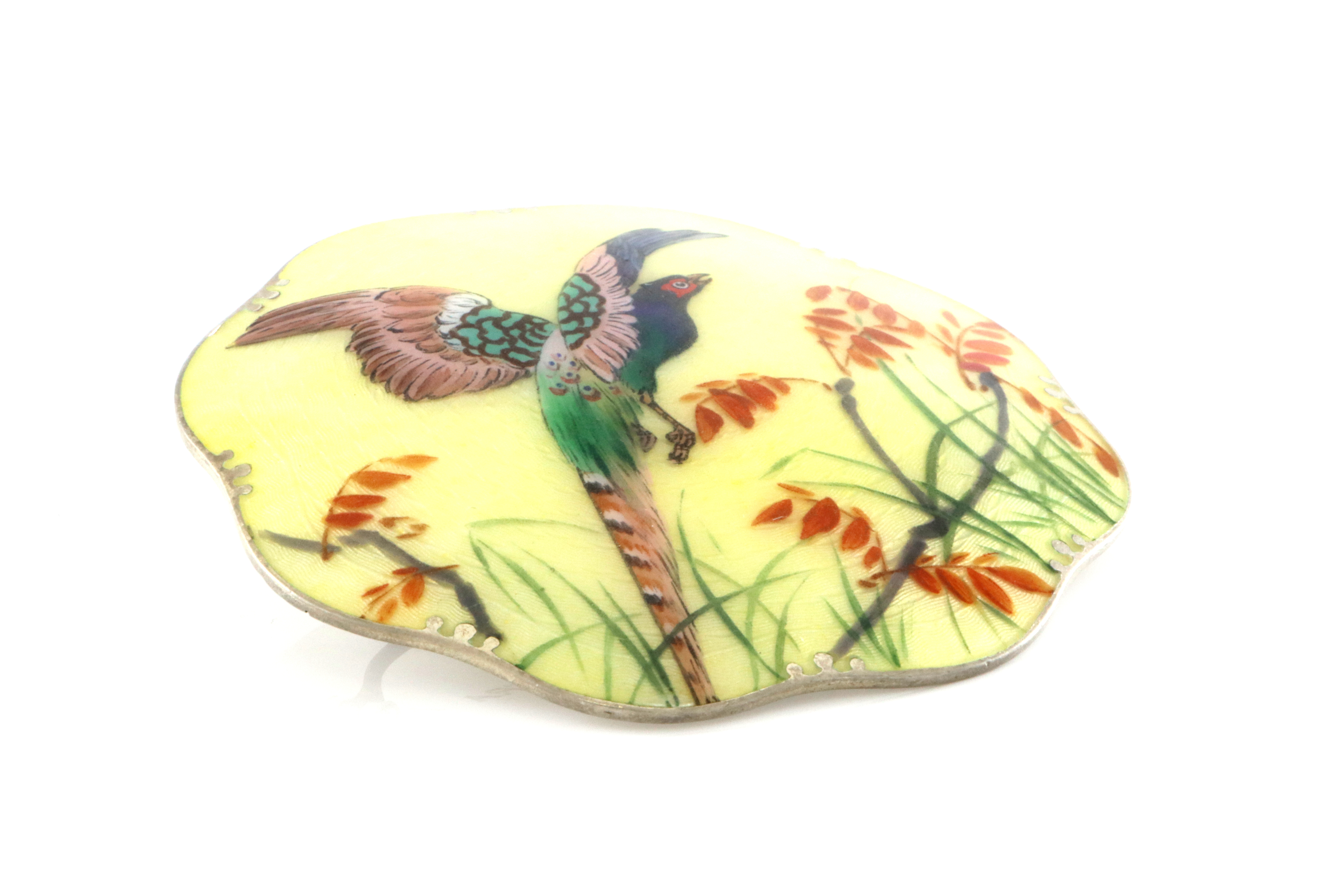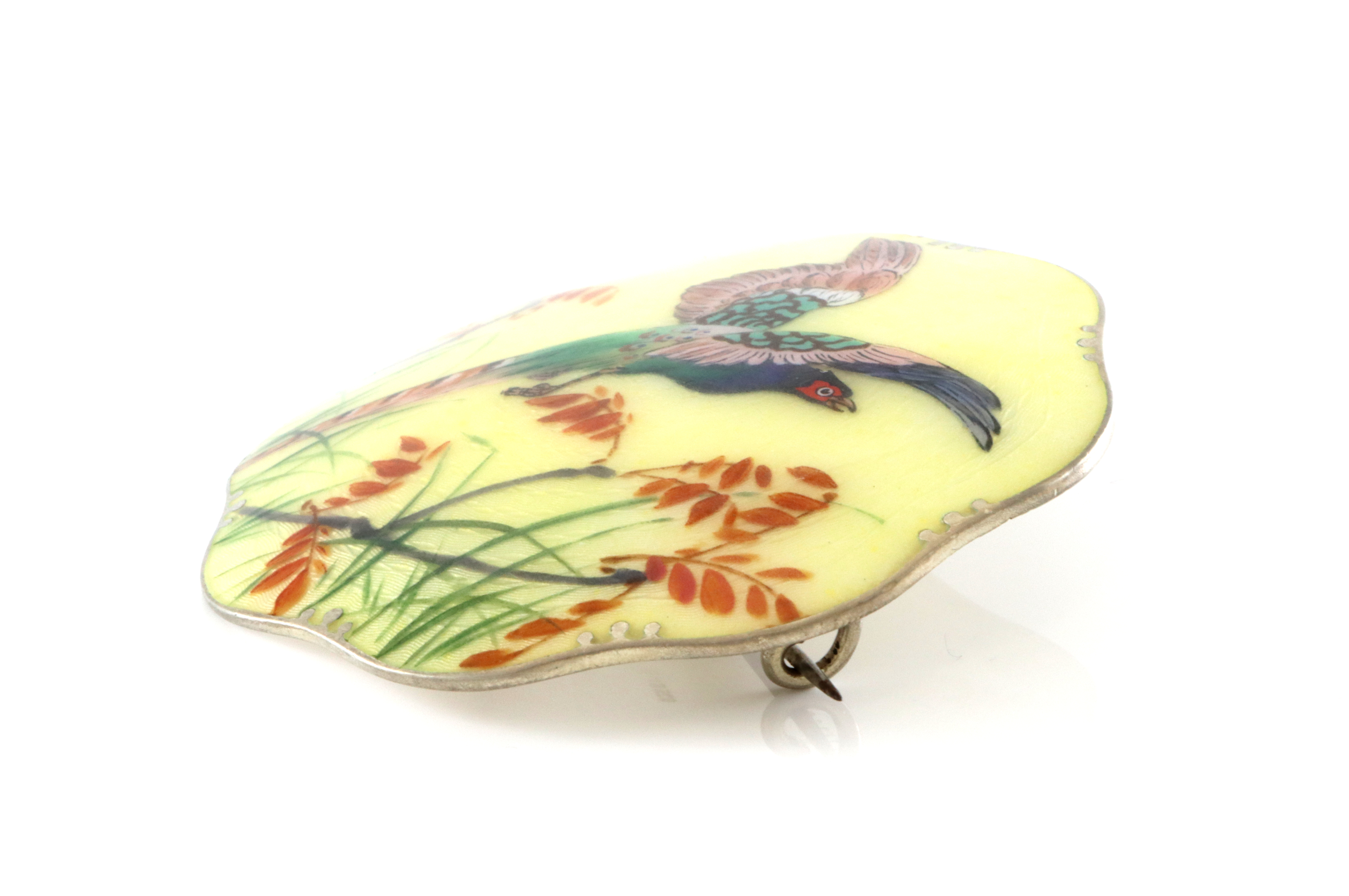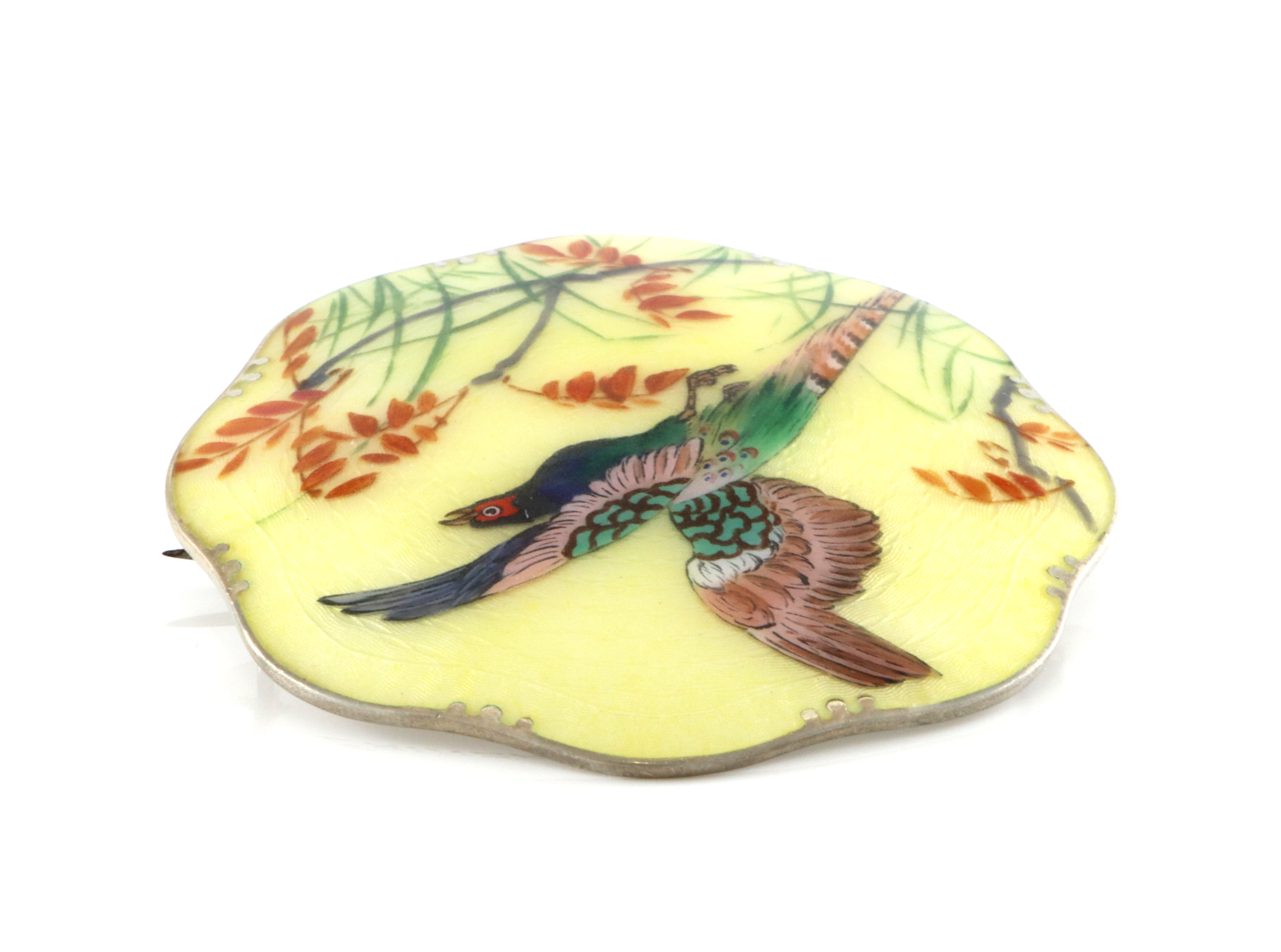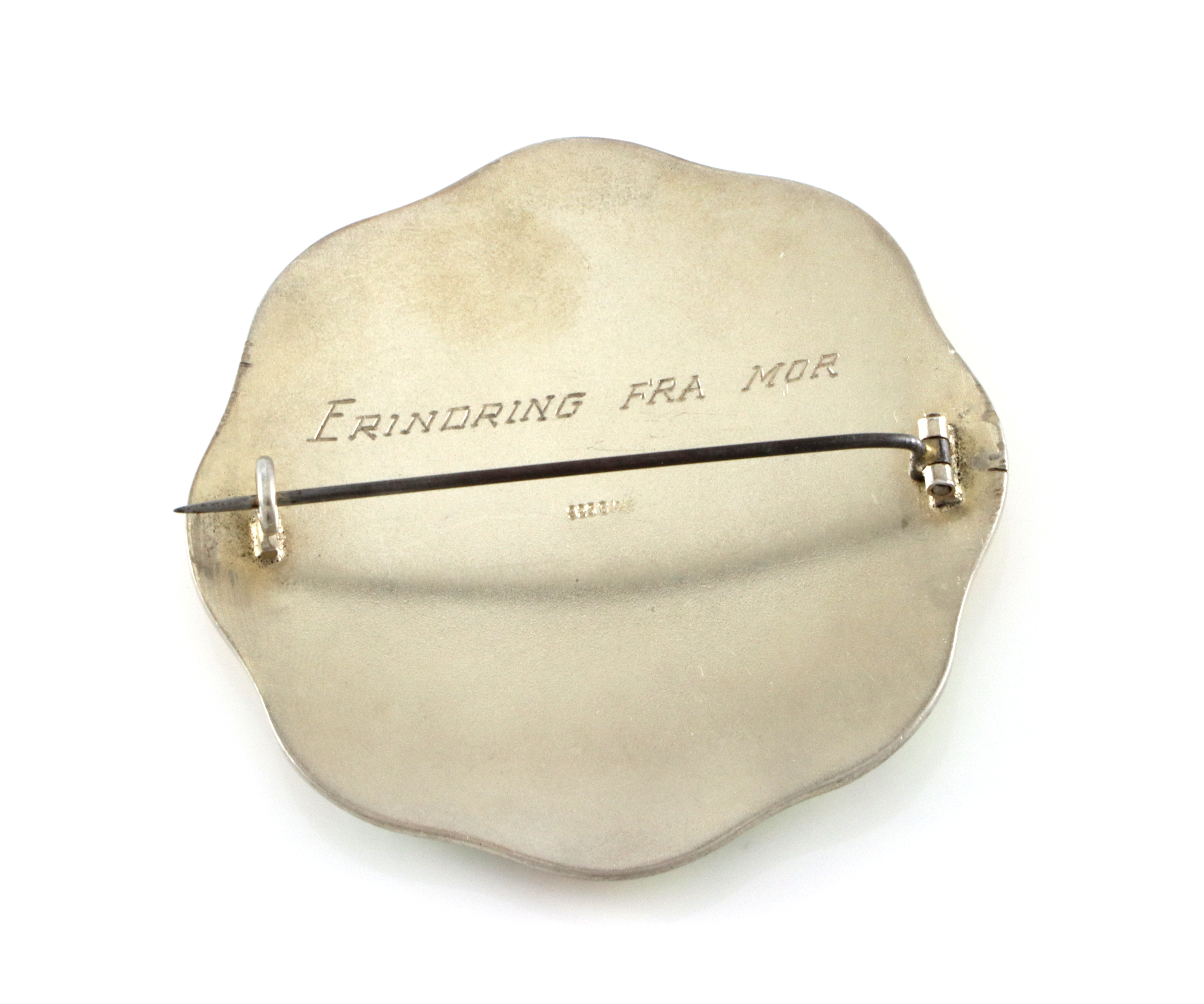Nydelig malt brosje fra Gustav Gaudernack. Stemplet med det gamle David-Andersen stempelet (Ikke G.G) Diameter: 65 mm Den har et lite avslag helt ute i kanten og overflateriper. Gravert "Erindring fra mor" på baksiden